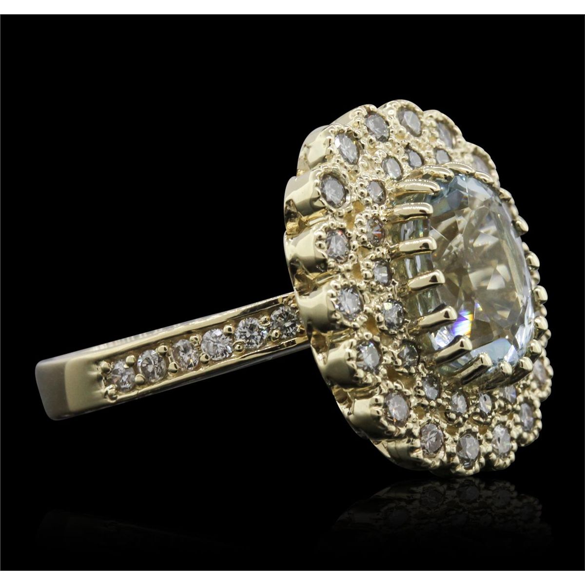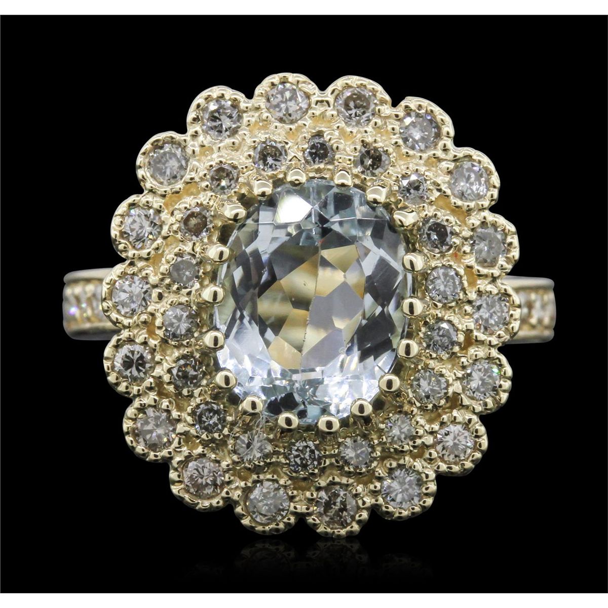 One electronically tested 14KT yellow gold ladies cast aquamarine and diamond ring. Condition is new, good workmanship. The featured aquamarine is set within a two tiered diamond lattice gallery, supported by diamond set shoulders and completed by a three millimeter wide band. Identified with markings of "K14". Containing: One prong set oval mixed cut natural aquamarine, measuring 9.80 x 7.80 x 5.00mm, 8%. bulge factor, approximate weight of 2.27ct., clarity is eye clean, type I, medium light, very slightly grayish, blue color, (GIA B 4/3), cut is good. Transmitting light with no distortion, transparent. Refractive index testing results of 1.56 to 1.57. This is a conclusive result for Aquamarine (Beryl). Graded in the setting. Forty-Eight bead & bezel set round brilliant cut diamonds, measuring 1.70 - 1.50 x 0.96mm (depth est.) approximate. Total Weight of 48 Stones = 0.81ct. Graded in the setting. Clarity: SI-2 to I-2. Color: G - I. Total Weight of Colored Stones 2.27ct. Total Weight of Diamonds 0.81ct. Total Weight of Ring 7.70 grams. AIG Appraised at $4,565.00.