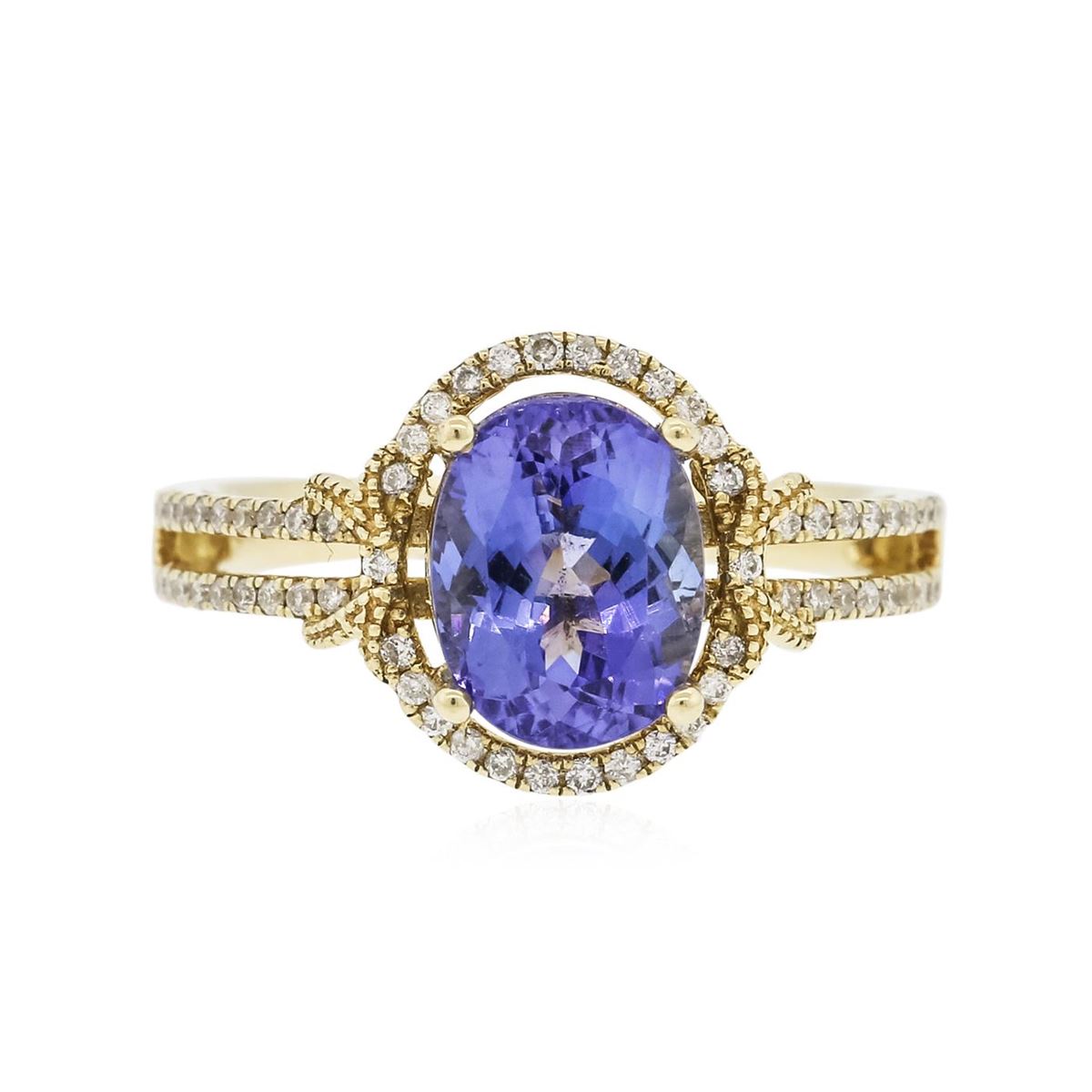 One electronically tested 14KT yellow gold ladies combination cast & assembled ring with a bright polish finish. Condition is new. Identified with markings of "14K". Containing: One prong set oval modified brilliant cut natural tanzanite, measuring 9.00 x 7.00 x 5.35mm, approximate weight of 2.29ct., clarity is eye clean, type I, medium light, very slightly grayish, violet color, (GIA V 4/3), cut is good. Sixty-Six prong set round brilliant cut diamonds, measuring 1.00 - 1.00 x 0.60mm (depth est.) approximate total weight of 66 Stones = 0.24ct. Clarity: I-1 to I-2. Color: I - J, Cut is Good. Colored gemstones are presumed to have been subjected to commonly used enhancement processes. All diamonds and colored gemstones are graded in the mounting, unless otherwise stated. Total Weight of Colored Stones 2.29ct. Total Weight of Diamonds 0.24ct. Total Weight of Ring 3.60 grams. GGL Appraised at $4,815.00.