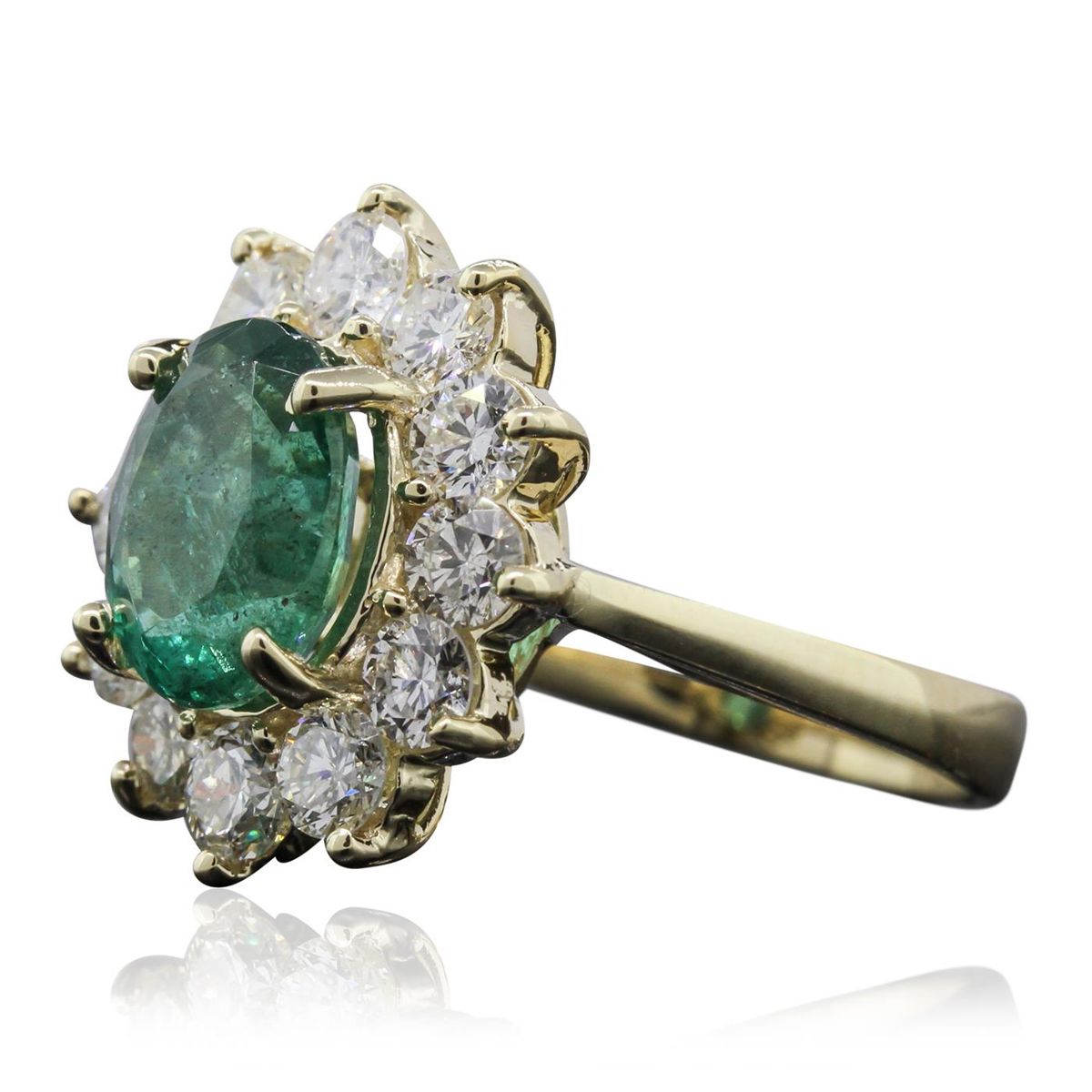 Great Condition! One electronically tested 14KT yellow gold Ladies combination cast & assembled ring with a bright polish finish. Condition is new. Identified with markings of "14K". Containing: One prong set oval modified mixed cut natural emerald, measuring 9.80 x 7.70 x 5.20mm, approximate weight of 2.29ct., clarity is moderately included, type III, medium light, very slightly grayish, very slightly bluish green color, (GIA vslbG 4/3), cut is good. Colored gemstones are presumed to have been subjected to commonly used and possible undetectable color/clarity enhancement processes. Twelve prong set round brilliant cut diamonds, measuring 3.40 - 3.40 x 2.04mm (depth est.) approximate total weight of 12 Stones = 1.76ct. Clarity of I-1, Color of J - K, Cut is Good. Total Weight of Colored Stones 2.29ct. Total Weight of Diamonds 1.76ct. Total Weight of Ring 6.00 grams. GGL Appraised at $9,620.00.