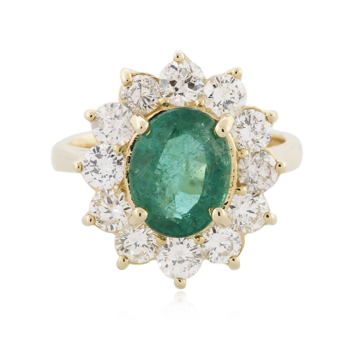 Great Condition! One electronically tested 14KT yellow gold Ladies combination cast & assembled ring with a bright polish finish. Condition is new. Identified with markings of "14K". Containing: One prong set oval modified mixed cut natural emerald, measuring 9.80 x 7.70 x 5.20mm, approximate weight of 2.29ct., clarity is moderately included, type III, medium light, very slightly grayish, very slightly bluish green color, (GIA vslbG 4/3), cut is good. Colored gemstones are presumed to have been subjected to commonly used and possible undetectable color/clarity enhancement processes. Twelve prong set round brilliant cut diamonds, measuring 3.40 - 3.40 x 2.04mm (depth est.) approximate total weight of 12 Stones = 1.76ct. Clarity of I-1, Color of J - K, Cut is Good. Total Weight of Colored Stones 2.29ct. Total Weight of Diamonds 1.76ct. Total Weight of Ring 6.00 grams. GGL Appraised at $9,620.00.
