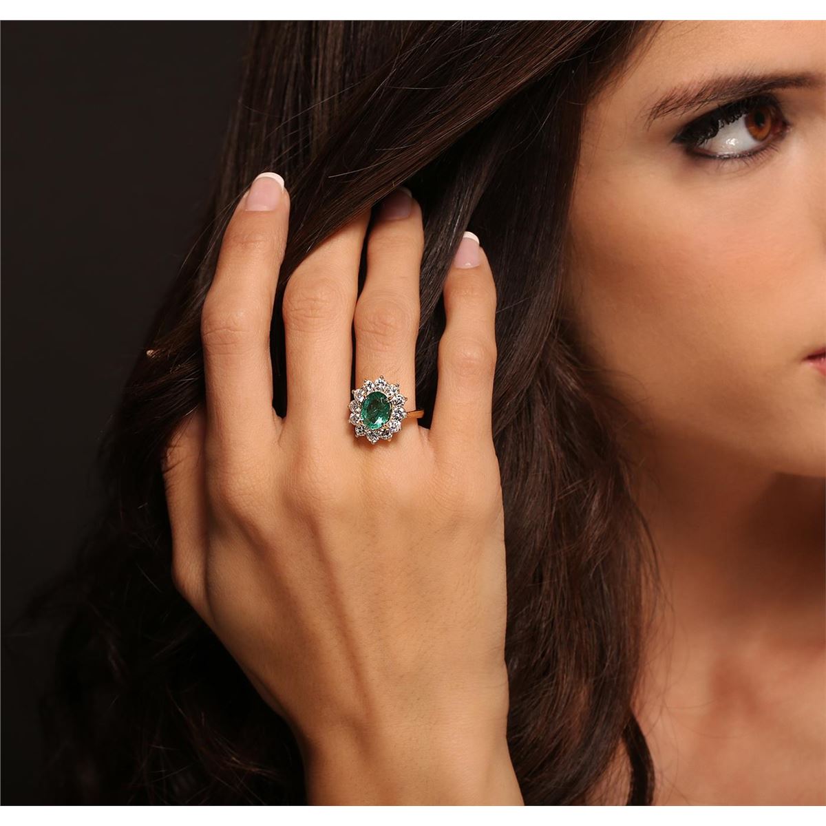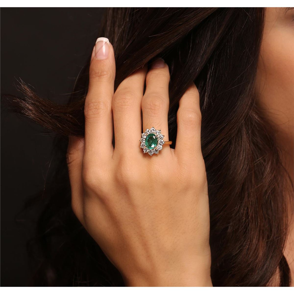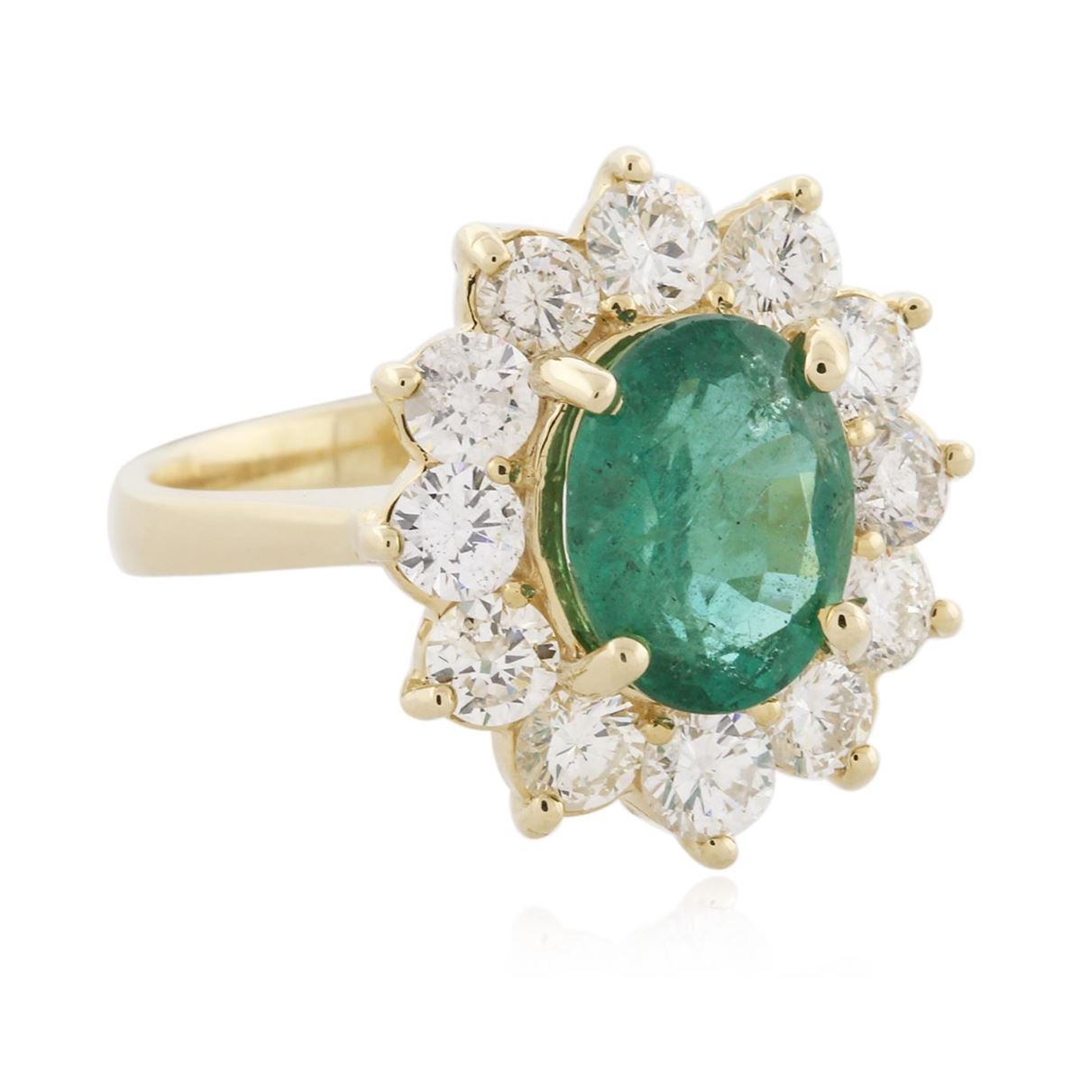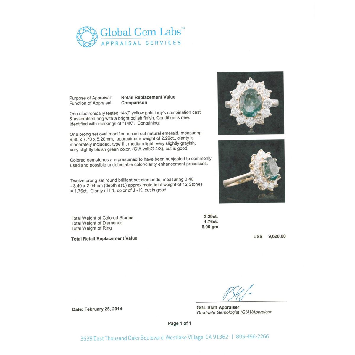 Great Condition! One electronically tested 14KT yellow gold Ladies combination cast & assembled ring with a bright polish finish. Condition is new. Identified with markings of "14K". Containing: One prong set oval modified mixed cut natural emerald, measuring 9.80 x 7.70 x 5.20mm, approximate weight of 2.29ct., clarity is moderately included, type III, medium light, very slightly grayish, very slightly bluish green color, (GIA vslbG 4/3), cut is good. Colored gemstones are presumed to have been subjected to commonly used and possible undetectable color/clarity enhancement processes. Twelve prong set round brilliant cut diamonds, measuring 3.40 - 3.40 x 2.04mm (depth est.) approximate total weight of 12 Stones = 1.76ct. Clarity of I-1, Color of J - K, Cut is Good. Total Weight of Colored Stones 2.29ct. Total Weight of Diamonds 1.76ct. Total Weight of Ring 6.00 grams. GGL Appraised at $9,620.00.