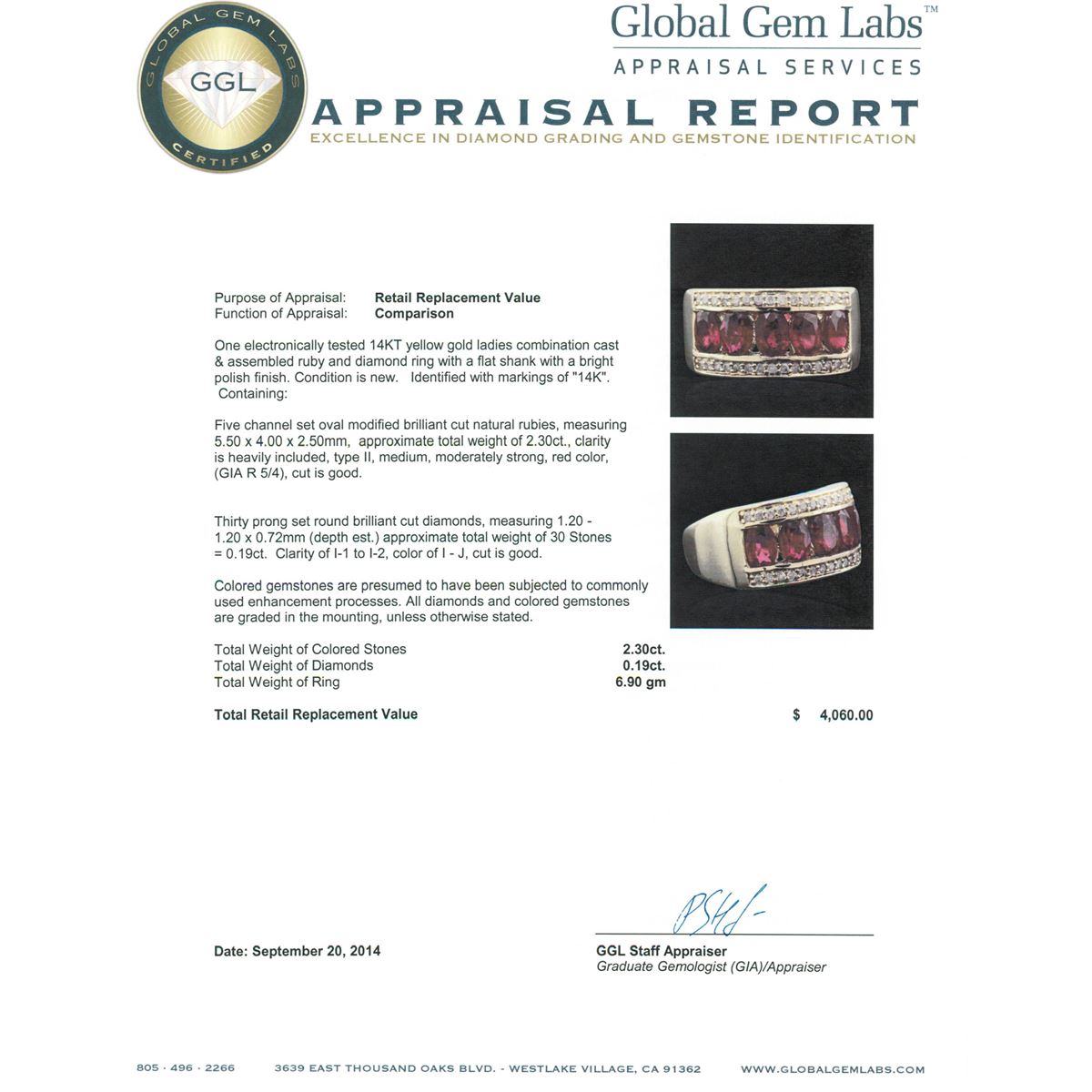 One electronically tested 14KT yellow gold ladies combination cast & assembled ruby and diamond ring with a flat shank with a bright polish finish. Identified with markings of "14K". Condition is new. Containing: Five channel set oval modified brilliant cut natural rubies, measuring 5.50 x 4.00 x 2.50mm, approximate total weight of 2.30ct., clarity is heavily included, type II, medium, moderately strong, red color, (GIA R 5/4), cut is good. Thirty prong set round brilliant cut diamonds, measuring 1.20 - 1.20 x 0.72mm (depth est.) approximate total weight of 30 Stones = 0.19ct. Clarity: I-1 to I-2. Color: I - J, Cut is Good. Colored gemstones are presumed to have been subjected to commonly used enhancement processes. All diamonds and colored gemstones are graded in the mounting, unless otherwise stated. Total Weight of Colored Stones 2.30ct. Total Weight of Diamonds 0.19ct. Total Weight of Ring 6.90 grams. GGL Appraised at $4,060.00.
