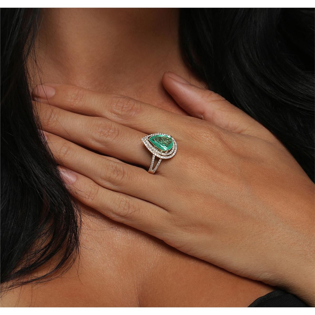 One electronically tested 14KT yellow gold ladies combination cast & assembled ring with a bright polish finish. Identified with markings of "14K". Condition is new. Containing: One prong set pear modified brilliant cut natural emerald, measuring 12.80 x 8.50 x 3.89mm, approximate weight of 2.30ct., clarity is moderately included, type III, medium light, very slightly grayish, very slightly bluish green color, (GIA vslbG 4/3), cut is good. One Hundred Four prong set round brilliant cut diamonds, measuring 1.00 - 1.00 x 0.60mm (depth est.) approximate total weight of 104 Stones = 0.37ct. Clarity: I-1 to I-2. Color: J - K, Cut is Good. Colored gemstones are presumed to have been subjected to commonly used enhancement processes. All diamonds and colored gemstones are graded in the mounting, unless otherwise stated. Total Weight of Colored Stones 2.30ct. Total Weight of Diamonds 0.37ct. Total Weight of Ring 6.10 grams. GGL Appraised at $7,320.00.