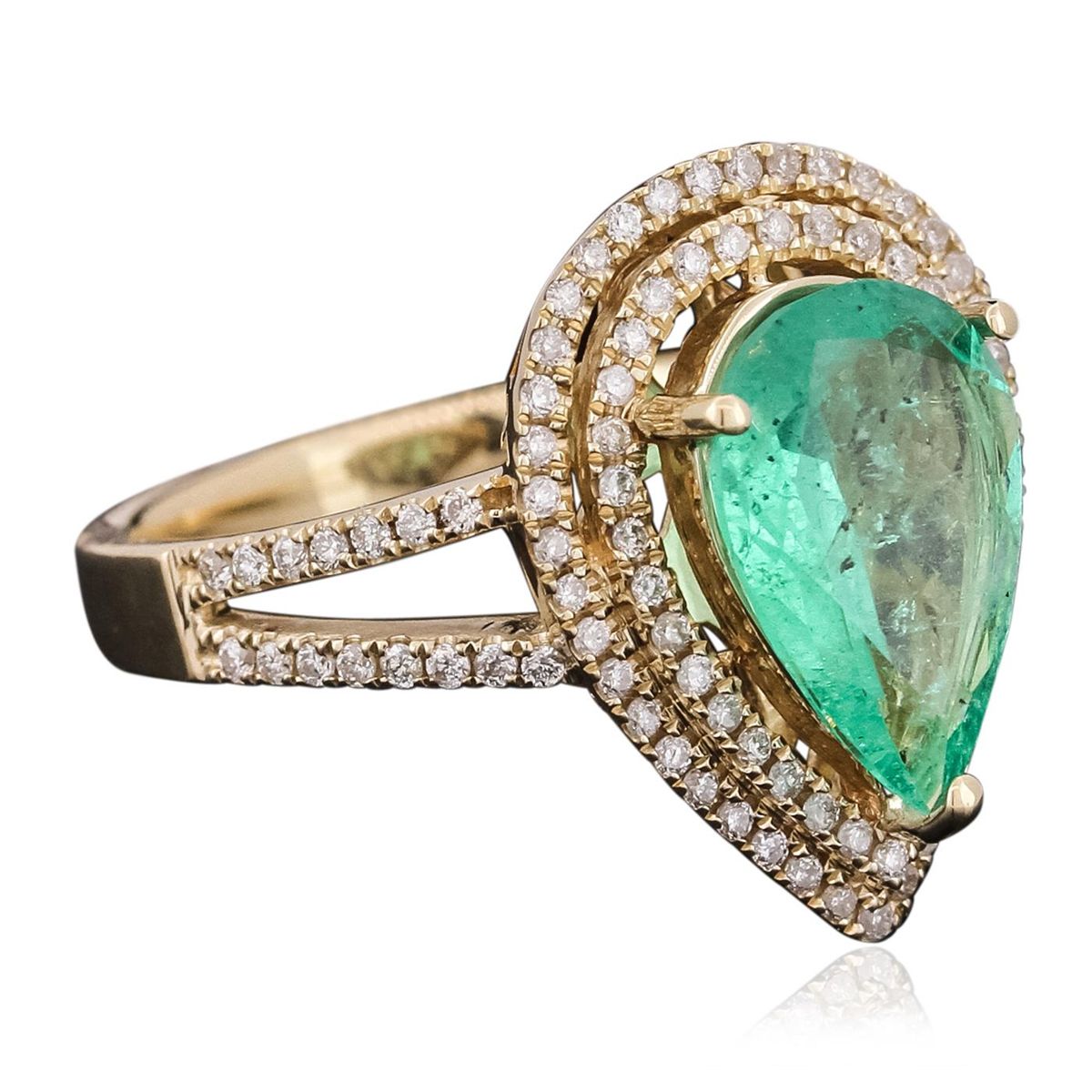 One electronically tested 14KT yellow gold ladies combination cast & assembled ring with a bright polish finish. Identified with markings of "14K". Condition is new. Containing: One prong set pear modified brilliant cut natural emerald, measuring 12.80 x 8.50 x 3.89mm, approximate weight of 2.30ct., clarity is moderately included, type III, medium light, very slightly grayish, very slightly bluish green color, (GIA vslbG 4/3), cut is good. One Hundred Four prong set round brilliant cut diamonds, measuring 1.00 - 1.00 x 0.60mm (depth est.) approximate total weight of 104 Stones = 0.37ct. Clarity: I-1 to I-2. Color: J - K, Cut is Good. Colored gemstones are presumed to have been subjected to commonly used enhancement processes. All diamonds and colored gemstones are graded in the mounting, unless otherwise stated. Total Weight of Colored Stones 2.30ct. Total Weight of Diamonds 0.37ct. Total Weight of Ring 6.10 grams. GGL Appraised at $7,320.00.