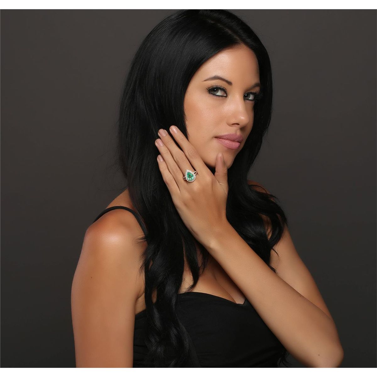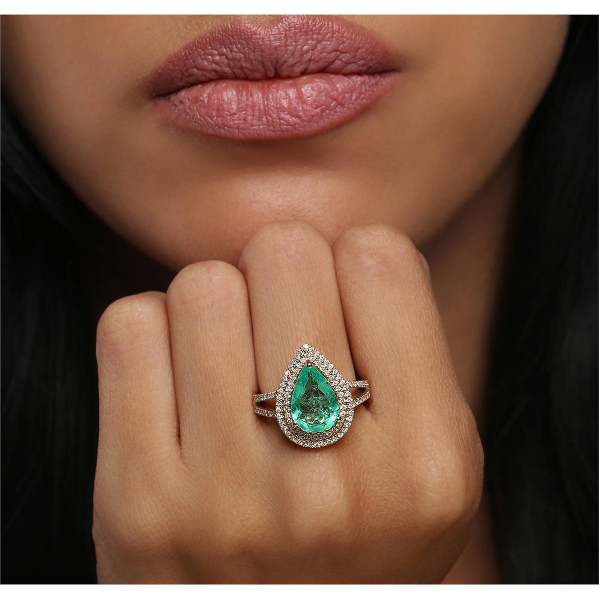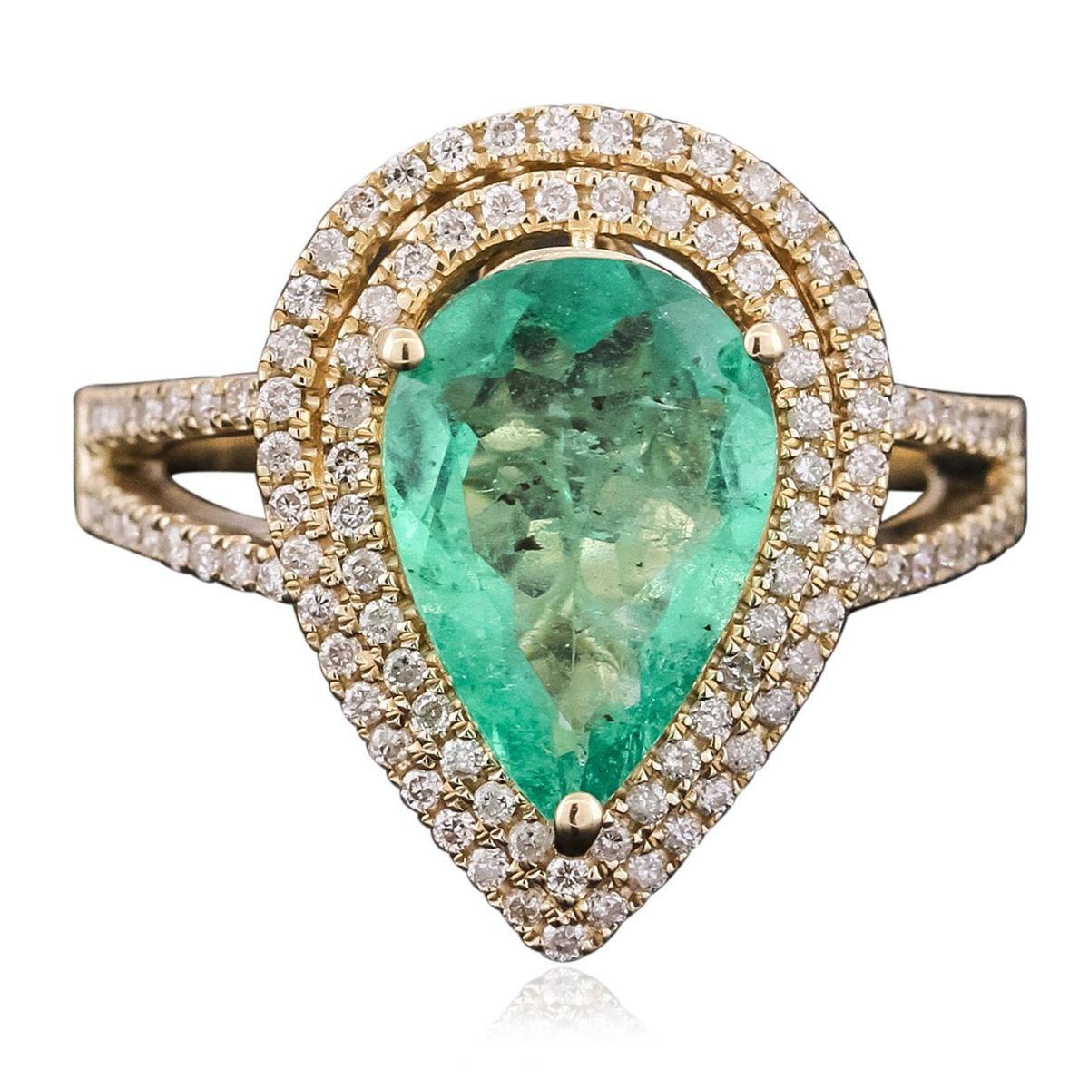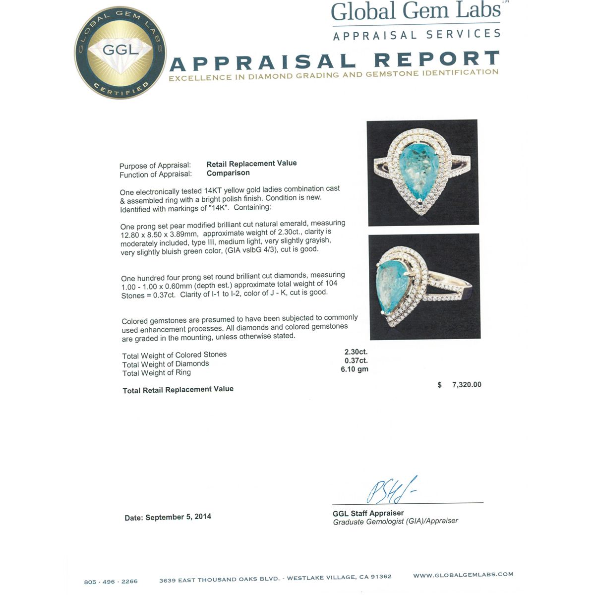 One electronically tested 14KT yellow gold ladies combination cast & assembled ring with a bright polish finish. Identified with markings of "14K". Condition is new. Containing: One prong set pear modified brilliant cut natural emerald, measuring 12.80 x 8.50 x 3.89mm, approximate weight of 2.30ct., clarity is moderately included, type III, medium light, very slightly grayish, very slightly bluish green color, (GIA vslbG 4/3), cut is good. One Hundred Four prong set round brilliant cut diamonds, measuring 1.00 - 1.00 x 0.60mm (depth est.) approximate total weight of 104 Stones = 0.37ct. Clarity: I-1 to I-2. Color: J - K, Cut is Good. Colored gemstones are presumed to have been subjected to commonly used enhancement processes. All diamonds and colored gemstones are graded in the mounting, unless otherwise stated. Total Weight of Colored Stones 2.30ct. Total Weight of Diamonds 0.37ct. Total Weight of Ring 6.10 grams. GGL Appraised at $7,320.00.