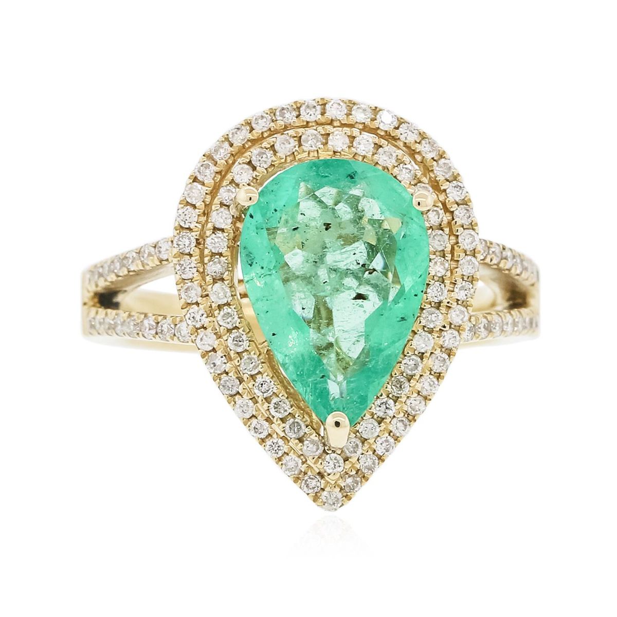 One electronically tested 14KT yellow gold ladies combination cast & assembled ring with a bright polish finish. Identified with markings of "14K". Condition is new. Containing: One prong set pear modified brilliant cut natural emerald, measuring 12.80 x 8.50 x 3.89mm, approximate weight of 2.30ct., clarity is moderately included, type III, medium light, very slightly grayish, very slightly bluish green color, (GIA vslbG 4/3), cut is good. One Hundred Four prong set round brilliant cut diamonds, measuring 1.00 - 1.00 x 0.60mm (depth est.) approximate total weight of 104 Stones = 0.37ct. Clarity: I-1 to I-2. Color: J - K, Cut is Good. Colored gemstones are presumed to have been subjected to commonly used enhancement processes. All diamonds and colored gemstones are graded in the mounting, unless otherwise stated. Total Weight of Colored Stones 2.30ct. Total Weight of Diamonds 0.37ct. Total Weight of Ring 6.10 grams. GGL Appraised at $7,320.00.