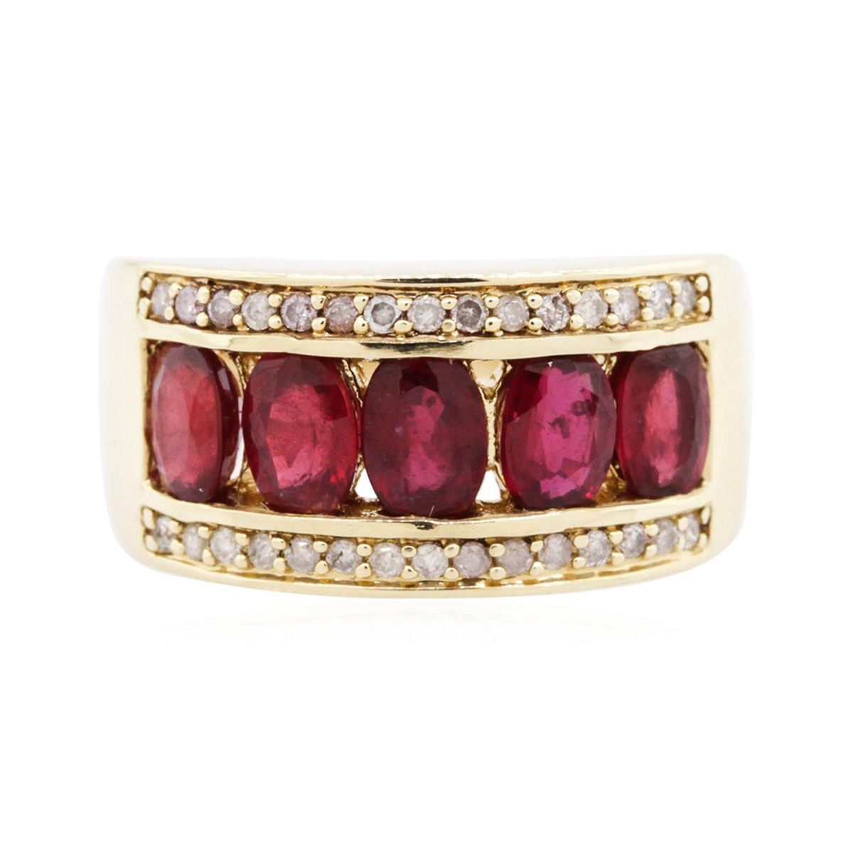 One electronically tested 14KT yellow gold ladies combination cast & assembled ruby and diamond ring with a flat shank with a bright polish finish. Identified with markings of "14K". Condition is new. Containing: Five channel set oval modified brilliant cut natural rubies, measuring 5.50 x 4.00 x 2.50mm, approximate total weight of 2.30ct., clarity is heavily included, type II, medium, moderately strong, red color, (GIA R 5/4), cut is good. Thirty prong set round brilliant cut diamonds, measuring 1.20 - 1.20 x 0.72mm (depth est.) approximate total weight of 30 Stones = 0.19ct. Clarity: I-1 to I-2. Color: I - J, Cut is Good. Colored gemstones are presumed to have been subjected to commonly used enhancement processes. All diamonds and colored gemstones are graded in the mounting, unless otherwise stated. Total Weight of Colored Stones 2.30ct. Total Weight of Diamonds 0.19ct. Total Weight of Ring 6.90 grams. GGL Appraised at $4,060.00.