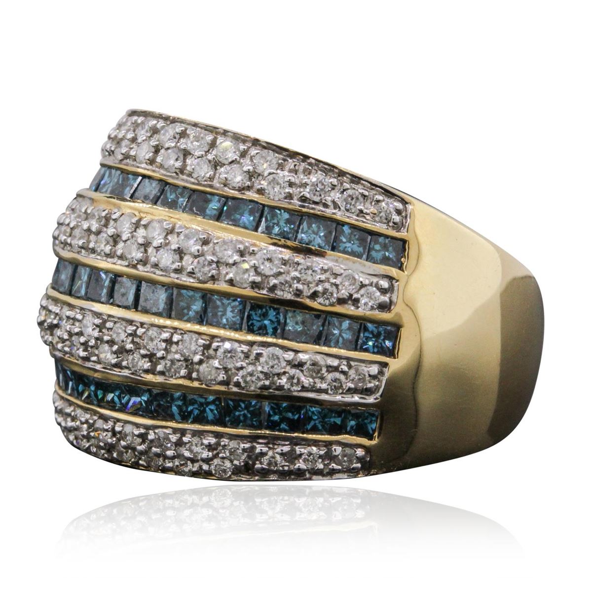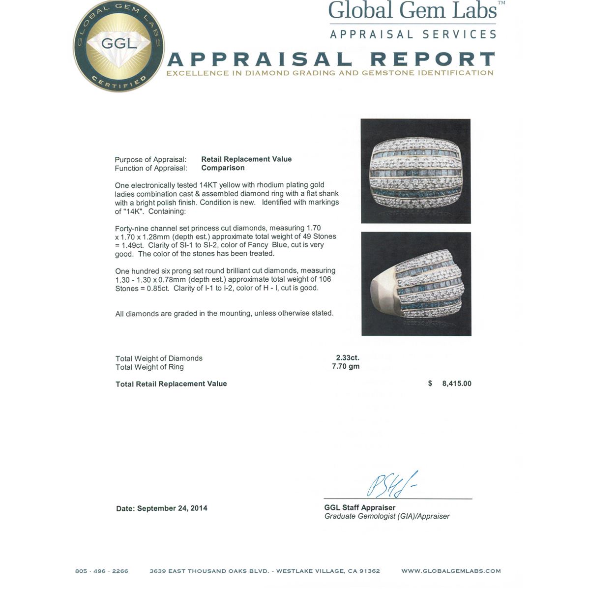 One electronically tested 14KT yellow with rhodium plating gold ladies combination cast & assembled diamond ring with a flat shank with a bright polish finish. Identified with markings of "14K". Condition is new. Containing: Forty-Nine channel set princess cut diamonds, measuring 1.70 x 1.70 x 1.28mm (depth est.) approximate total weight of 49 Stones = 1.49ct. Clarity: SI-1 to SI-2, Cut is Very Good. The color of the stones has been treated. One Hundred Six prong set round brilliant cut diamonds, measuring 1.30 - 1.30 x 0.78mm (depth est.) approximate total weight of 106 Stones = 0.85ct. Clarity: I-1 to I-2. Color: H - I, Cut is Good. All diamonds are graded in the mounting, unless otherwise stated. Total Weight of Diamonds 2.33ct. Total Weight of Ring 7.70 grams. GGL Appraised at $8,415.00.