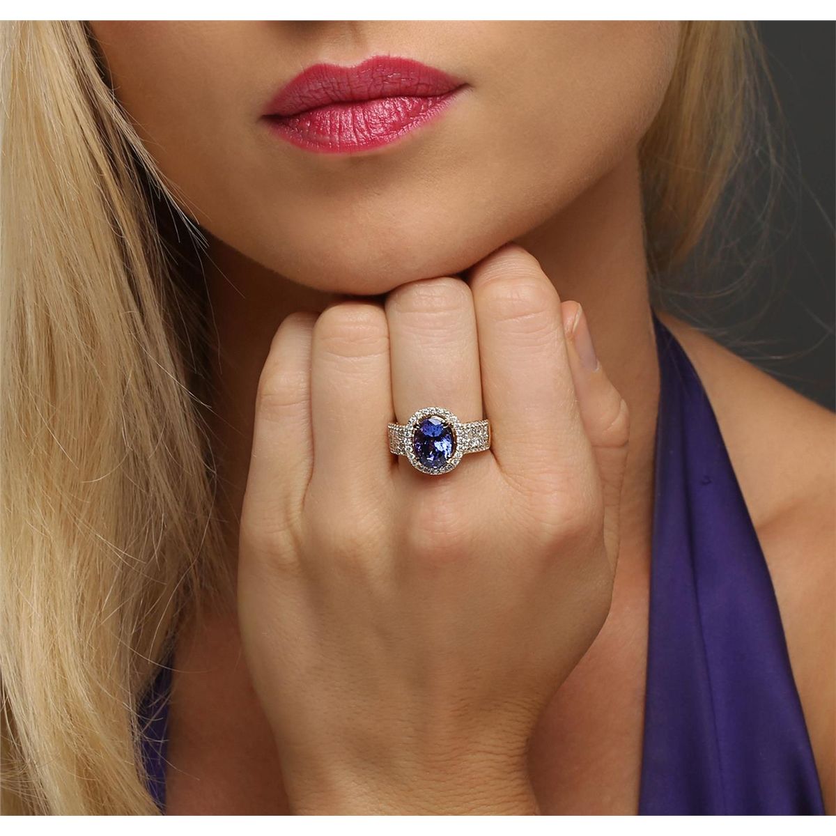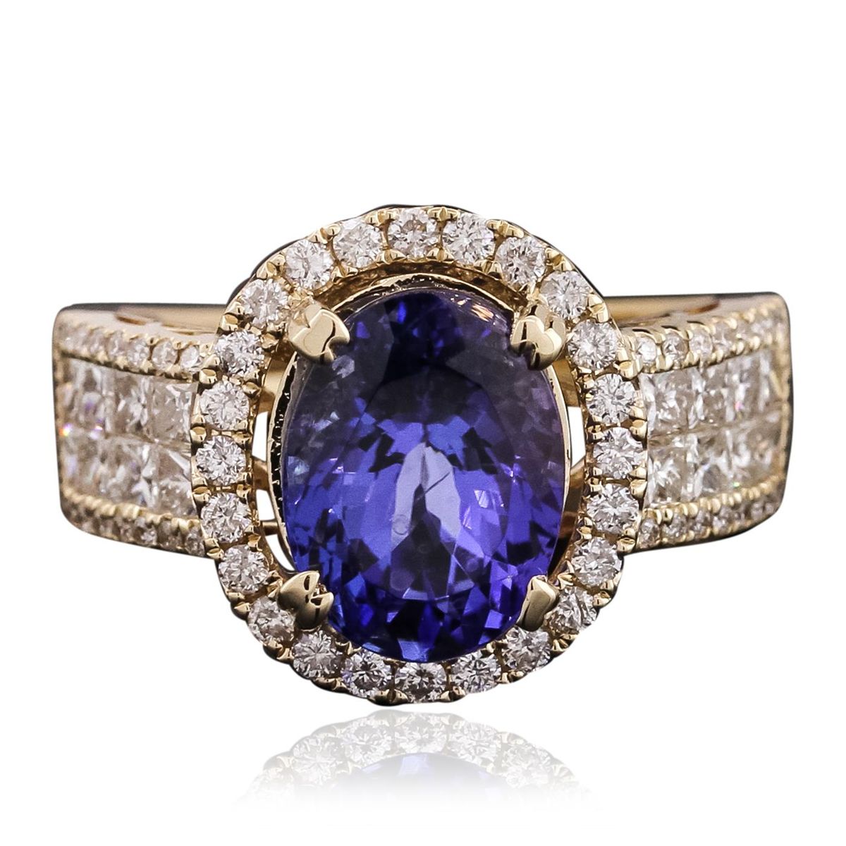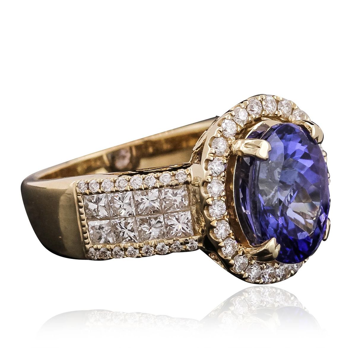 One electronically tested 14KT yellow gold ladies combination cast & assembled tanzanite and diamond ring with a flat shank with a bright polish finish. Identified with markings of "14K". Condition is new. Containing: One prong set oval modified brilliant cut natural tanzanite, measuring 10.53 x 7.91 x 4.10mm, approximate weight of 2.34ct., clarity is eye clean, type I, medium, moderately strong, bluish violet color, (GIA bV 5/4), cut is good. Fifty-Six prong set round brilliant cut diamonds, measuring 1.40 - 1.00 x 0.72mm (depth est.) approximate total weight of 56 Stones = 0.35ct. Clarity: I-1 to I-2. Color: I - J, Cut is Good. Sixteen invisible set princess cut diamonds, measuring 2.00 x 2.00 x 1.50mm (depth est.) approximate total weight of 16 Stones = 0.79ct. Clarity: SI-1. Color: J, Cut is Good. Colored gemstones are presumed to have been subjected to commonly used enhancement processes. All diamonds and colored gemstones are graded in the mounting, unless otherwise stated total weight of Colored Stones 2.34ct. Total Weight of Diamonds 1.14ct. Total Weight of Ring 6.10 grams. GGL Appraised at $7,795.00.