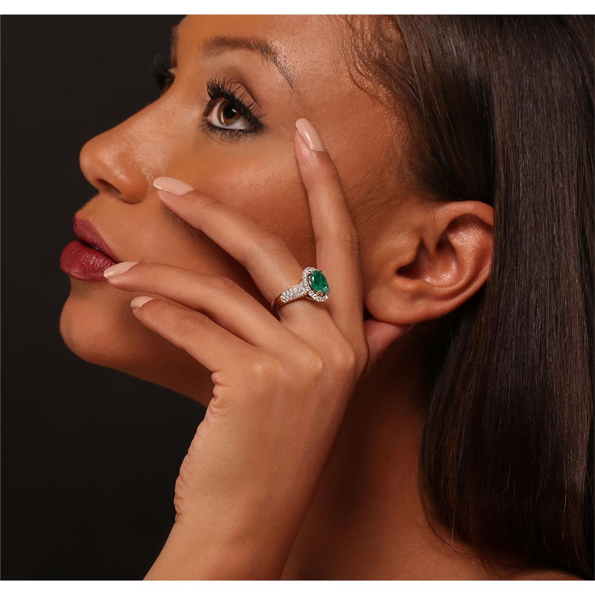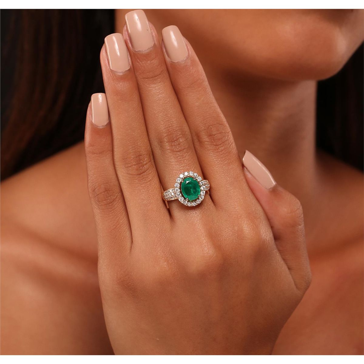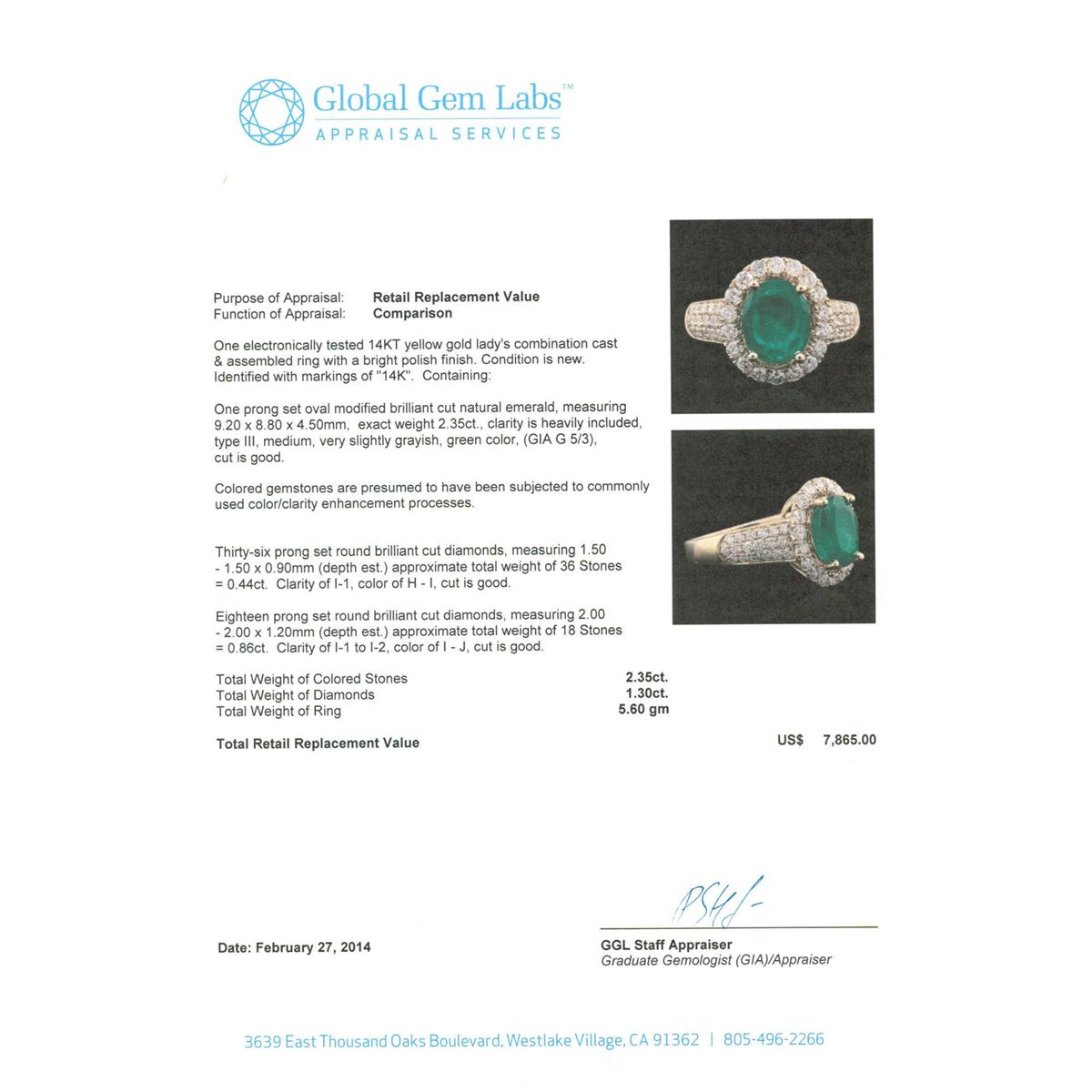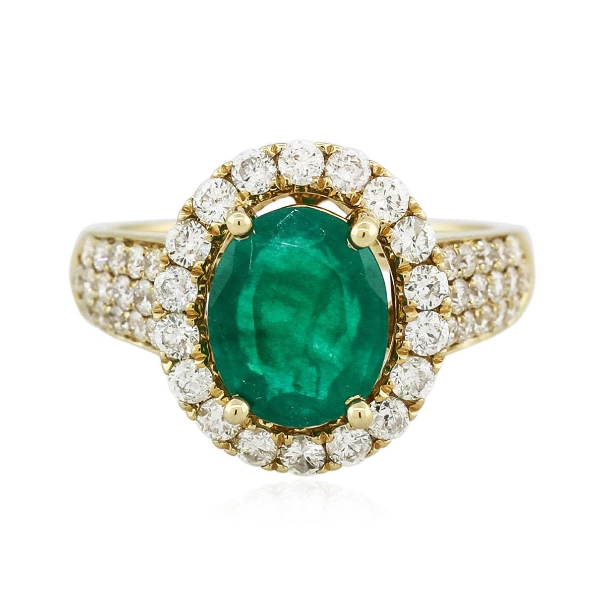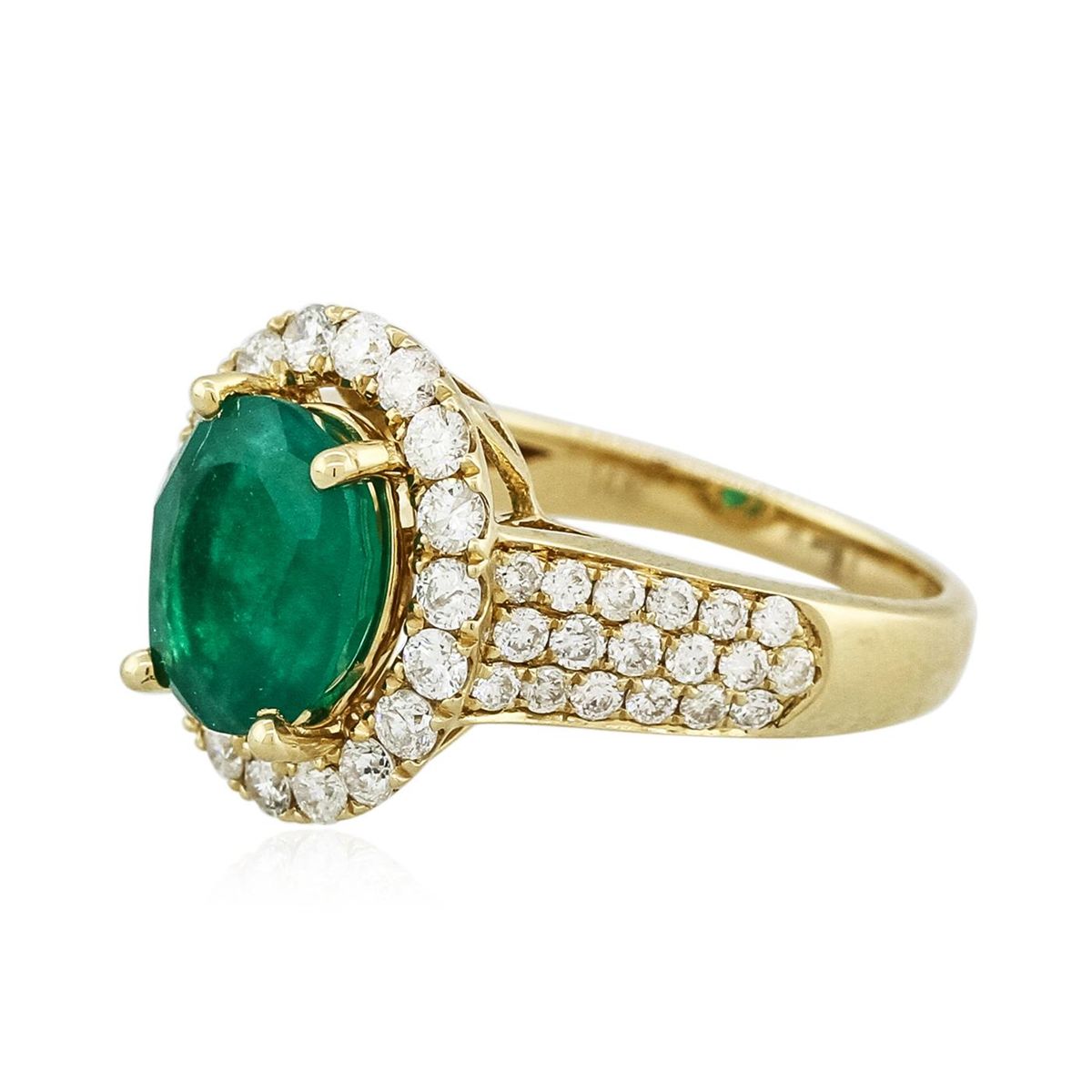 One electronically tested 14KT yellow gold Ladies combination cast & assembled ring with a bright polish finish. Condition is new. Identified with markings of "14K". Containing: One prong set oval modified brilliant cut natural emerald, measuring 9.20 x 8.80 x 4.50mm, exact weight 2.35ct., clarity is heavily included, type III, medium, very slightly grayish, green color, (GIA G 5/3), cut is good. Colored gemstones are presumed to have been subjected to commonly used color/clarity enhancement processes. Thirty-Six prong set round brilliant cut diamonds, measuring 1.50 - 1.50 x 0.90mm (depth est.) approximate. Total Weight of 36 Stones = 0.44ct. Clarity: I-1. Color: H - I, Cut is Good. Eighteen prong set round brilliant cut diamonds, measuring 2.00 - 2.00 x 1.20mm (depth est.) approximate. Total Weight of 18 Stones = 0.86ct. Clarity: I-1 to I-2. Color: I - J, Cut is Good. Total Weight of Colored Stones 2.35ct. Total Weight of Diamonds 1.30ct. Total Weight of Ring 5.60 grams. GGL Appraised at $7,865.00.