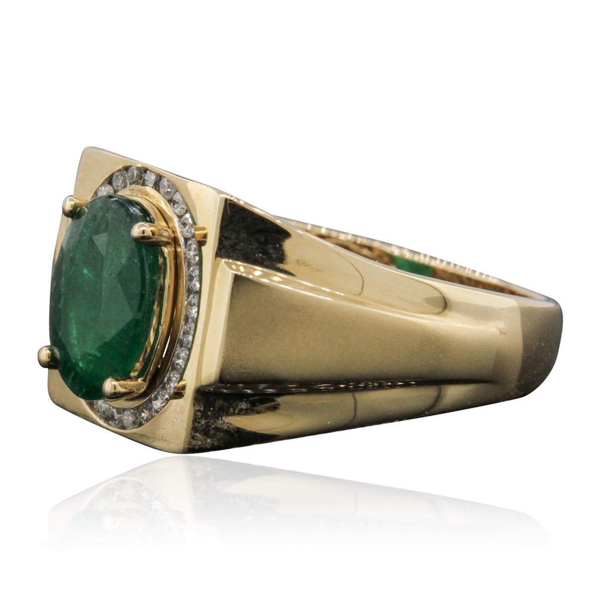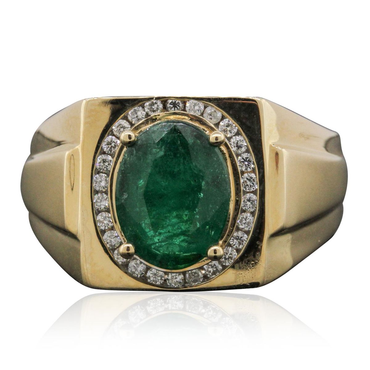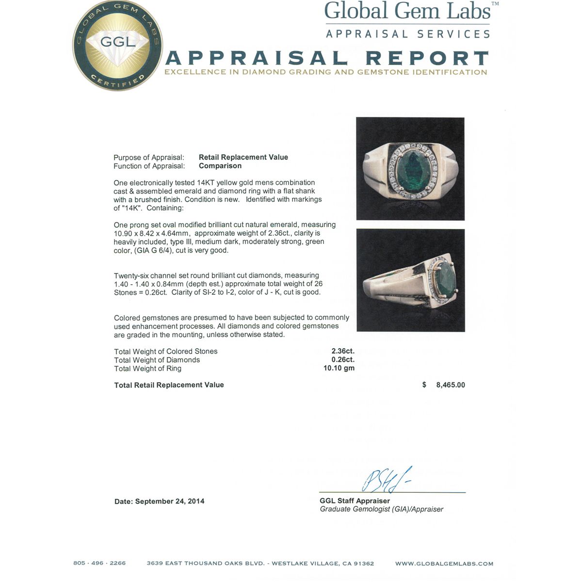 One electronically tested 14KT yellow gold men's combination cast & assembled emerald and diamond ring with a flat shank with a brushed finish. Identified with markings of "14K". Condition is new. Containing: One prong set oval modified brilliant cut natural emerald, measuring 10.90 x 8.42 x 4.64mm, approximate weight of 2.36ct., clarity is heavily included, type III, medium dark, moderately strong, green color, (GIA G 6/4), cut is very good. Twenty-Six channel set round brilliant cut diamonds, measuring 1.40 - 1.40 x 0.84mm (depth est.) approximate total weight of 26 Stones = 0.26ct. Clarity: SI-2 to I-2. Color: J - K, Cut is Good. Colored gemstones are presumed to have been subjected to commonly used enhancement processes. All diamonds and colored gemstones are graded in the mounting, unless otherwise stated. Total Weight of Colored Stones 2.36ct. Total Weight of Diamonds 0.26ct. Total Weight of Ring 10.10 grams. GGL Appraised at $8,465.00.