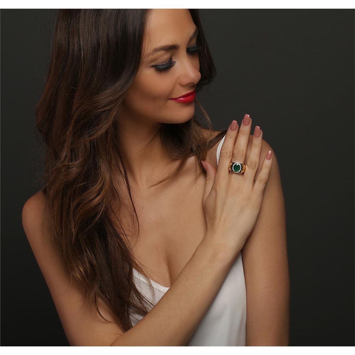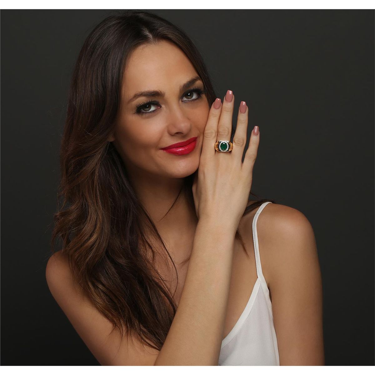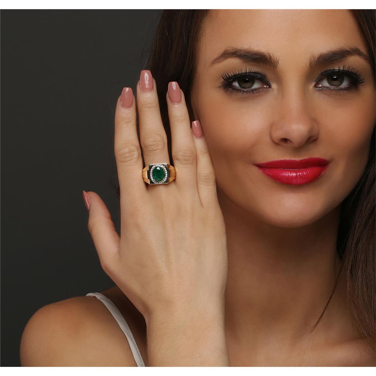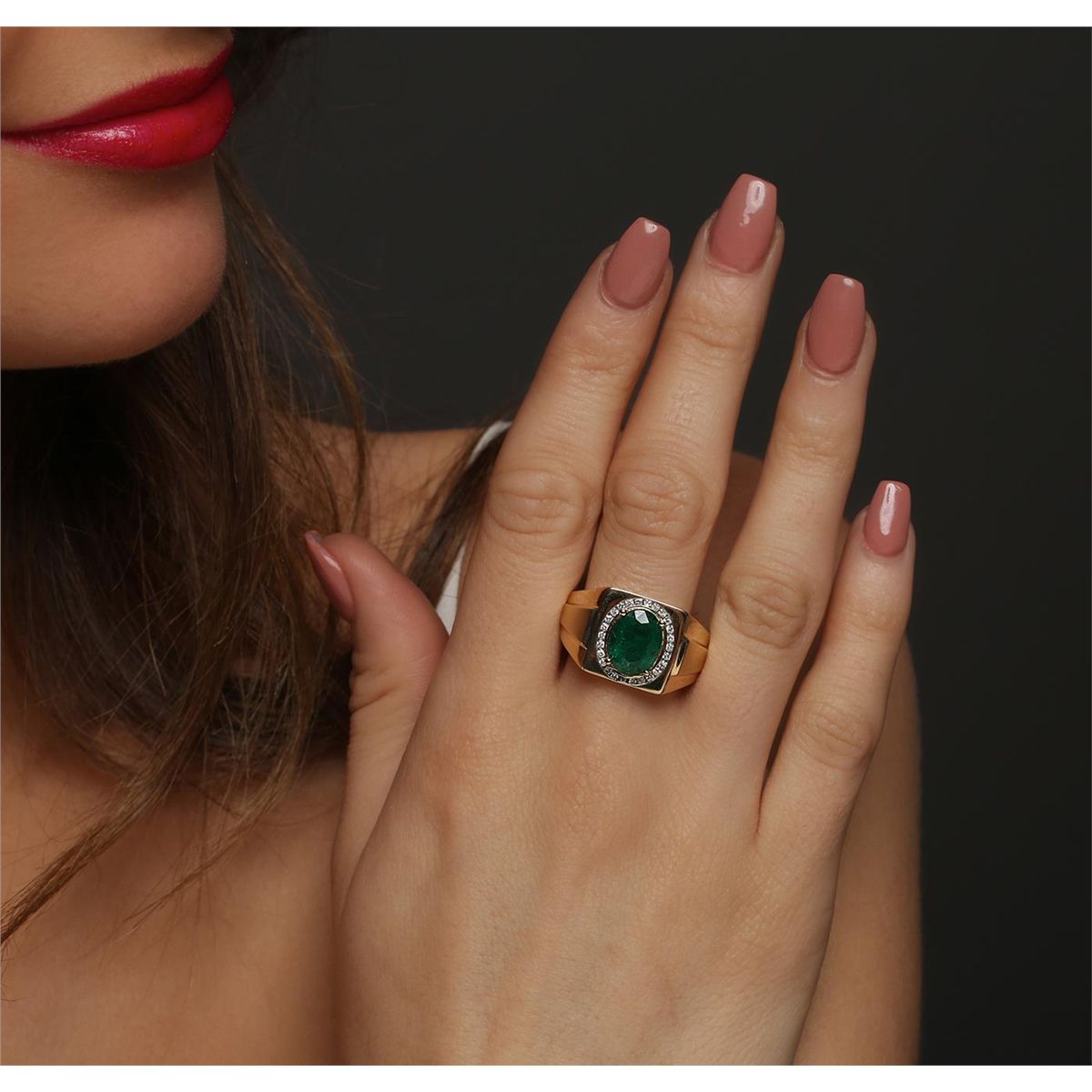 One electronically tested 14KT yellow gold men's combination cast & assembled emerald and diamond ring with a flat shank with a brushed finish. Identified with markings of "14K". Condition is new. Containing: One prong set oval modified brilliant cut natural emerald, measuring 10.90 x 8.42 x 4.64mm, approximate weight of 2.36ct., clarity is heavily included, type III, medium dark, moderately strong, green color, (GIA G 6/4), cut is very good. Twenty-Six channel set round brilliant cut diamonds, measuring 1.40 - 1.40 x 0.84mm (depth est.) approximate total weight of 26 Stones = 0.26ct. Clarity: SI-2 to I-2. Color: J - K, Cut is Good. Colored gemstones are presumed to have been subjected to commonly used enhancement processes. All diamonds and colored gemstones are graded in the mounting, unless otherwise stated. Total Weight of Colored Stones 2.36ct. Total Weight of Diamonds 0.26ct. Total Weight of Ring 10.10 grams. GGL Appraised at $8,465.00.