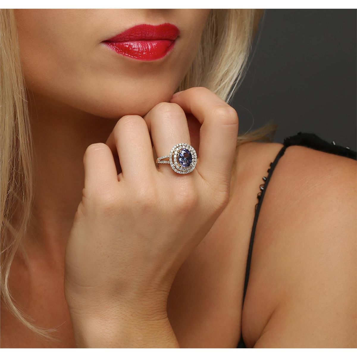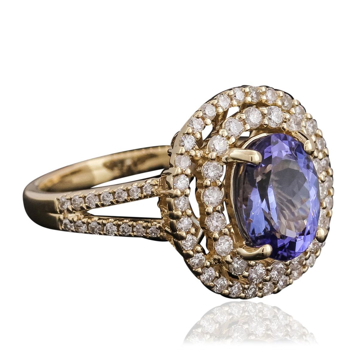 One electronically tested 14KT yellow gold ladies combination cast & assembled tanzanite and diamond ring with a split shank with a bright polish finish. Identified with markings of "14K". Condition is new. Containing: One prong set oval modified brilliant cut natural tanzanite, measuring 9.52 x 7.51 x 4.88mm, approximate weight of 2.37ct., clarity is eye clean, type I, medium, moderately strong, bluish violet color, (GIA bV 5/4), cut is good. Seventy-Six prong set round brilliant cut diamonds, measuring 1.30 - 1.10 x 0.72mm (depth est.) approximate total weight of 76 Stones = 0.48ct. Clarity: I-1 to I-2. Color: J - K, Cut is Good. Colored gemstones are presumed to have been subjected to commonly used enhancement processes. All diamonds and colored gemstones are graded in the mounting, unless otherwise stated total weight of Colored Stones 2.37ct. Total Weight of Diamonds 0.48ct. Total Weight of Ring 5.50 grams. GGL Appraised at $6,640.00.
