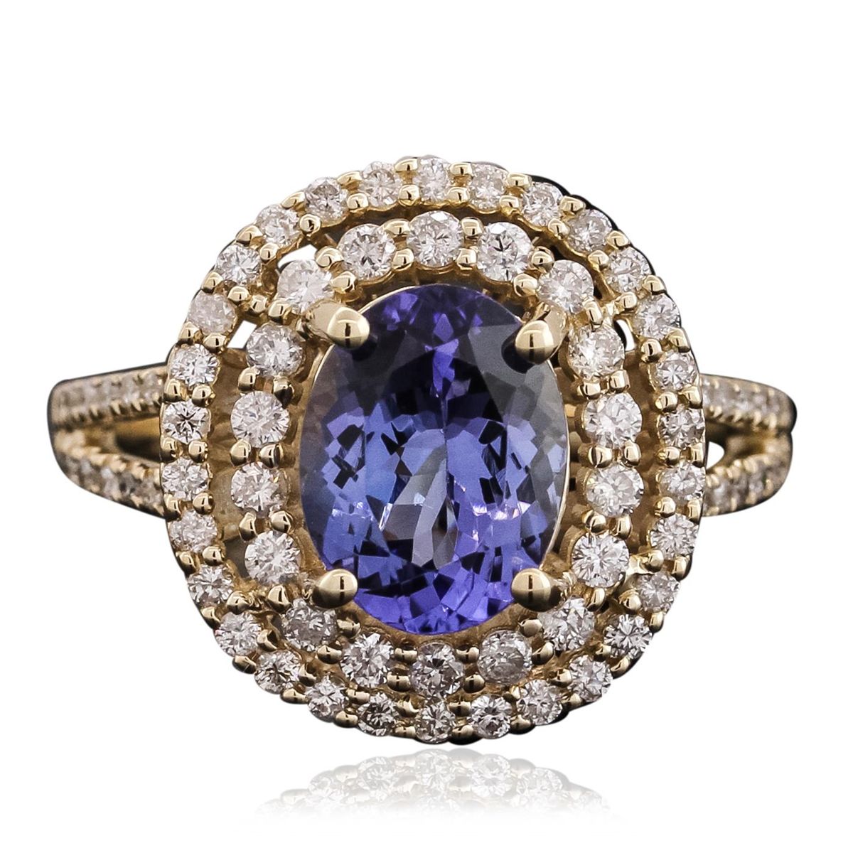 One electronically tested 14KT yellow gold ladies combination cast & assembled tanzanite and diamond ring with a split shank with a bright polish finish. Identified with markings of "14K". Condition is new. Containing: One prong set oval modified brilliant cut natural tanzanite, measuring 9.52 x 7.51 x 4.88mm, approximate weight of 2.37ct., clarity is eye clean, type I, medium, moderately strong, bluish violet color, (GIA bV 5/4), cut is good. Seventy-Six prong set round brilliant cut diamonds, measuring 1.30 - 1.10 x 0.72mm (depth est.) approximate total weight of 76 Stones = 0.48ct. Clarity: I-1 to I-2. Color: J - K, Cut is Good. Colored gemstones are presumed to have been subjected to commonly used enhancement processes. All diamonds and colored gemstones are graded in the mounting, unless otherwise stated total weight of Colored Stones 2.37ct. Total Weight of Diamonds 0.48ct. Total Weight of Ring 5.50 grams. GGL Appraised at $6,640.00.