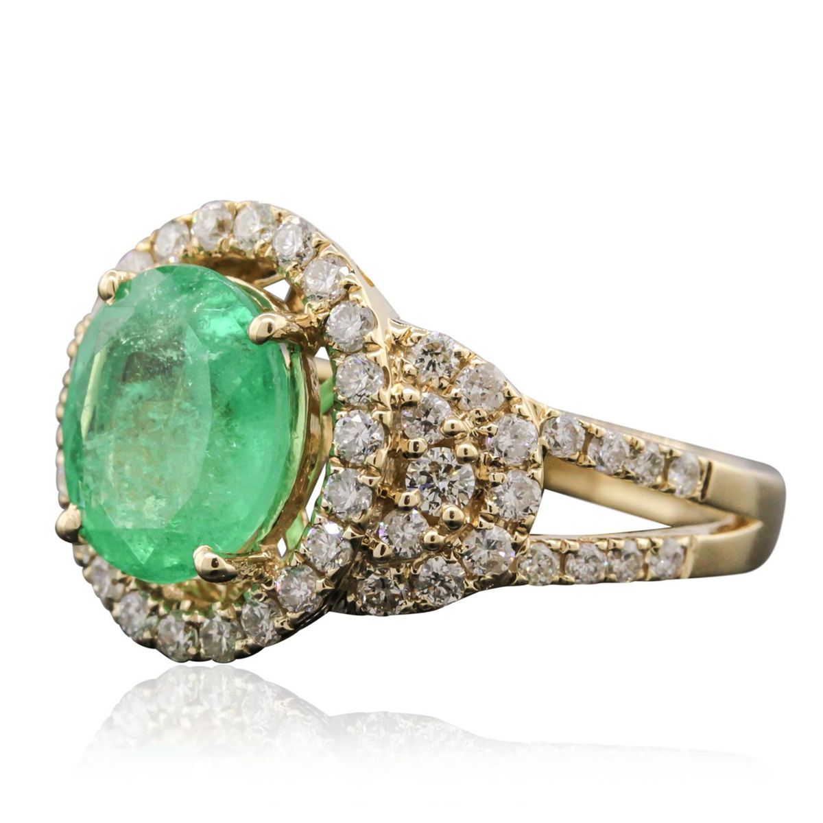 One electronically tested 14KT yellow gold Ladies combination cast & assembled ring with a bright polish finish. Condition is new. Identified with markings of "14K". Containing: One prong set oval modified brilliant cut natural emerald, measuring 9.60 x 8.38 x 5.45mm, approximate weight of 2.40ct., clarity is moderately included, type III, medium light, moderately strong, green color, (GIA G 4/4), cut is good. Colored gemstones are presumed to have been subjected to commonly used enhancement processes. All diamonds and colored gemstones are graded in the mounting, unless otherwise stated. Fifty-Eight prong set round brilliant cut diamonds, measuring 2.00 - 1.30 x 0.99mm (depth est.) approximate total weight of 58 Stones = 0.68ct. Clarity: I-1 to I-2. Color: I - J, Cut is Good. Total Weight of Colored Stones 2.40ct. Total Weight of Diamonds 0.68ct. Total Weight of Ring 5.30 grams. GGL Appraised at $7,445.00.