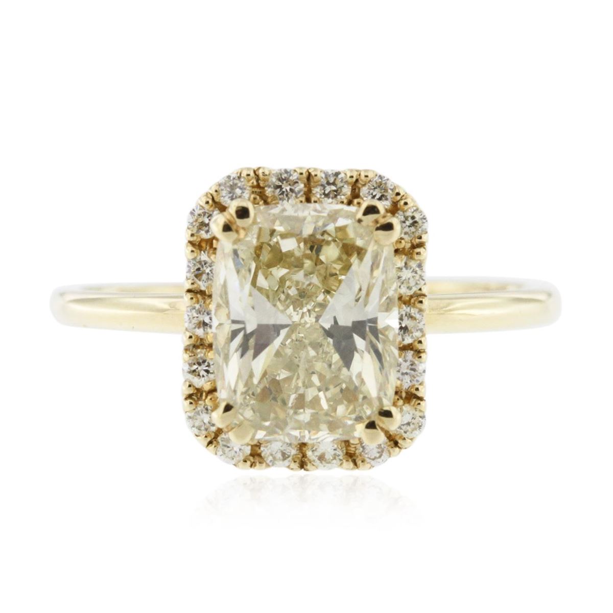 One electronically tested 14KT yellow gold ladies cast & assembled diamond unity ring with a bright polish finish. Condition is new, good workmanship. The featured diamond is set within a diamond bezel, completed by a one and one-half millimeter wide band. Identified with markings of "14K". Containing: One prong set radiant shaped cut diamond, measuring 8.70 x 6.65 x 4.30mm (depth est.), 10.00% GTCF approximate weight of 2.22ct. Diamond Grading Report attached. Graded in the setting. Clarity SI-2 . Color Very Light Yellow. Depth 64.%. Table 67.7%. Eighteen prong set round brilliant cut diamonds, measuring 1.50 - 1.40 x 0.87mm (depth est.) approximate total weight of 18 stones = 0.19ct. Graded in the setting. Clarity SI-1 to I-1. Color I-L. Total weight of Diamonds 2.41ct. Total weight of Ring 2.68m. AIG Appraised at $24,130.00.