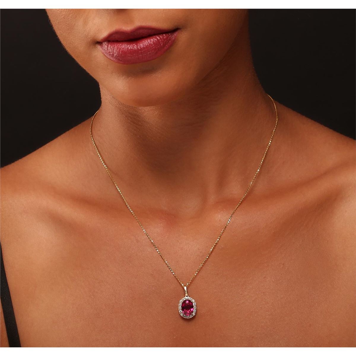 One electronically tested 14KT yellow gold Ladies combination cast & assembled pendant with a bright polish finish. Condition is new. Identified with markings of "14K". Containing: Seventeen bead set round brilliant cut diamonds, measuring 1.90 - 1.90 x 1.14mm (depth est.) approximate. Total Weight of 17 Stones = 0.48ct. Clarity: SI-2 to I-1. Color: G - H, Cut is Good. One prong set oval modified brilliant cut natural pink tourmaline, measuring 10.00 x 7.30 x 4.90mm, exact weight 2.42ct., clarity is eye clean, type II, medium, moderately strong, reddish purple color, (GIA rP 5/4), cut is very good. Colored gemstones are presumed to have been subjected to commonly used color/clarity enhancement processes. Total Weight of Colored Stones 2.42ct. Total Weight of Diamonds 0.48ct. Total Weight of Pendant 3.70 grams. GGL Appraised at $4,565.00.