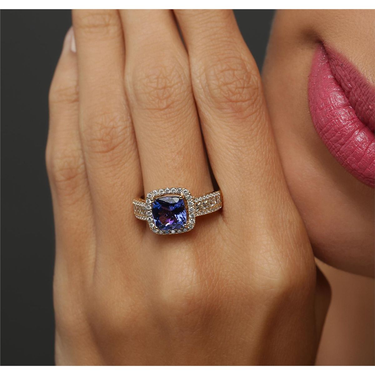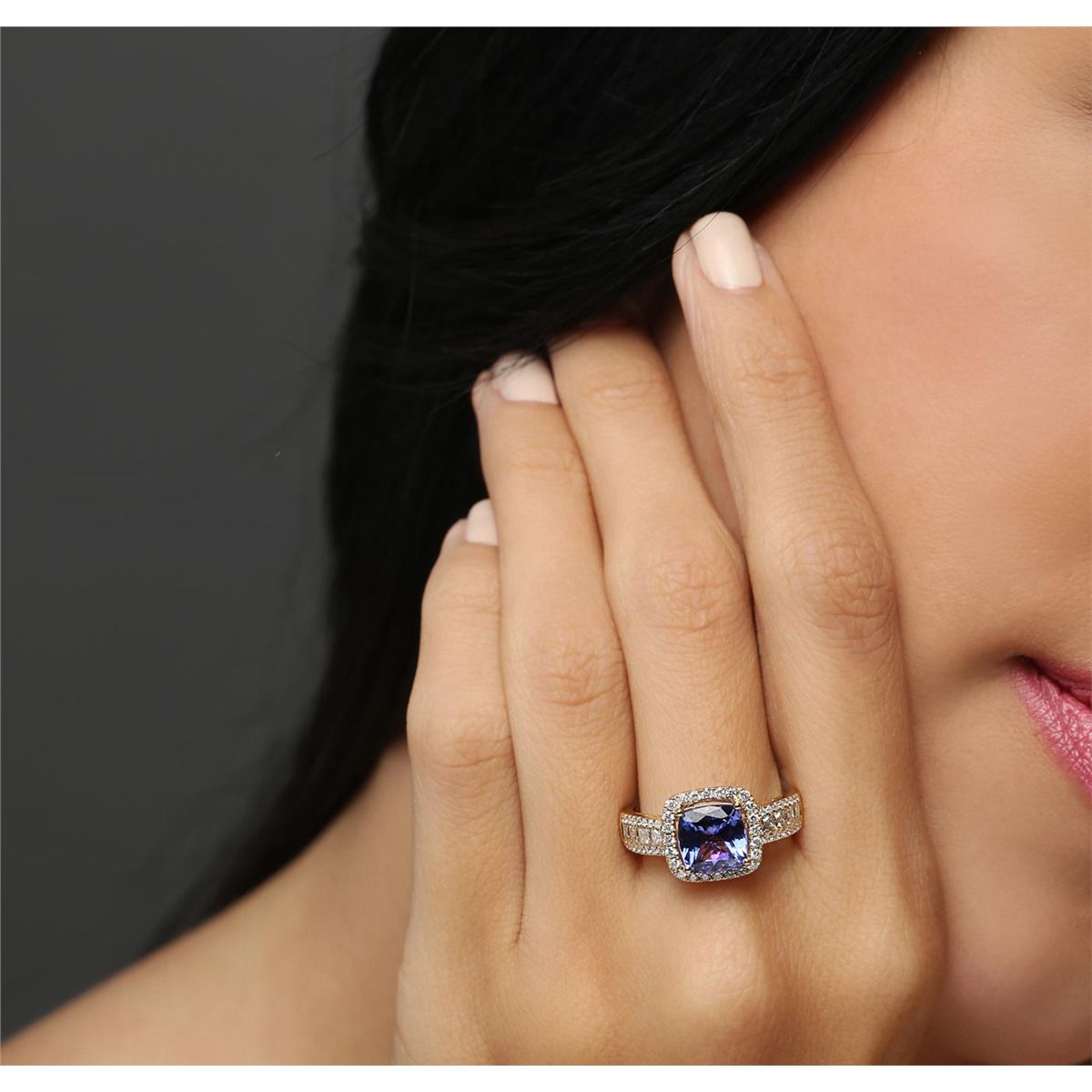 One electronically tested 14KT yellow gold Ladies combination cast & assembled ring with a bright polish finish. Condition is new. Identified with markings of "14K". Containing: One prong set square cushion modified brilliant cut natural tanzanite, measuring 7.80 x 7.80 x 5.07mm, approximate weight of 2.43ct., clarity is eye clean, type I, medium, moderately strong, bluish violet color, (GIA bV 5/4), cut is good. Fifty-Six prong set round brilliant cut diamonds, measuring 1.40 - 1.10 x 0.75mm (depth est.) approximate total weight of 56 Stones = 0.40ct. Clarity: I-1 to I-2. Color: I - J, Cut is Good. Eight invisible set princess cut diamonds, measuring 2.00 x 2.00 x 1.50mm (depth est.) approximate total weight of 8 Stones = 0.39ct. Clarity: SI-1. Color: J - K, Cut is Good. Colored gemstones are presumed to have been subjected to commonly used enhancement processes. All diamonds and colored gemstones are graded in the mounting, unless otherwise stated. Total Weight of Colored Stones 2.43ct. Total Weight of Diamonds 0.79ct. Total Weight of Ring 4.60 grams. GGL Appraised at $6,180.00.