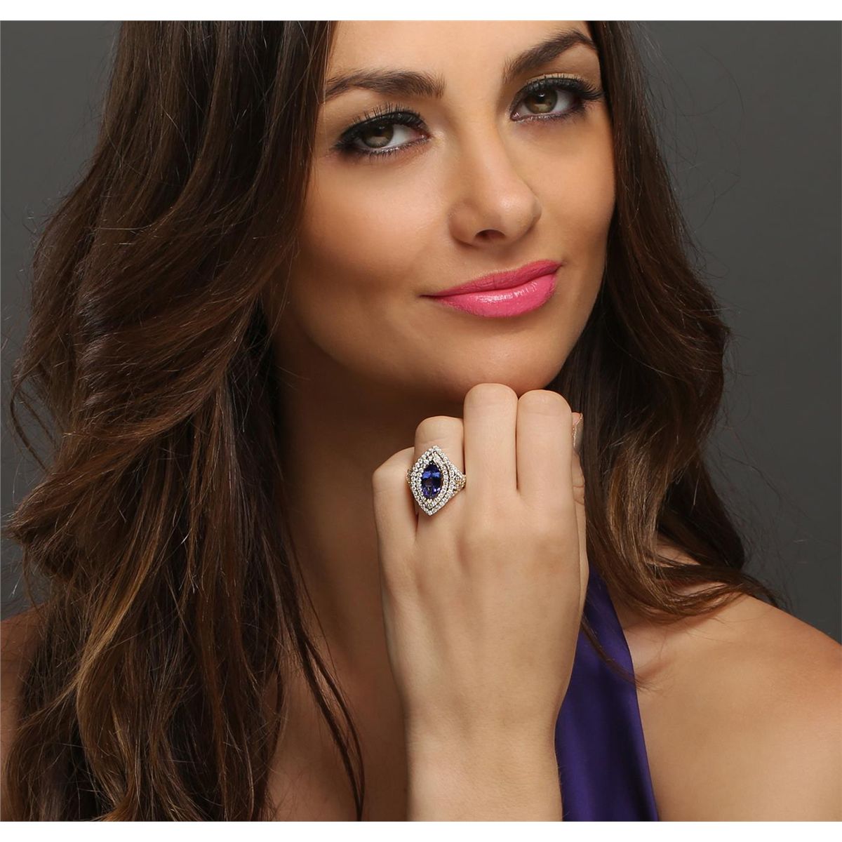 One electronically tested 14KT yellow gold ladies cast tanzanite and diamond ring with a bright polish finish. The featured tanzanite is set within two tiered diamond bezels supported by diamond set shoulders, completed by a three millimeter wide band. Identified with markings of "14K". Condition is new, good workmanship. Containing: One prong set marquise brilliant cut natural tanzanite, measuring 13.70 x 6.80 x 3.90mm, 6% bulge factor, approximate weight of 2.45ct., clarity is eye clean, type I, medium dark, very slightly grayish, violetish blue color, (GIA vB 6/3), cut is good. Transmitting light with no distortion, transparent. Graded in the setting. Tanzanite is a very rare gemstone that is only found in the country of Tanzania. Originally discovered in 1967. Tiffany & Company, named the stone Tanzanite. It is found in the Usumburu Mountains that border the Umba Valley of northern Tanzania. Tanzanite occurs in gray, brown, violet, blue, reddish-purple, & green. The gem is interesting because of its exceptional pleochroism. Rotated in different directions a tanzanite will exhibit multiple changes of color. Tanzanite has a low tolerance to ultrasonic cleaning, and should not be cleaned using this method. Eighty-Four prong and bezel set round brilliant cut diamonds, measuring 1.70 - 1.60 x 0.99mm (depth est.) approximate total weight of 84 Stones = 1.47ct. Graded in the setting. Clarity: SI-1 to I-1. Color: G - I. Total Weight of Colored Stones 2.45ct. Total Weight of Diamonds 1.47ct. Total Weight of Ring 7.20 grams. AIG Appraised at $11,170.00.