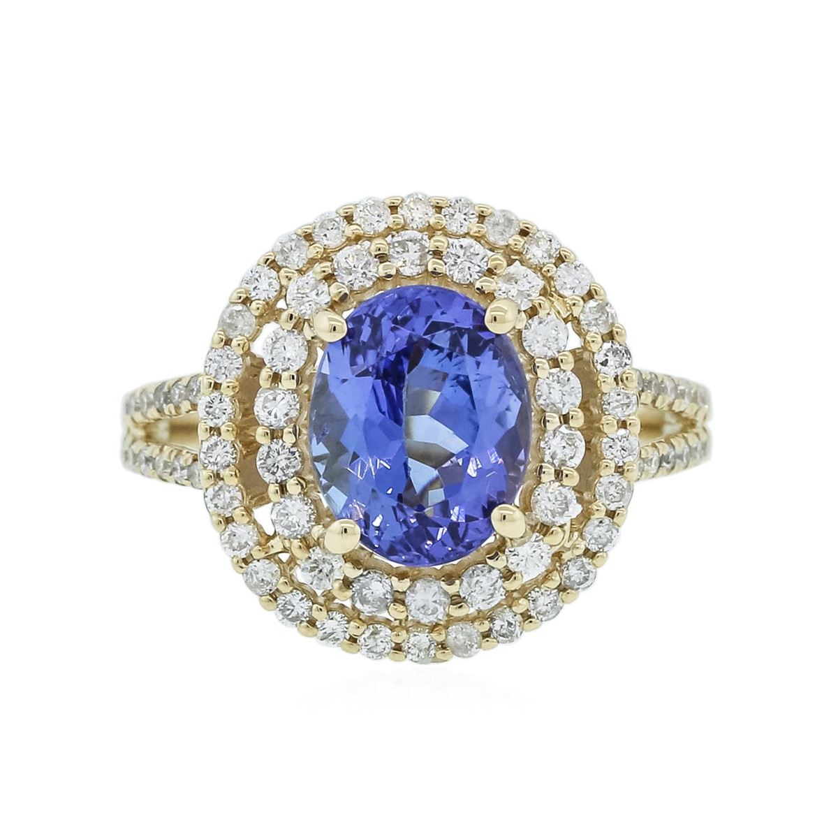 One electronically tested 14KT yellow gold ladies combination cast & assembled tanzanite and diamond ring with a split shank with a bright polish finish. Identified with markings of "14K". Condition is new. Containing: One prong set oval modified brilliant cut natural tanzanite, measuring 9.64 x 7.62 x 4.95mm, approximate weight of 2.47ct., clarity is eye clean, type I, medium, moderately strong, bluish violet color, (GIA bV 5/4), cut is good. Seventy-Six prong set round brilliant cut diamonds, measuring 1.30 - 1.10 x 0.72mm (depth est.) approximate total weight of 76 Stones = 0.48ct. Clarity: I-1 to I-2. Color: J - K, Cut is Good. Colored gemstones are presumed to have been subjected to commonly used enhancement processes. All diamonds and colored gemstones are graded in the mounting, unless otherwise stated total weight of Colored Stones 2.47ct. Total Weight of Diamonds 0.48ct. Total Weight of Ring 5.60 grams. GGL Appraised at $6,805.00.