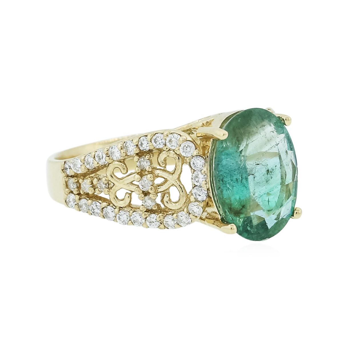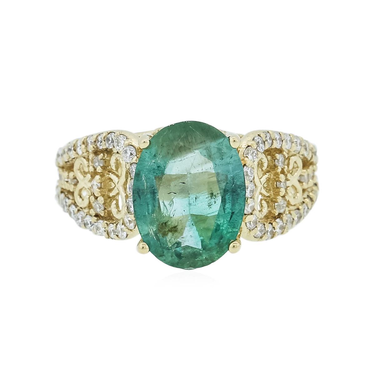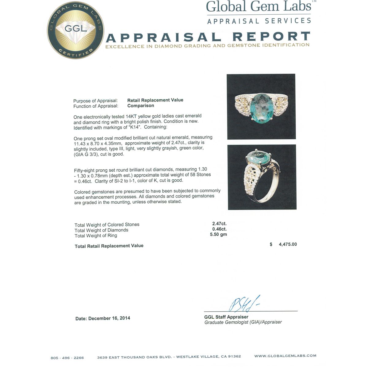 One electronically tested 14KT yellow gold ladies cast emerald and diamond ring with a bright polish finish. Identified with markings of "K14". Condition is new. Containing: One prong set oval modified brilliant cut natural emerald, measuring 11.43 x 8.70 x 4.35mm, approximate weight of 2.47ct., clarity is slightly included, type III, light, very slightly grayish, green color, (GIA G 3/3), cut is good. Fifty-Eight prong set round brilliant cut diamonds, measuring 1.30 - 1.30 x 0.78mm (depth est.) approximate total weight of 58 Stones = 0.46ct. Clarity: SI-2 to I-1. Color: K, Cut is Good. Colored gemstones are presumed to have been subjected to commonly used enhancement processes. All diamonds and colored gemstones are graded in the mounting, unless otherwise stated. Total Weight of Colored Stones 2.47ct. Total Weight of Diamonds 0.46ct. Total Weight of Ring 5.50 grams. GGL Appraised at $4,475.00.