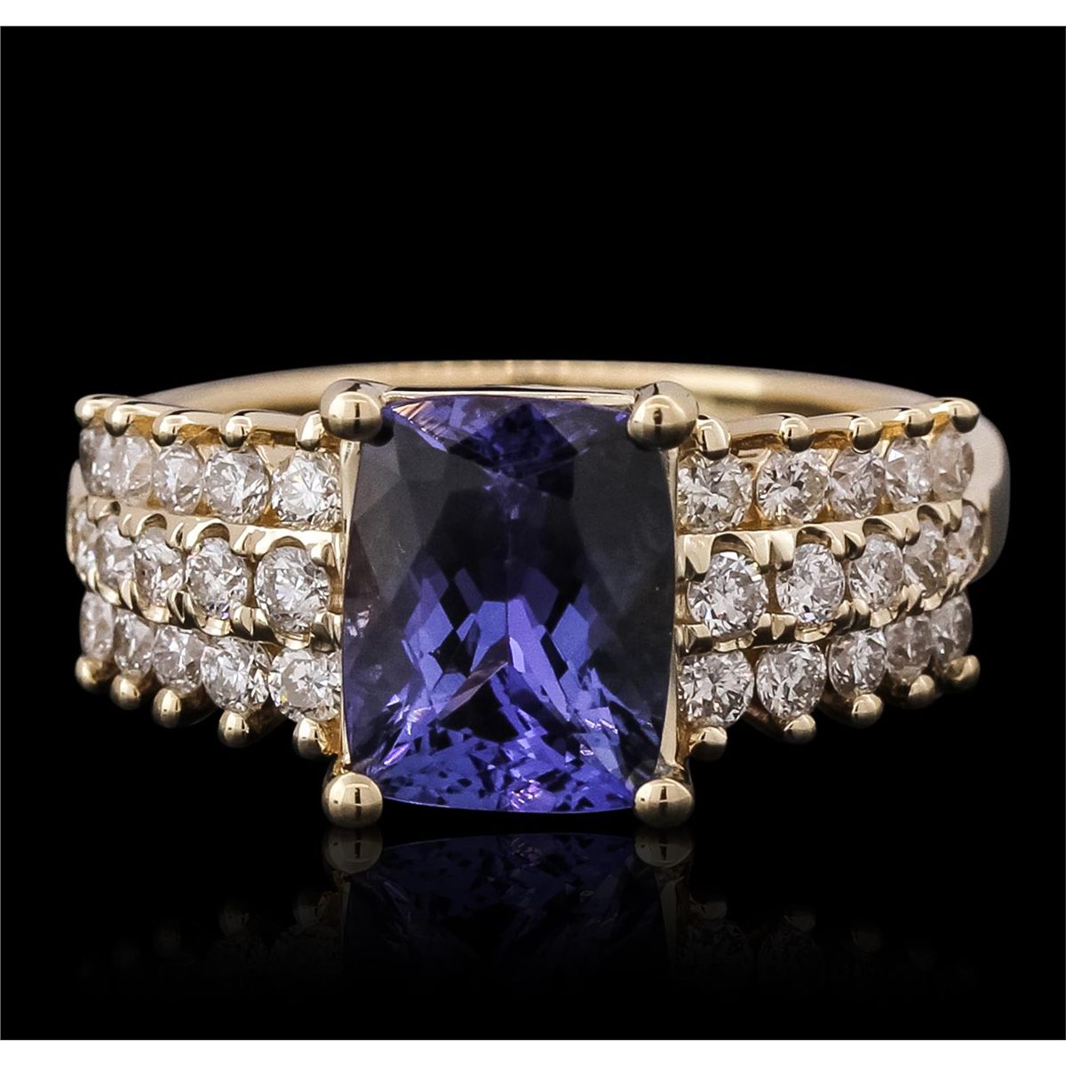 One electronically tested 14KT yellow gold ladies cast tanzanite & diamond ring with a bright finish. The featured tanzanite is set within mirroring diamond set shoulders, completed by a two millimeter wide band. Identified with markings of "14K". Condition is new, good workmanship. Containing: One prong set rectangular cushion mixed cut natural tanzanite, measuring 9.00 x 7.00 x 4.98mm, approximate weight of 2.47ct., clarity is eye clean, type I, medium dark, slightly grayish, bluish violet color, (GIA bV 6/2), cut is good. Transmitting light with no distortion, transparent. Graded in the setting. Tanzanite is a very rare gemstone that is only found in the country of Tanzania. Tanzanite was originally discovered in 1967. Tiffany & Company, named the stone "Tanzanite" after the country of origin. Tanzanite is found in the Usumburu Mountains that border the Umba Valley of northern Tanzania. This region is inhabited by the Masai tribes-people. The mining area is located just south of the Kenya border near Mt. Kilimanjaro. Tanzanite occurs in colors of gray, brown, violet, blue, reddish-purple, & green. The gem is interesting because of its exceptional pleochroism. Rotated in different directions a tanzanite will exhibit multiple changes of color. Tanzanite has a low tolerance to ultrasonic cleaning, and should not be cleaned using this method. Thirty prong set round brilliant cut diamonds, measuring 2.00 - 1.80 x 1.14mm (depth est.) approximate total weight of 30 Stones = 0.74ct. Graded in the setting. Clarity: I-1 to I-2. Color: H - I. Total Weight of Colored Stones 2.47ct. Total Weight of Diamonds 0.74ct. Total Weight of Ring 5.53 grams. AIG Appraised at $6,880.00.
