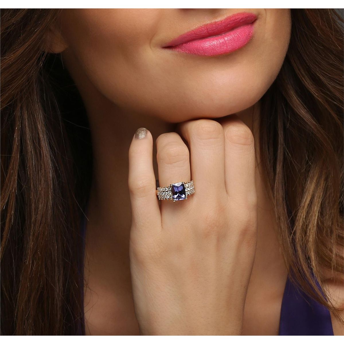 One electronically tested 14KT yellow gold ladies cast tanzanite & diamond ring with a bright finish. The featured tanzanite is set within mirroring diamond set shoulders, completed by a two millimeter wide band. Identified with markings of "14K". Condition is new, good workmanship. Containing: One prong set rectangular cushion mixed cut natural tanzanite, measuring 9.00 x 7.00 x 4.98mm, approximate weight of 2.47ct., clarity is eye clean, type I, medium dark, slightly grayish, bluish violet color, (GIA bV 6/2), cut is good. Transmitting light with no distortion, transparent. Graded in the setting. Tanzanite is a very rare gemstone that is only found in the country of Tanzania. Tanzanite was originally discovered in 1967. Tiffany & Company, named the stone "Tanzanite" after the country of origin. Tanzanite is found in the Usumburu Mountains that border the Umba Valley of northern Tanzania. This region is inhabited by the Masai tribes-people. The mining area is located just south of the Kenya border near Mt. Kilimanjaro. Tanzanite occurs in colors of gray, brown, violet, blue, reddish-purple, & green. The gem is interesting because of its exceptional pleochroism. Rotated in different directions a tanzanite will exhibit multiple changes of color. Tanzanite has a low tolerance to ultrasonic cleaning, and should not be cleaned using this method. Thirty prong set round brilliant cut diamonds, measuring 2.00 - 1.80 x 1.14mm (depth est.) approximate total weight of 30 Stones = 0.74ct. Graded in the setting. Clarity: I-1 to I-2. Color: H - I. Total Weight of Colored Stones 2.47ct. Total Weight of Diamonds 0.74ct. Total Weight of Ring 5.53 grams. AIG Appraised at $6,880.00.