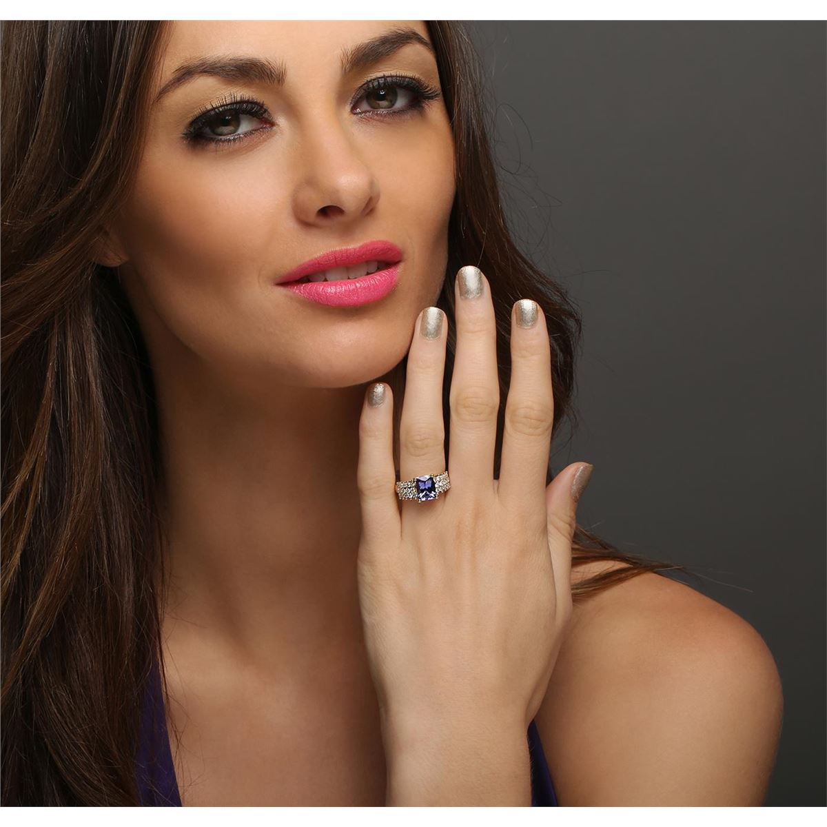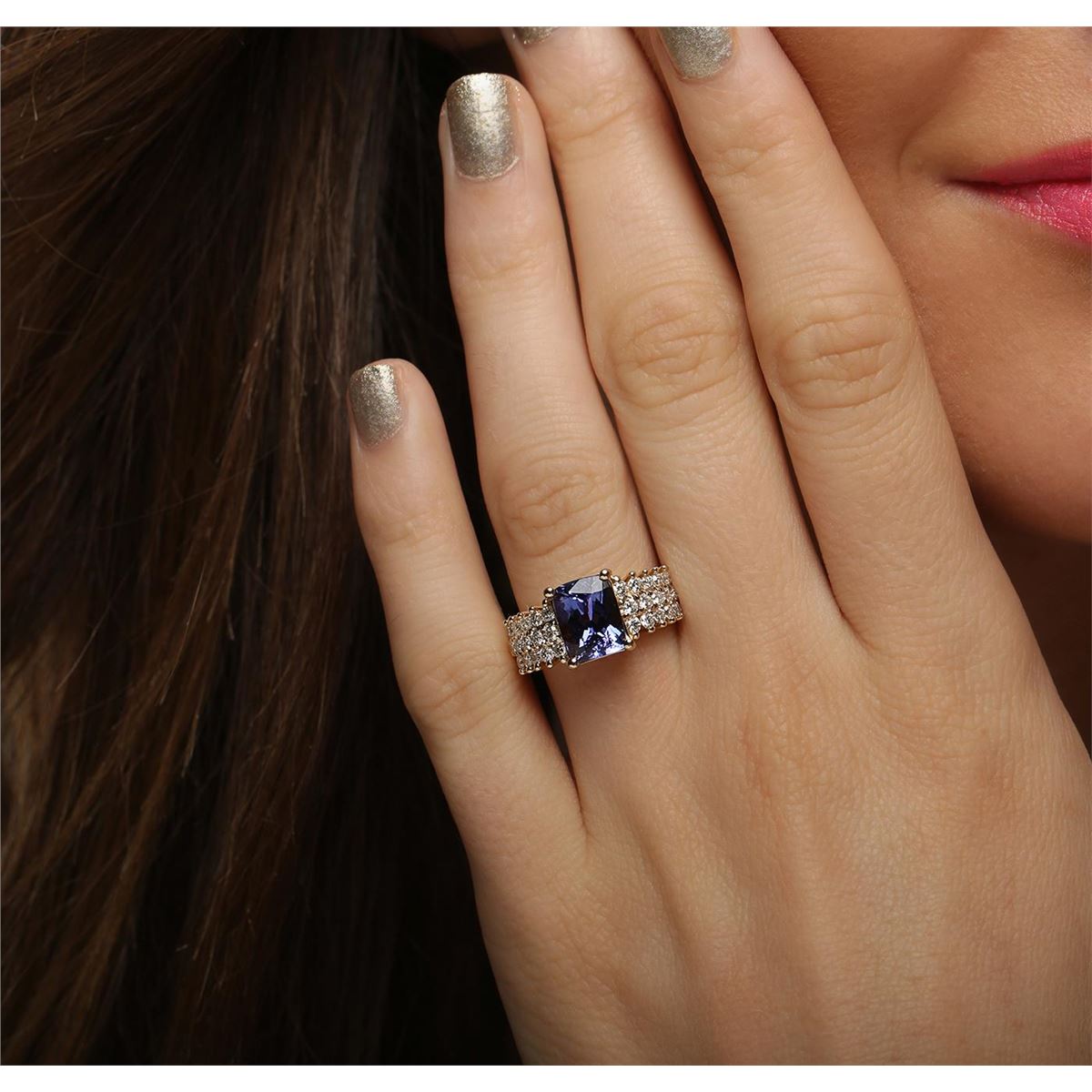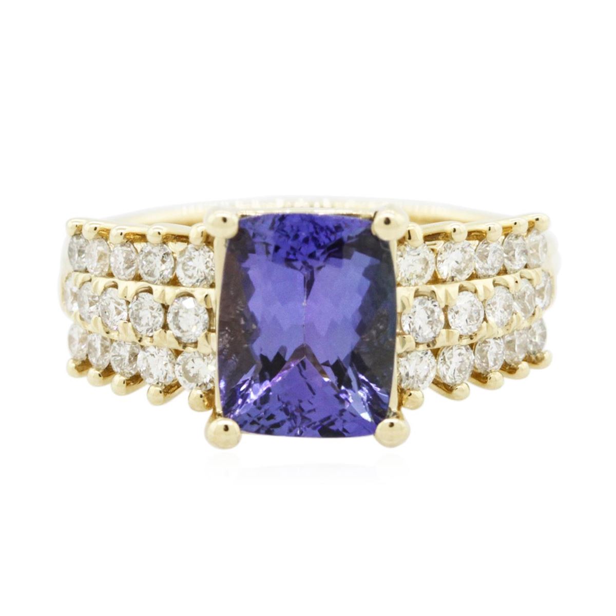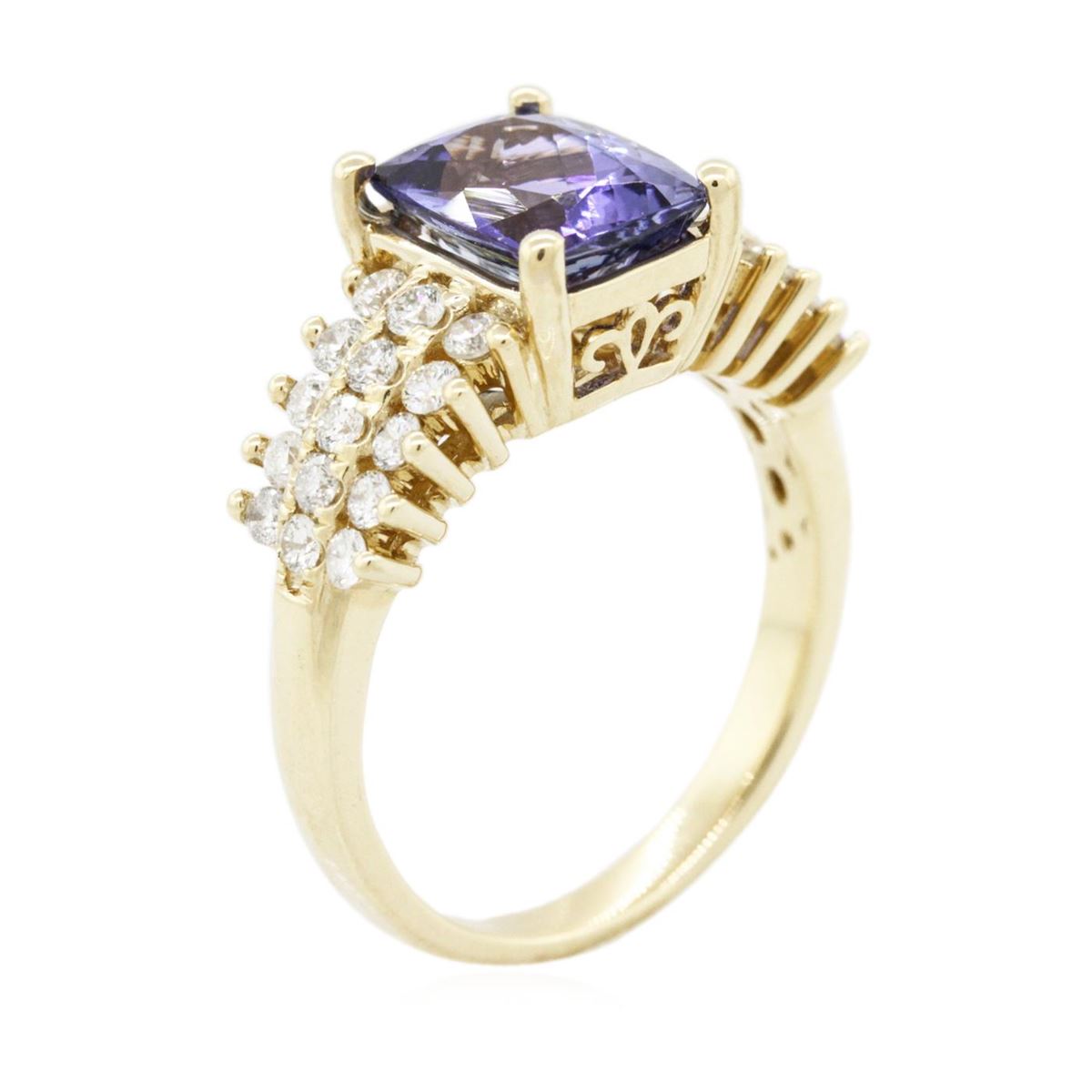 One electronically tested 14KT yellow gold ladies cast tanzanite & diamond ring with a bright finish. The featured tanzanite is set within mirroring diamond set shoulders, completed by a two millimeter wide band. Identified with markings of "14K". Condition is new, good workmanship. Containing: One prong set rectangular cushion mixed cut natural tanzanite, measuring 9.00 x 7.00 x 4.98mm, approximate weight of 2.47ct., clarity is eye clean, type I, medium dark, slightly grayish, bluish violet color, (GIA bV 6/2), cut is good. Transmitting light with no distortion, transparent. Graded in the setting. Tanzanite is a very rare gemstone that is only found in the country of Tanzania. Tanzanite was originally discovered in 1967. Tiffany & Company, named the stone "Tanzanite" after the country of origin. Tanzanite is found in the Usumburu Mountains that border the Umba Valley of northern Tanzania. This region is inhabited by the Masai tribes-people. The mining area is located just south of the Kenya border near Mt. Kilimanjaro. Tanzanite occurs in colors of gray, brown, violet, blue, reddish-purple, & green. The gem is interesting because of its exceptional pleochroism. Rotated in different directions a tanzanite will exhibit multiple changes of color. Tanzanite has a low tolerance to ultrasonic cleaning, and should not be cleaned using this method. Thirty prong set round brilliant cut diamonds, measuring 2.00 - 1.80 x 1.14mm (depth est.) approximate total weight of 30 Stones = 0.74ct. Graded in the setting. Clarity: I-1 to I-2. Color: H - I. Total Weight of Colored Stones 2.47ct. Total Weight of Diamonds 0.74ct. Total Weight of Ring 5.53 grams. AIG Appraised at $6,880.00.