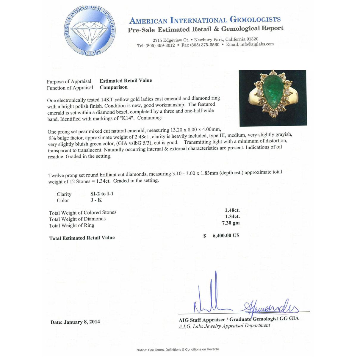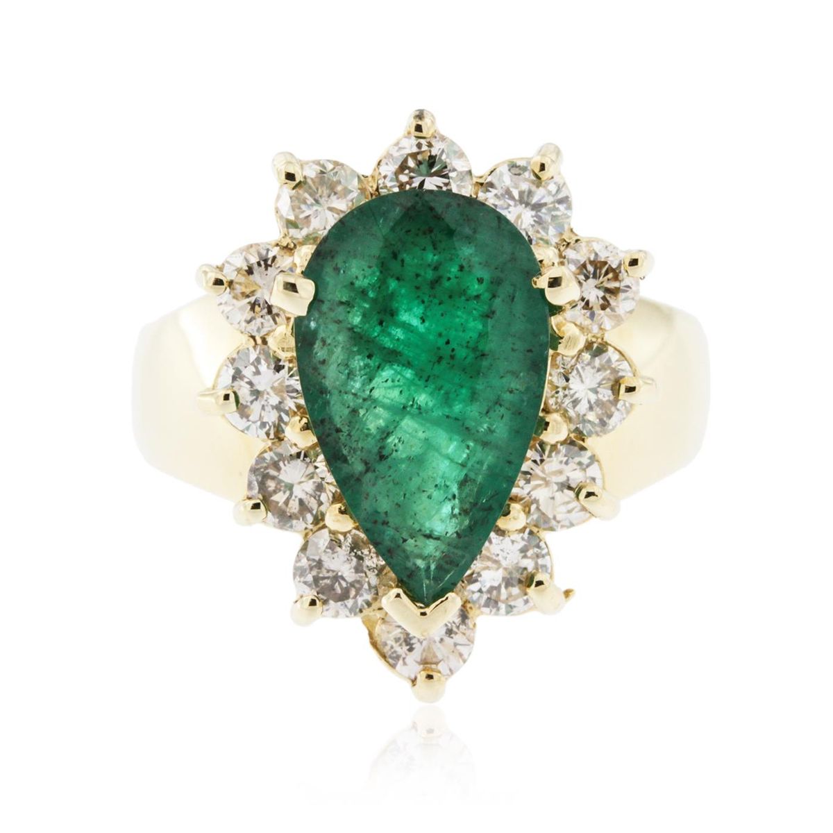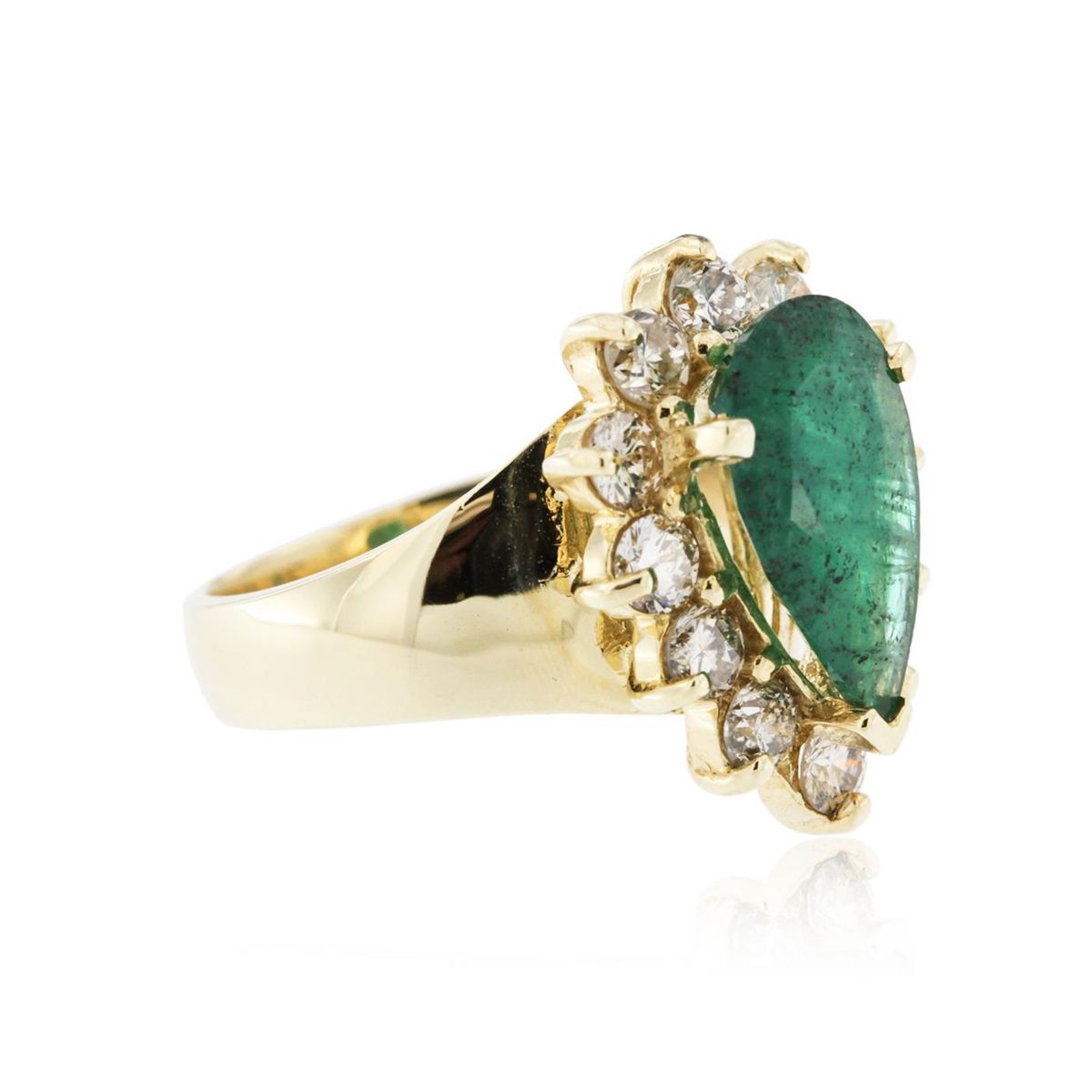 One electronically tested 14KT yellow gold ladies cast emerald and diamond ring with a bright polish finish. The featured emerald is set within a diamond bezel, completed by a three and one-half wide band. Identified with markings of "K14". Condition is new, good workmanship. Containing: One prong set pear mixed cut natural emerald, measuring 13.20 x 8.00 x 4.00mm, 8%. bulge factor, approximate weight of 2.48ct., clarity is heavily included, type III, medium, very slightly grayish, very slightly bluish green color, (GIA vslbG 5/3), cut is good. Transmitting light with a minimum of distortion, transparent to translucent. Naturally occurring internal & external characteristics are present. Indications of oil residue. Graded in the setting. Twelve prong set round brilliant cut diamonds, measuring 3.10 - 3.00 x 1.83mm (depth est.) approximate. Total Weight of 12 Stones = 1.34ct. Graded in the setting. Clarity: SI-2 to I-1 . Color: J - K. Total Weight of Colored Stones 2.48ct. Total Weight of Diamonds 1.34ct. AIG Appraised at $6,400.00.