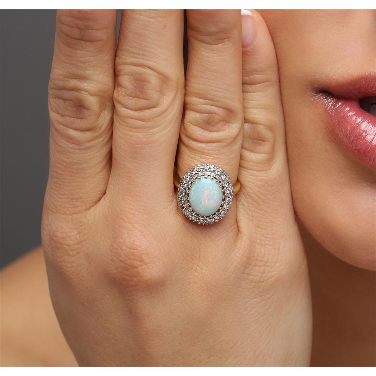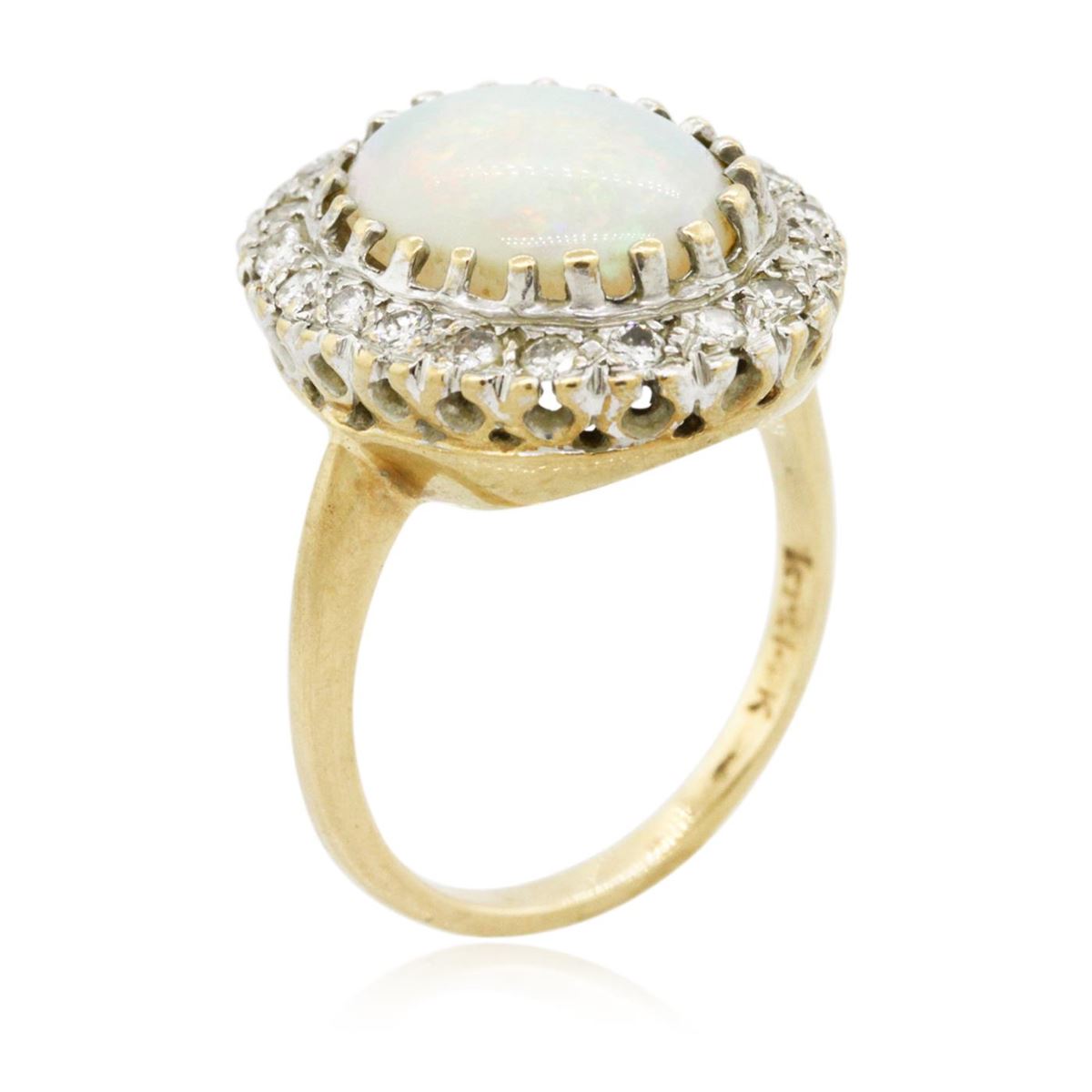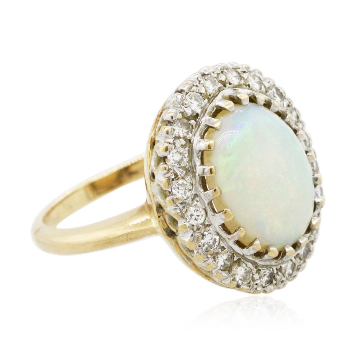 One electronically tested 14KT yellow gold ladies cast opal and diamond ring. The featured opal is set within a diamond bezel, completed by a one and one-half millimeter wide band. Bright polish finish with rhodium accents. Identified with markings of "14K". Condition is good. Containing: One crystal opal that is cut in a oval shaped cabochon and is prong set, measuring 12.00 mm long x 9.34 mm wide, and 3.55 mm thick and the approximate weight is 2.50 carats. The opal has a somewhat bright, multicolor play of color (fire) in a flashfire pattern; a medium dome; a good cut; slightly included; minor dull spot in its brightness and pattern; and is somewhat directional. Graded in the setting. Twenty prong set round brilliant cut diamonds, measuring 1.60 - 1.50 x 0.93mm (depth est.) approximate total weight of 20 Stones = 0.38ct. Graded in the setting. Clarity: VS-1 to VS-2. Color: G - I. Total Weight of Diamonds 0.38ct. Total Weight of Opals 2.50ct. Total Weight of Ring 6.06 grams. AIG Appraised at $3,050.00.