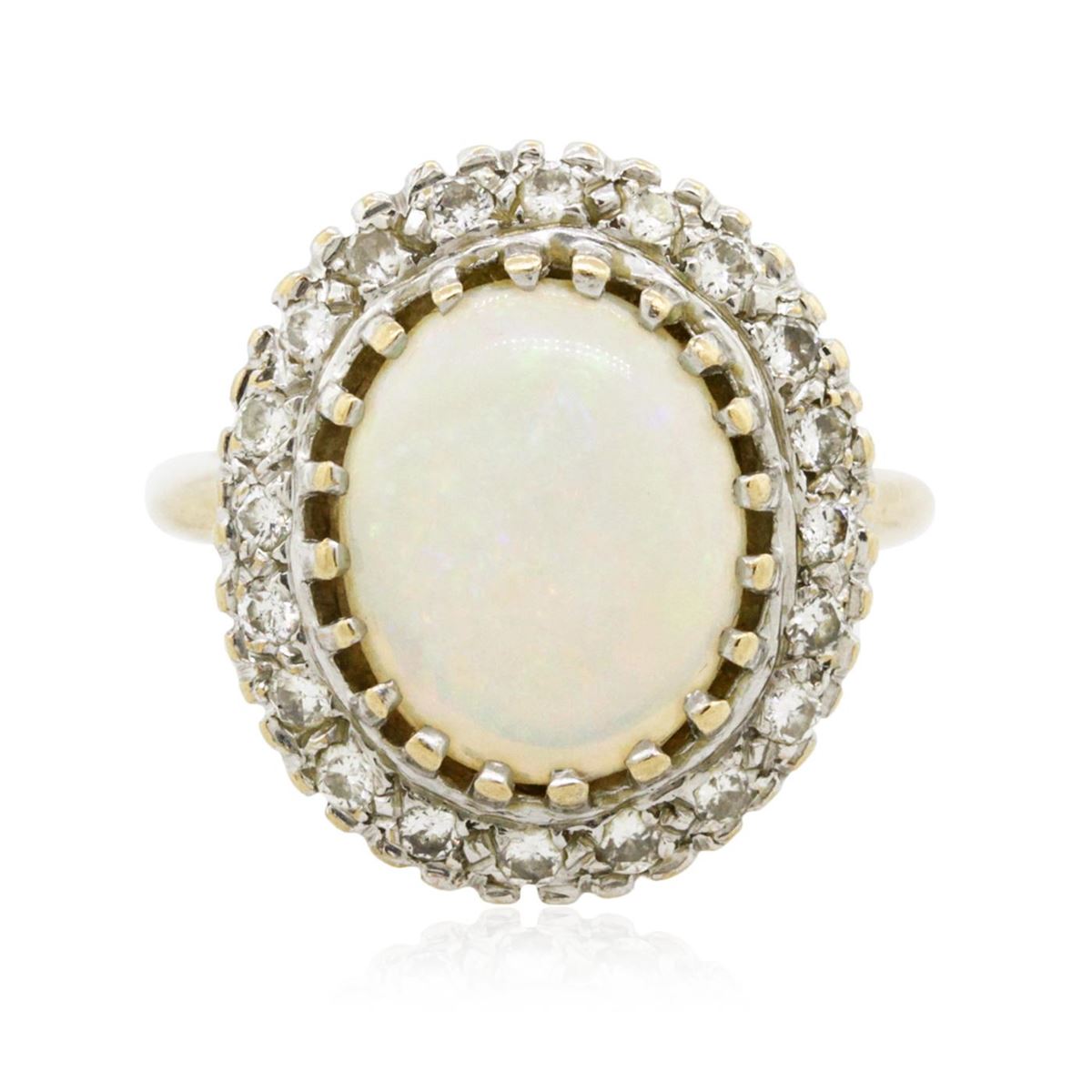 One electronically tested 14KT yellow gold ladies cast opal and diamond ring. The featured opal is set within a diamond bezel, completed by a one and one-half millimeter wide band. Bright polish finish with rhodium accents. Identified with markings of "14K". Condition is good. Containing: One crystal opal that is cut in a oval shaped cabochon and is prong set, measuring 12.00 mm long x 9.34 mm wide, and 3.55 mm thick and the approximate weight is 2.50 carats. The opal has a somewhat bright, multicolor play of color (fire) in a flashfire pattern; a medium dome; a good cut; slightly included; minor dull spot in its brightness and pattern; and is somewhat directional. Graded in the setting. Twenty prong set round brilliant cut diamonds, measuring 1.60 - 1.50 x 0.93mm (depth est.) approximate total weight of 20 Stones = 0.38ct. Graded in the setting. Clarity: VS-1 to VS-2. Color: G - I. Total Weight of Diamonds 0.38ct. Total Weight of Opals 2.50ct. Total Weight of Ring 6.06 grams. AIG Appraised at $3,050.00.