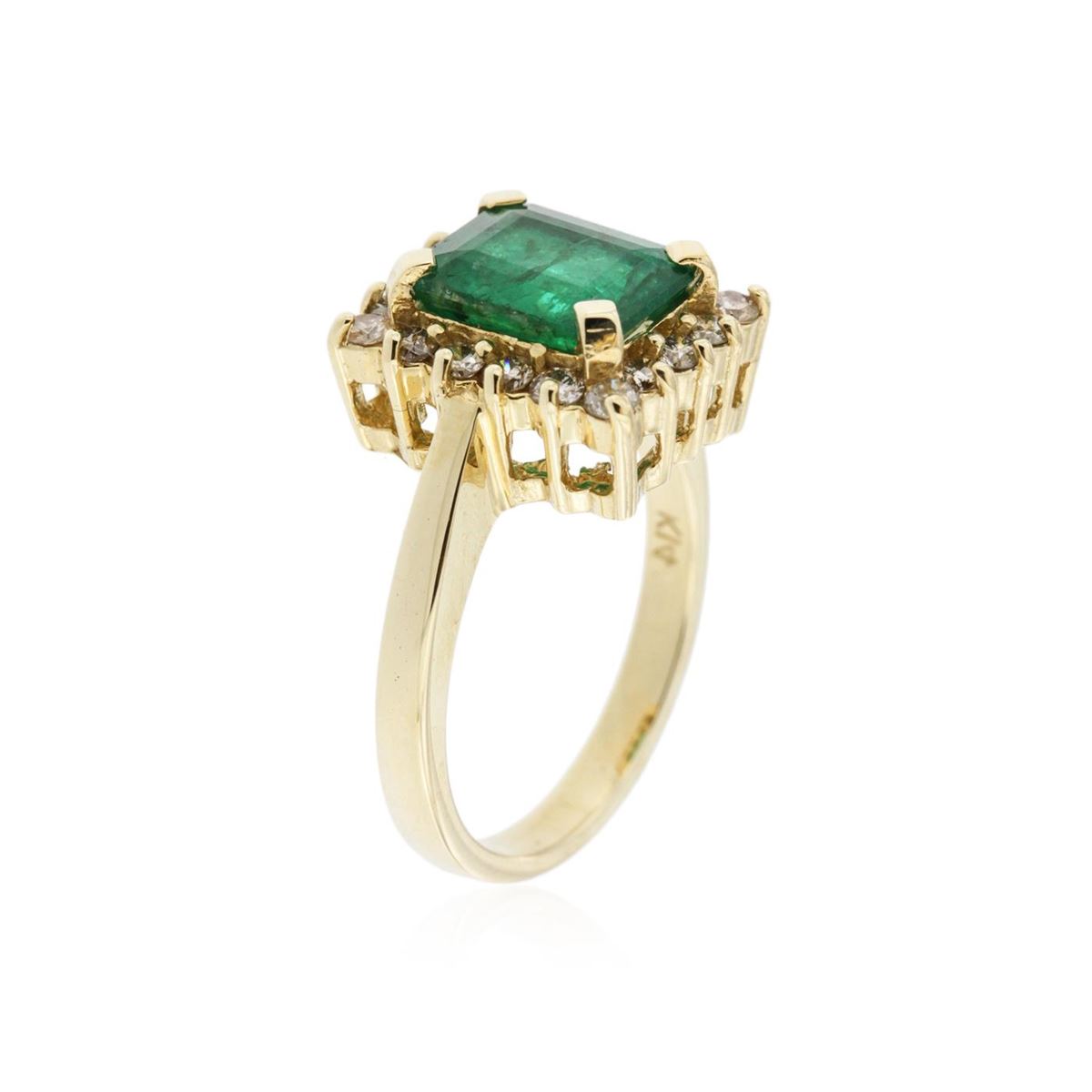One electronically tested 14KT yellow gold ladies cast emerald and diamond ring with a bright polish finish. The featured emerald is set within a diamond bezel, completed by a two and one-half millimeter wide band. Identified with markings of "K14". Condition is new, good workmanship. Containing: One prong set rectangular step cut natural emerald, measuring 9.00 x 7.40 x 4.60mm, approximate weight of 2.50ct., clarity is heavily included, type III, medium dark, very slightly grayish, very slightly bluish green color, (GIA vslbG 6/3), cut is good. Transmitting light with a minimum of distortion, transparent to translucent. Naturally occurring internal & external characteristics are present. Indications of oil, & opticon residue. Graded in the setting. Eighteen prong set round brilliant cut diamonds, measuring 2.00 - 2.00 x 1.20mm (depth est.) approximate. Total Weight of 18 Stones = 0.63ct. Graded in the setting. Clarity: SI-2 to I-1 . Color: H - J. Total Weight of Colored Stones 2.50ct. Total Weight of Diamonds 0.63ct. AIG Appraised at $5,625.00.