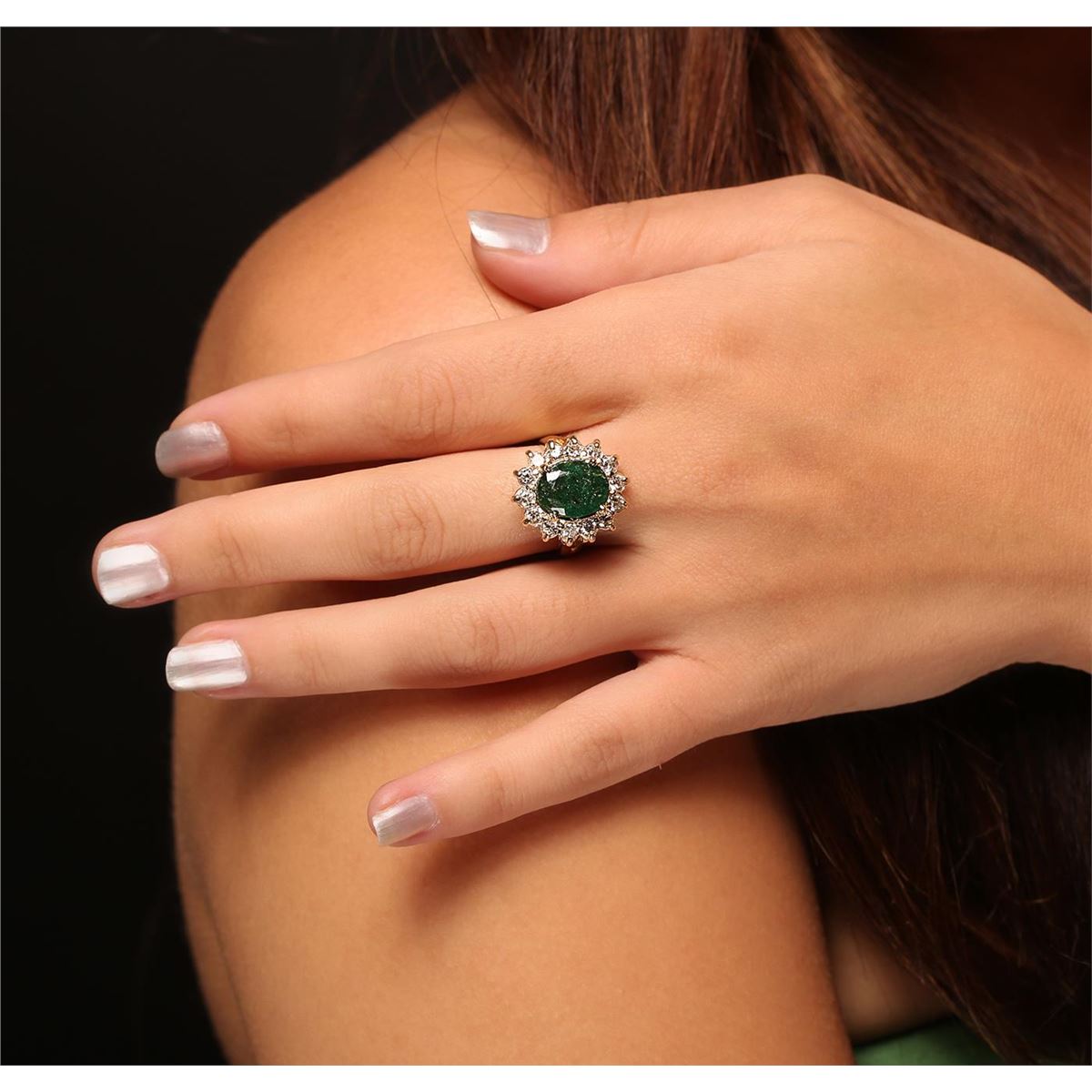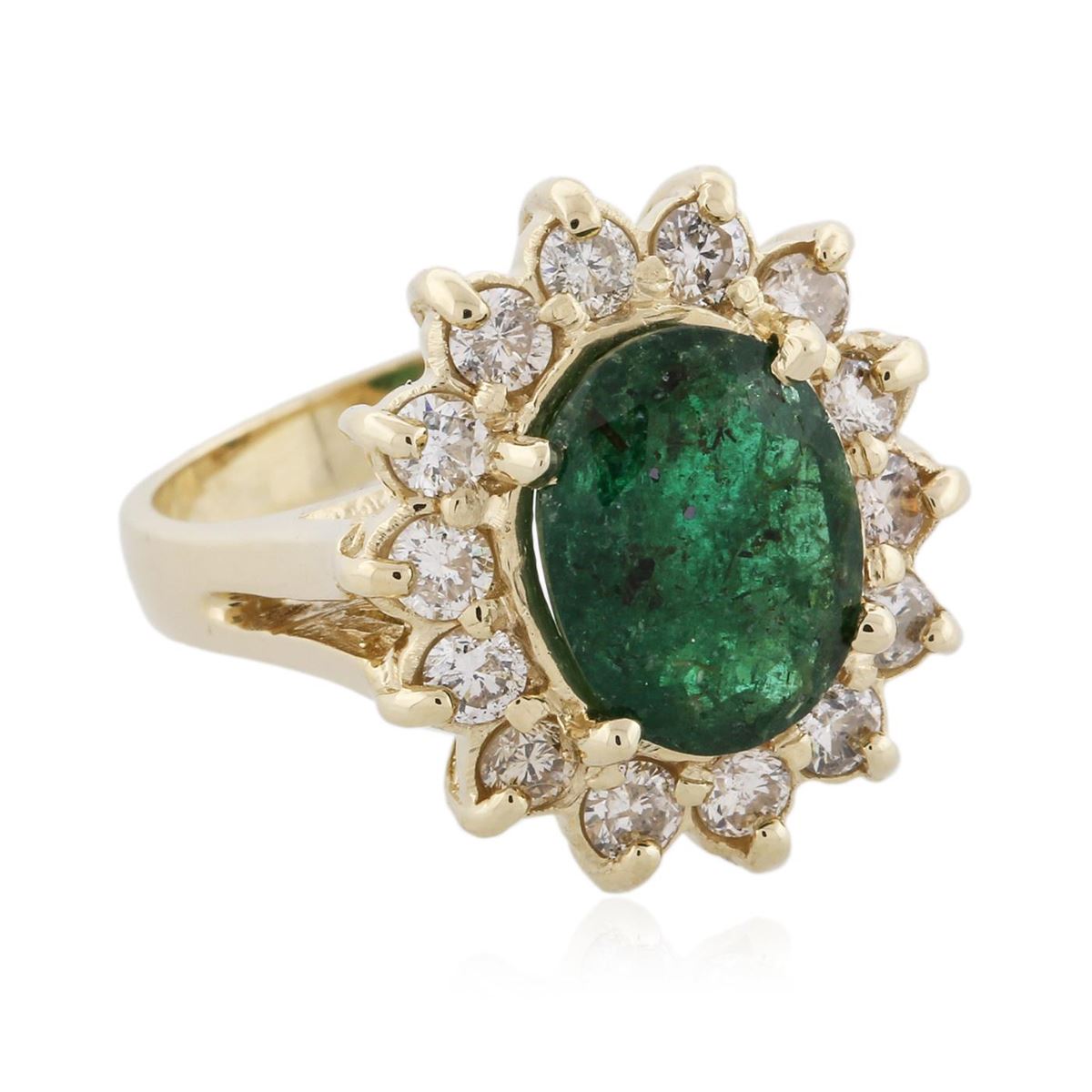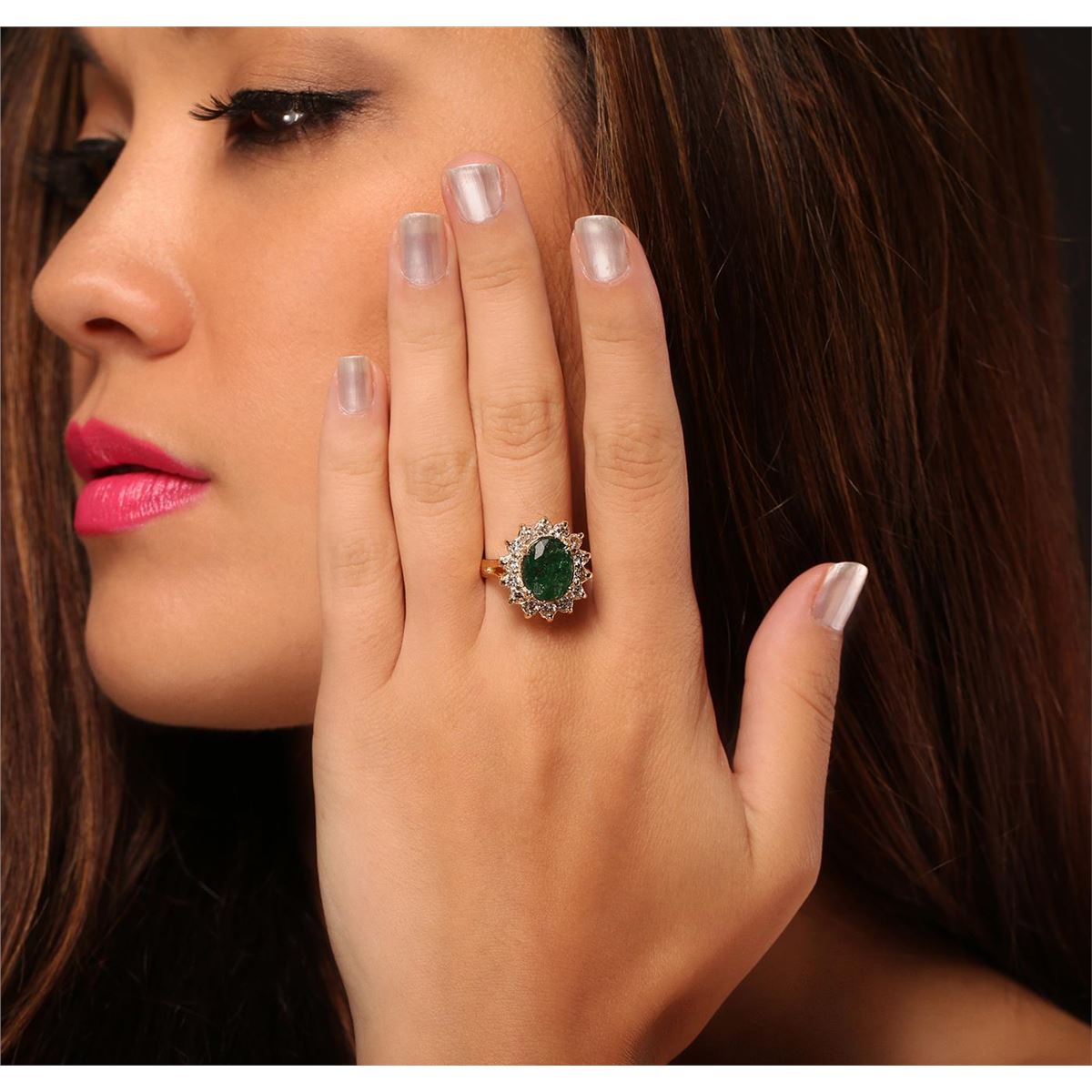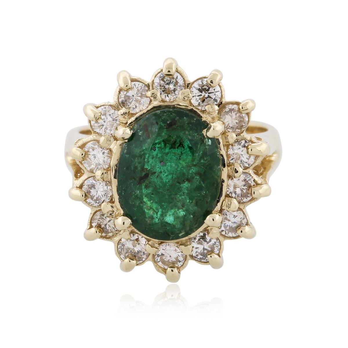 One electronically tested 14KT yellow gold Ladies combination cast & assembled fancy ring with a high polish finish. Condition is new. Containing: One prong set oval modified mixed cut natural emerald, measuring 11.00 x 8.50 x 5.00mm, approximate weight of 2.59ct., clarity is heavily included, type III, dark, moderately strong, green color, (GIA G 7/4), cut is good. Colored gemstones are presumed to have been subjected to commonly used and possible undetectable color/clarity enhancement processes. Fourteen prong set round brilliant cut diamonds, measuring 2.60 - 2.60 x 1.56mm (depth est.) approximate total weight of 14 Stones = 0.90ct. Clarity of SI-1 to I-1, Color of J - K, Cut is Good. Total Weight of Colored Stones 2.59ct. Total Weight of Diamonds 0.90ct. Total Weight of Ring 8.40 grams. GGL Appraised at $9,695.00.