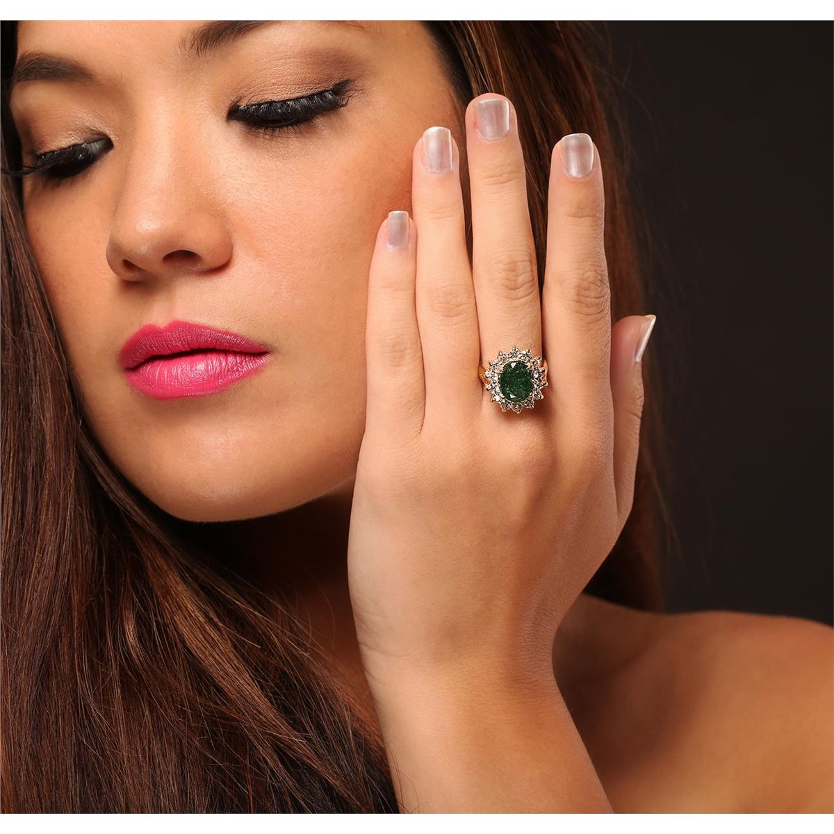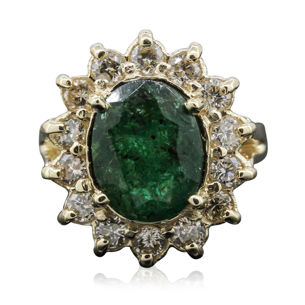 One electronically tested 14KT yellow gold Ladies combination cast & assembled fancy ring with a high polish finish. Condition is new. Containing: One prong set oval modified mixed cut natural emerald, measuring 11.00 x 8.50 x 5.00mm, approximate weight of 2.59ct., clarity is heavily included, type III, dark, moderately strong, green color, (GIA G 7/4), cut is good. Colored gemstones are presumed to have been subjected to commonly used and possible undetectable color/clarity enhancement processes. Fourteen prong set round brilliant cut diamonds, measuring 2.60 - 2.60 x 1.56mm (depth est.) approximate total weight of 14 Stones = 0.90ct. Clarity of SI-1 to I-1, Color of J - K, Cut is Good. Total Weight of Colored Stones 2.59ct. Total Weight of Diamonds 0.90ct. Total Weight of Ring 8.40 grams. GGL Appraised at $9,695.00.