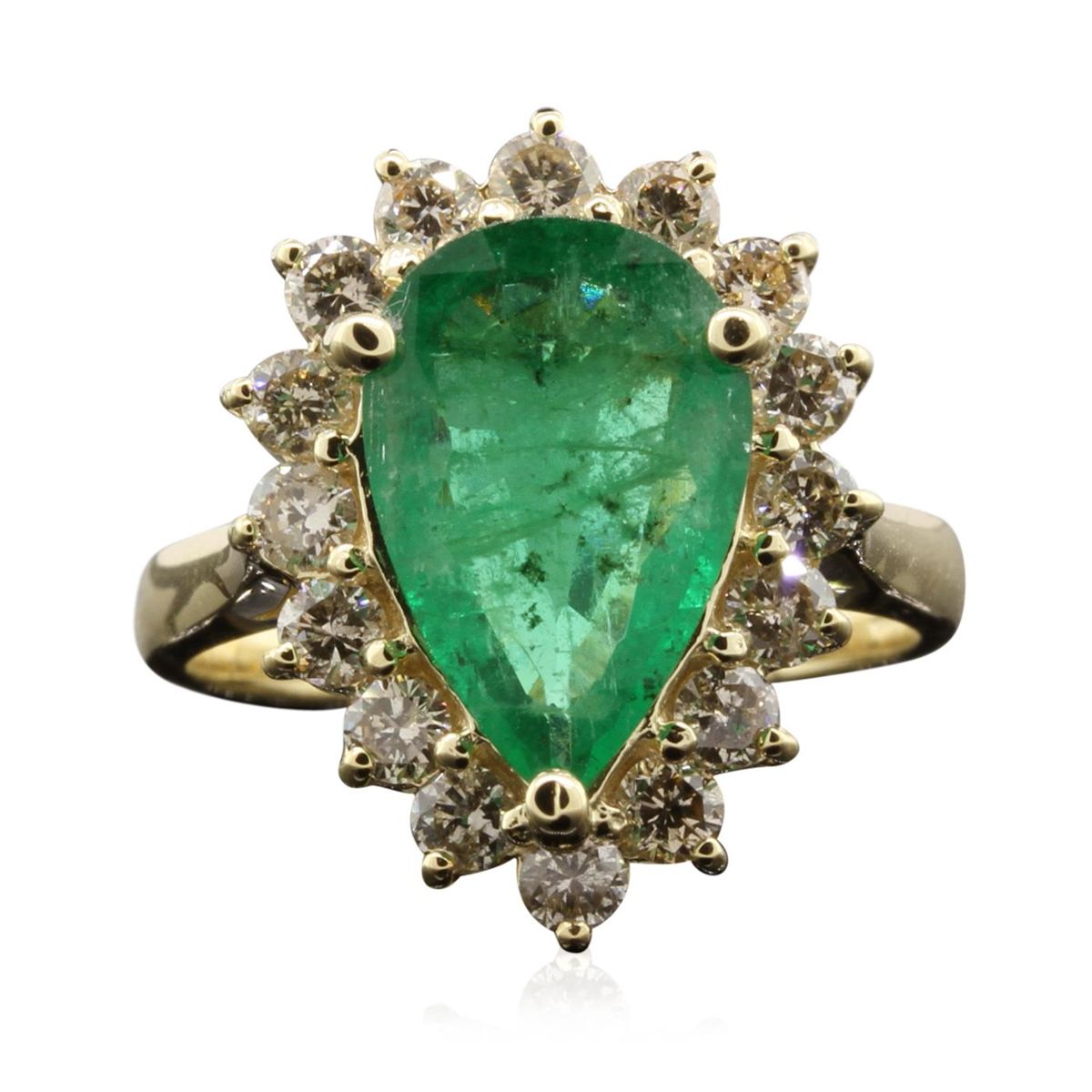 One electronically tested 14KT yellow gold ladies cast emerald and diamond ring with a bright polish finish. The featured emerald is set within a diamond bezel, completed by a two millimeter wide band. Identified with markings of "K14". Condition is new, good workmanship. Containing: One prong set pear mixed cut natural emerald, measuring 13.20 x 8.60 x 3.90mm, 8%. bulge factor, approximate weight of 2.60ct., clarity is heavily included, type III, medium dark, very slightly grayish, very slightly bluish green color, (GIA vslbG 6/3), cut is good. Transmitting light with a minimum of distortion, transparent to translucent. Naturally occurring internal & external characteristics are present. Indications of oil, & opticon residue. Graded in the setting. Sixteen prong set round brilliant cut diamonds, measuring 2.50 - 2.50 x 1.50mm (depth est.) approximate. Total Weight of 16 Stones = 1.01ct. Faint secondary color throughout. Graded in the setting. Clarity: SI-2 to I-1 . Color: I - K. Total Weight of Colored Stones 2.60ct. Total Weight of Diamonds 1.01ct. AIG Appraised at $7,275.00.