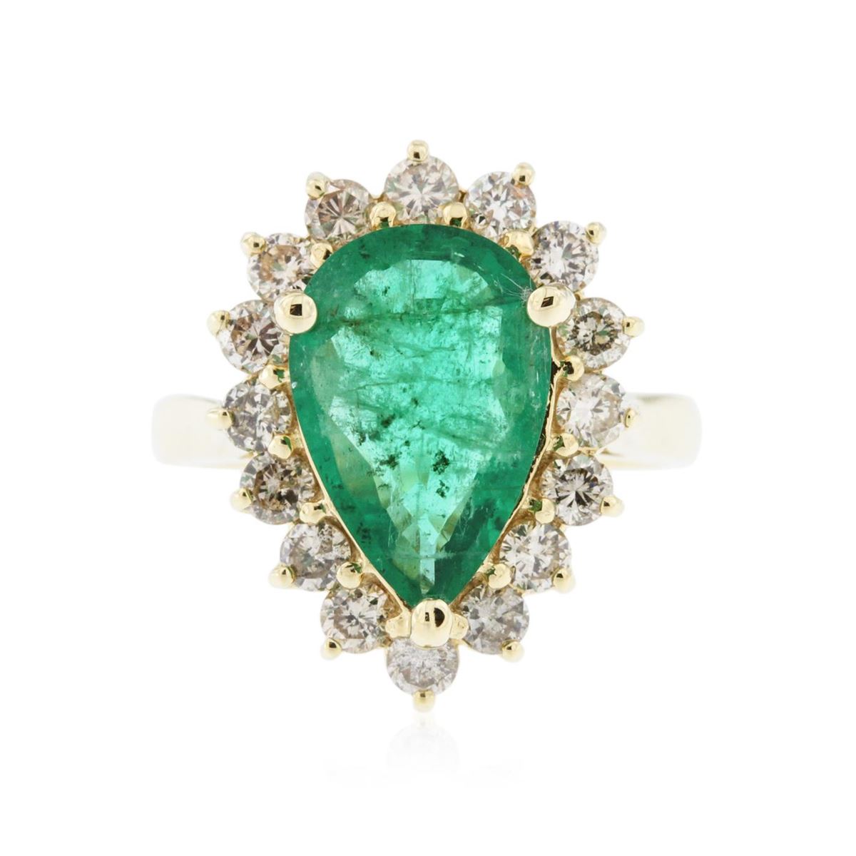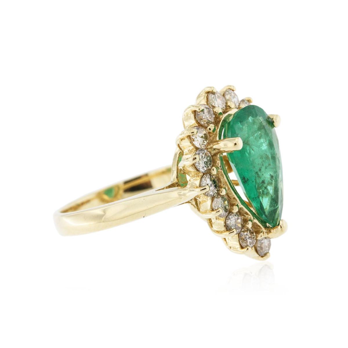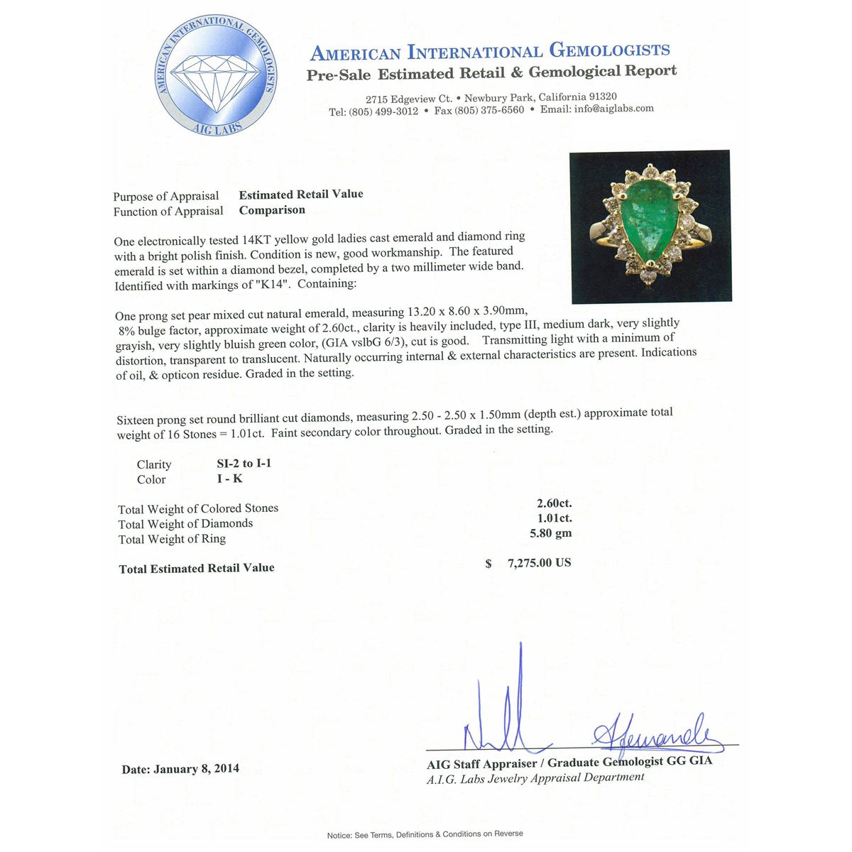 One electronically tested 14KT yellow gold ladies cast emerald and diamond ring with a bright polish finish. The featured emerald is set within a diamond bezel, completed by a two millimeter wide band. Identified with markings of "K14". Condition is new, good workmanship. Containing: One prong set pear mixed cut natural emerald, measuring 13.20 x 8.60 x 3.90mm, 8%. bulge factor, approximate weight of 2.60ct., clarity is heavily included, type III, medium dark, very slightly grayish, very slightly bluish green color, (GIA vslbG 6/3), cut is good. Transmitting light with a minimum of distortion, transparent to translucent. Naturally occurring internal & external characteristics are present. Indications of oil, & opticon residue. Graded in the setting. Sixteen prong set round brilliant cut diamonds, measuring 2.50 - 2.50 x 1.50mm (depth est.) approximate. Total Weight of 16 Stones = 1.01ct. Faint secondary color throughout. Graded in the setting. Clarity: SI-2 to I-1 . Color: I - K. Total Weight of Colored Stones 2.60ct. Total Weight of Diamonds 1.01ct. AIG Appraised at $7,275.00.