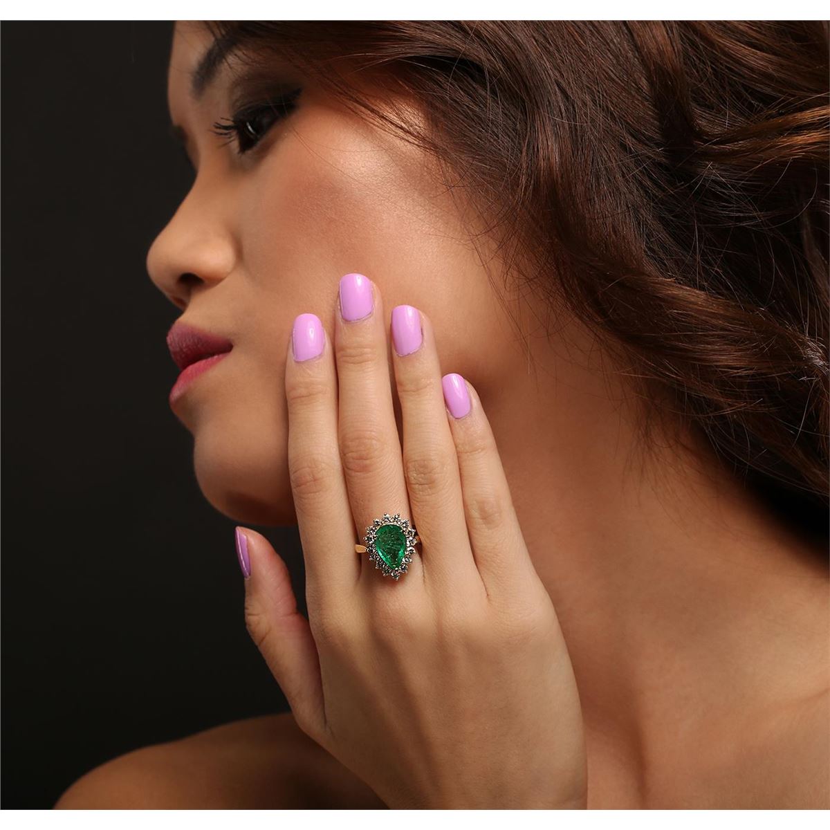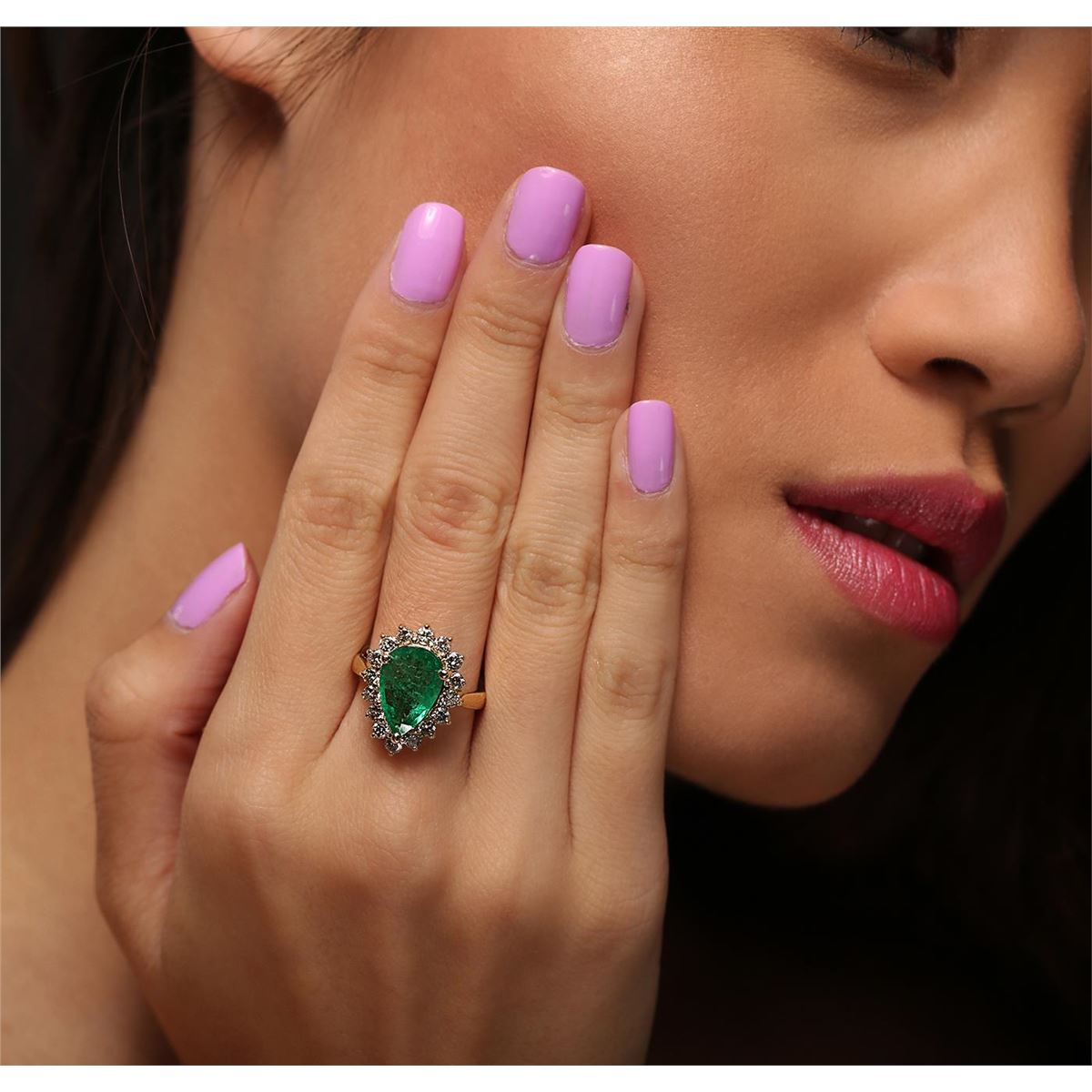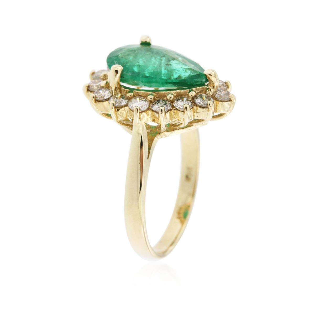 One electronically tested 14KT yellow gold ladies cast emerald and diamond ring with a bright polish finish. The featured emerald is set within a diamond bezel, completed by a two millimeter wide band. Identified with markings of "K14". Condition is new, good workmanship. Containing: One prong set pear mixed cut natural emerald, measuring 13.20 x 8.60 x 3.90mm, 8%. bulge factor, approximate weight of 2.60ct., clarity is heavily included, type III, medium dark, very slightly grayish, very slightly bluish green color, (GIA vslbG 6/3), cut is good. Transmitting light with a minimum of distortion, transparent to translucent. Naturally occurring internal & external characteristics are present. Indications of oil, & opticon residue. Graded in the setting. Sixteen prong set round brilliant cut diamonds, measuring 2.50 - 2.50 x 1.50mm (depth est.) approximate. Total Weight of 16 Stones = 1.01ct. Faint secondary color throughout. Graded in the setting. Clarity: SI-2 to I-1 . Color: I - K. Total Weight of Colored Stones 2.60ct. Total Weight of Diamonds 1.01ct. AIG Appraised at $7,275.00.