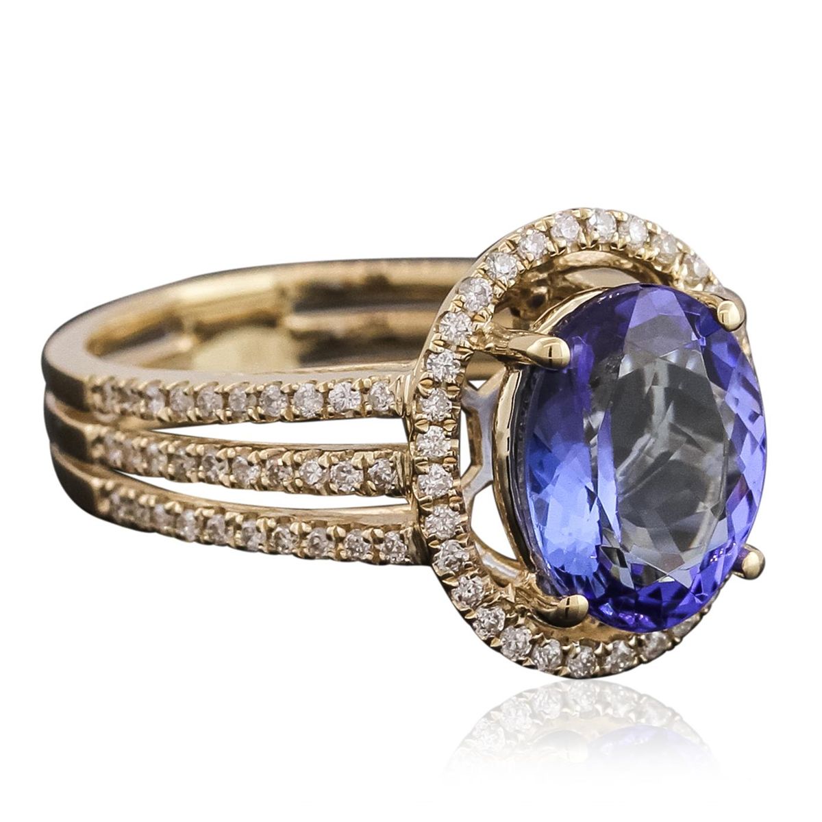 One electronically tested 14KT yellow gold ladies combination cast & assembled tanzanite and diamond ring with a split shank with a bright polish finish. Identified with markings of "14K". Condition is new. Containing: One prong set oval modified brilliant cut natural tanzanite, measuring 10.13 x 8.21 x 4.62mm, approximate weight of 2.60ct., clarity is eye clean, type I, medium, moderately strong, violet color, (GIA V 5/4), cut is good. Ninety prong set round brilliant cut diamonds, measuring 1.10 - 1.10 x 0.66mm (depth est.) approximate total weight of 90 Stones = 0.43ct. Clarity: I-1 to I-2. Color: J - K, Cut is Good. Colored gemstones are presumed to have been subjected to commonly used enhancement processes. All diamonds and colored gemstones are graded in the mounting, unless otherwise stated total weight of Colored Stones 2.60ct. Total Weight of Diamonds 0.43ct. Total Weight of Ring 4.90 grams. GGL Appraised at $6,270.00.