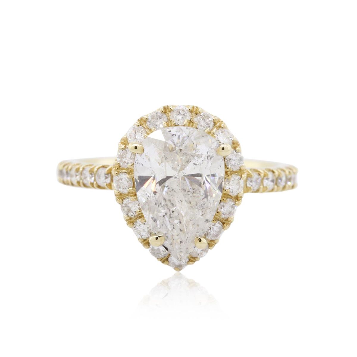 One electronically tested 14KT yellow gold ladies combination cast & assembled engagement ring with a flat shank with a bright polish finish. Identified with markings of "14K". Condition is new. Containing: One prong set pear shaped cut diamond, measuring 11.11 x 7.37 x 4.54mm (depth est.) approximate weight of 2.19ct. Clarity: I-2. Color: H, Cut is Good. Thirty prong set round brilliant cut diamonds, measuring 1.60 - 1.50 x 0.93mm (depth est.) approximate total weight of 30 Stones = 0.41ct. Clarity: I-1 to I-2. Color: I - J, Cut is Good. All diamonds are graded in the mounting, unless otherwise stated. Total Weight of Diamonds 2.60ct. Total Weight of Ring 3.70 grams. GGL Appraised at $18,770.00.