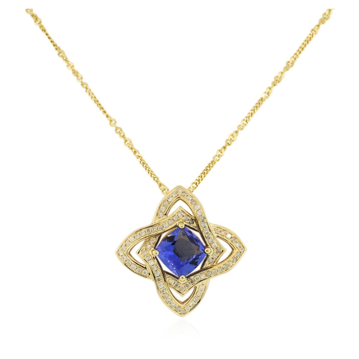 One electronically tested 14KT yellow gold ladies cast & assembled tanzanite and diamond pendant with chain. The pendant features a tanzanite set within intertwining diamond ribbons, completed by a hidden bail. The pendant is supported by an eighteen inch length 14KT yellow gold designer style chain, terminating in a spring ring clasp. Bright polish finish with milgrain detailing throughout. Trademark is Orianne. Identified with markings of "14K". Condition is new, good workmanship. Containing: One prong set square cushion brilliant cut natural tanzanite, measuring 8.50 x 8.40 x 4.40mm, 6% bulge factor, approximate weight of 2.62ct., clarity is eye clean, type I, medium dark, very slightly grayish, violetish blue color, (GIA vB 6/3), cut is good. Transmitting light with no distortion, transparent. Graded in the setting. Tanzanite is a very rare gemstone that is only found in the country of Tanzania. Originally discovered in 1967. Tiffany & Company, named the stone Tanzanite. It is found in the Usumburu Mountains that border the Umba Valley of northern Tanzania. Tanzanite occurs in gray, brown, violet, blue, reddish-purple, & green. The gem is interesting because of its exceptional pleochroism. Rotated in different directions a tanzanite will exhibit multiple changes of color. Tanzanite has a low tolerance to ultrasonic cleaning, and should not be cleaned using this method. Eighty prong set round brilliant cut diamonds, measuring 1.20 - 1.10 x 0.69mm (depth est.) approximate total weight of 80 Stones = 0.55ct. Graded in the setting. Clarity: I-1 to I-3. Color: H - J. Total Weight of Colored Stones 2.62ct. Total Weight of Diamonds 0.55ct. Total Weight of Pendant With Chain 8.25 grams. AIG Appraised at $8,765.00.