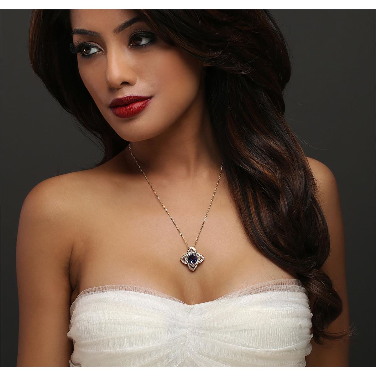 One electronically tested 14KT yellow gold ladies cast & assembled tanzanite and diamond pendant with chain. The pendant features a tanzanite set within intertwining diamond ribbons, completed by a hidden bail. The pendant is supported by an eighteen inch length 14KT yellow gold designer style chain, terminating in a spring ring clasp. Bright polish finish with milgrain detailing throughout. Trademark is Orianne. Identified with markings of "14K". Condition is new, good workmanship. Containing: One prong set square cushion brilliant cut natural tanzanite, measuring 8.50 x 8.40 x 4.40mm, 6% bulge factor, approximate weight of 2.62ct., clarity is eye clean, type I, medium dark, very slightly grayish, violetish blue color, (GIA vB 6/3), cut is good. Transmitting light with no distortion, transparent. Graded in the setting. Tanzanite is a very rare gemstone that is only found in the country of Tanzania. Originally discovered in 1967. Tiffany & Company, named the stone Tanzanite. It is found in the Usumburu Mountains that border the Umba Valley of northern Tanzania. Tanzanite occurs in gray, brown, violet, blue, reddish-purple, & green. The gem is interesting because of its exceptional pleochroism. Rotated in different directions a tanzanite will exhibit multiple changes of color. Tanzanite has a low tolerance to ultrasonic cleaning, and should not be cleaned using this method. Eighty prong set round brilliant cut diamonds, measuring 1.20 - 1.10 x 0.69mm (depth est.) approximate total weight of 80 Stones = 0.55ct. Graded in the setting. Clarity: I-1 to I-3. Color: H - J. Total Weight of Colored Stones 2.62ct. Total Weight of Diamonds 0.55ct. Total Weight of Pendant With Chain 8.25 grams. AIG Appraised at $8,765.00.
