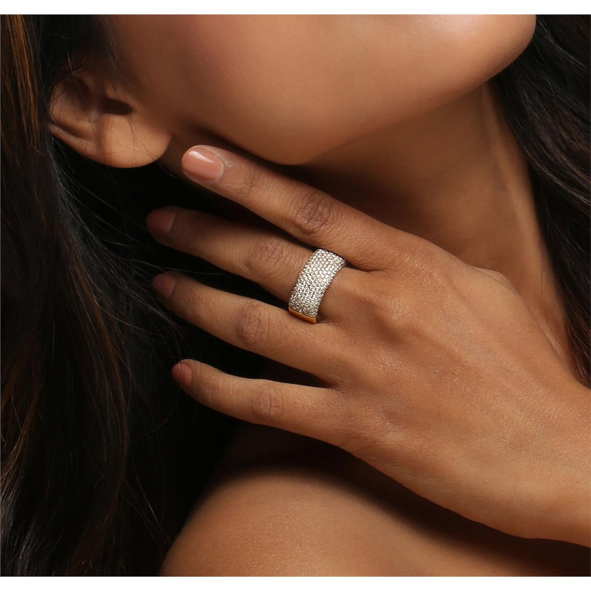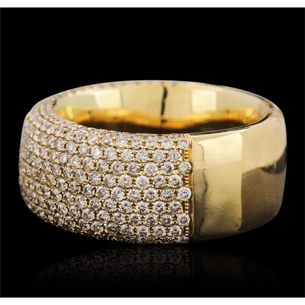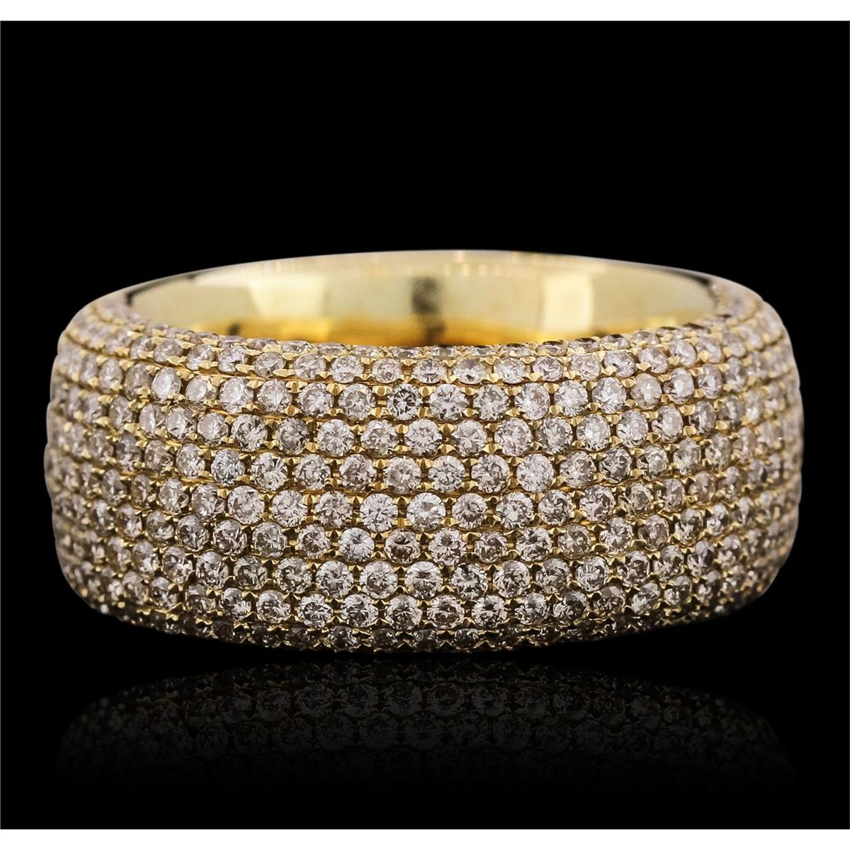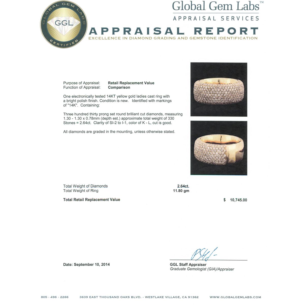 One electronically tested 14KT yellow gold ladies cast ring with a bright polish finish. Identified with markings of "14K". Condition is new. Containing: Three Hundred Thirty prong set round brilliant cut diamonds, measuring 1.30 - 1.30 x 0.78mm (depth est.) approximate total weight of 330 Stones = 2.64ct. Clarity: SI-2 to I-1. Color: K - L, Cut is Good. All diamonds are graded in the mounting, unless otherwise stated. Total Weight of Diamonds 2.64ct. Total Weight of Ring 11.80 grams. GGL Appraised at $10,745.00.