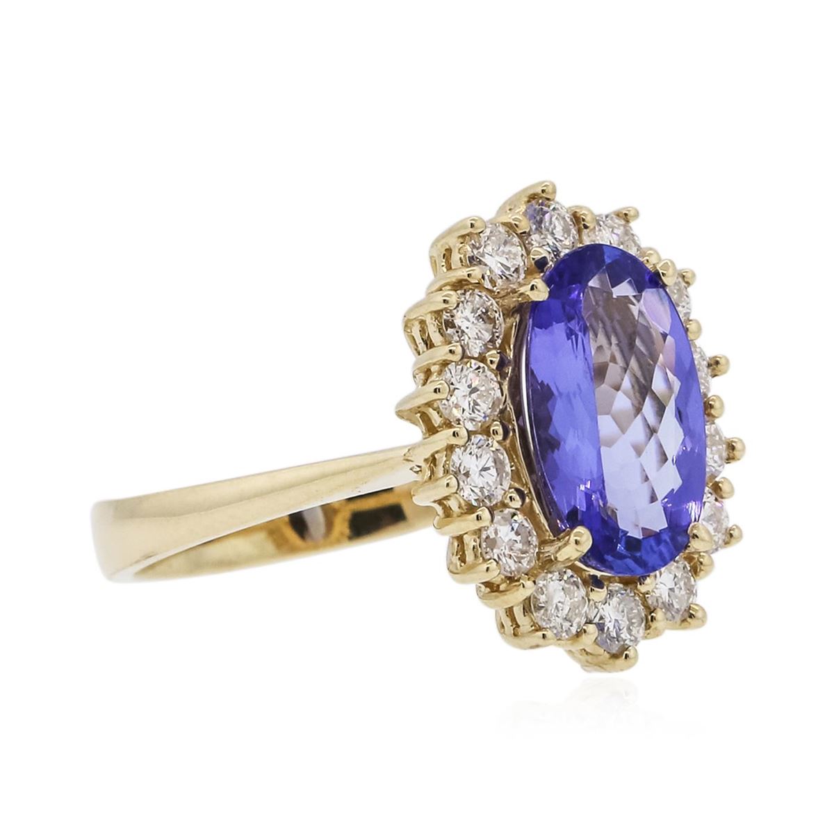 One electronically tested 14KT yellow gold ladies cast tanzanite and diamond ring with a bright polish finish. The featured tanzanite is set within a diamond bezel supported by tapering shoulders, completed by a three millimeter wide band. Identified with markings of "14K". Condition is new, good workmanship. Containing: One prong set oval mixed cut natural tanzanite, measuring 11.95 x 7.49 x 3.90mm, 8% bulge factor, approximate weight of 2.67ct., clarity is eye clean, type I, medium dark, very slightly grayish, bluish violet color, (GIA bV 6/3), cut is good. Transmitting light with no distortion, transparent. Graded in the setting. Tanzanite is a very rare gemstone that is only found in the country of Tanzania. Originally discovered in 1967. Tiffany & Company, named the stone Tanzanite. It is found in the Usumburu Mountains that border the Umba Valley of northern Tanzania. Tanzanite occurs in gray, brown, violet, blue, reddish-purple, & green. The gem is interesting because of its exceptional pleochroism. Rotated in different directions a tanzanite will exhibit multiple changes of color. Tanzanite has a low tolerance to ultrasonic cleaning, and should not be cleaned using this method. Fourteen prong set round brilliant cut diamonds, measuring 2.65 - 2.55 x 1.56mm (depth est.) approximate total weight of 14 Stones = 1.00ct. Graded in the setting. Clarity: SI-1 to I-1. Color: G - I. Total Weight of Colored Stones 2.67ct. Total Weight of Diamonds 1.00ct. Total Weight of Ring 5.67 grams. AIG Appraised at $9,855.00.