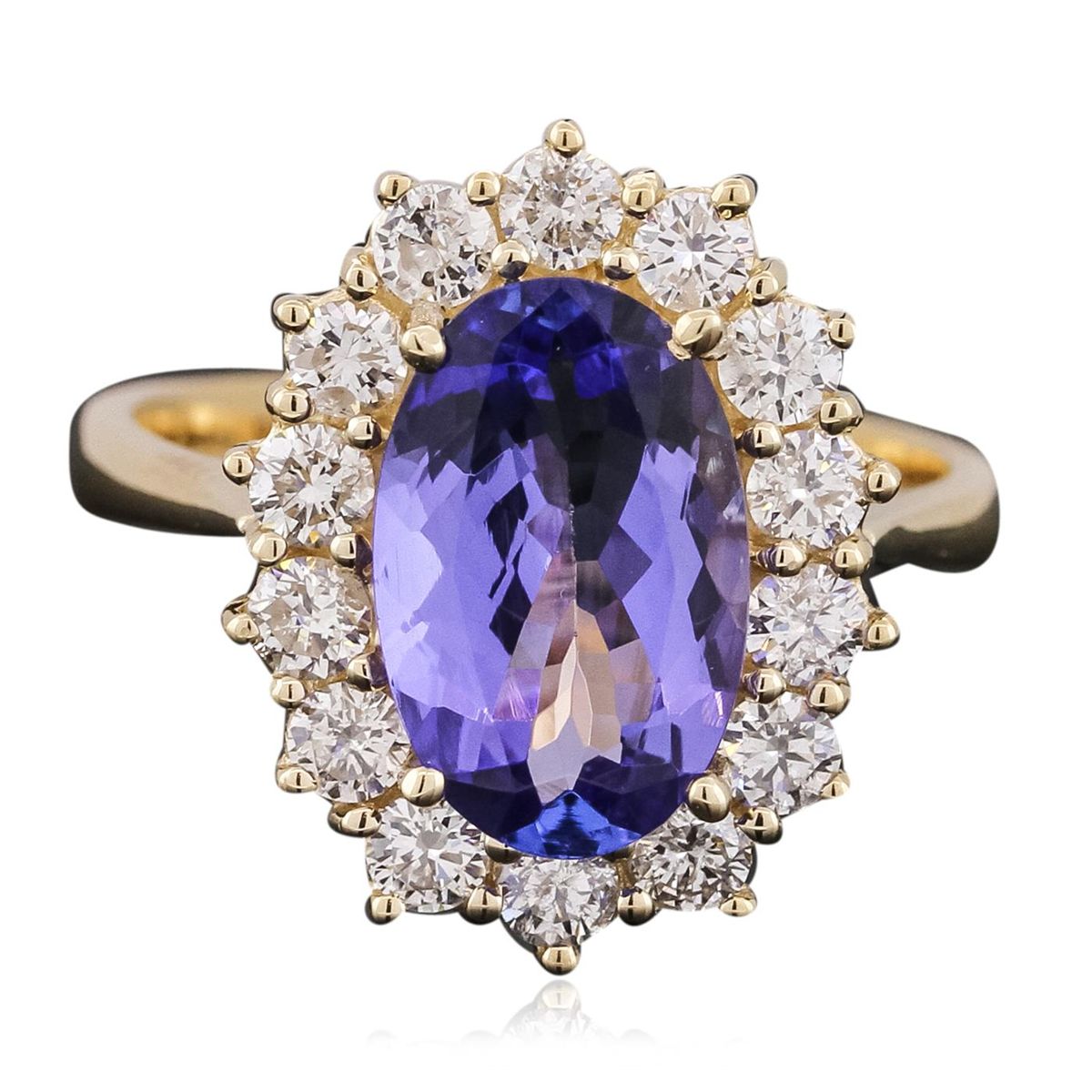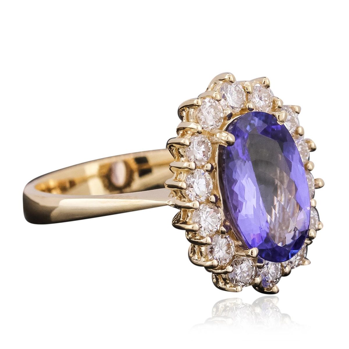 One electronically tested 14KT yellow gold ladies cast tanzanite and diamond ring with a bright polish finish. The featured tanzanite is set within a diamond bezel supported by tapering shoulders, completed by a three millimeter wide band. Identified with markings of "14K". Condition is new, good workmanship. Containing: One prong set oval mixed cut natural tanzanite, measuring 11.95 x 7.49 x 3.90mm, 8% bulge factor, approximate weight of 2.67ct., clarity is eye clean, type I, medium dark, very slightly grayish, bluish violet color, (GIA bV 6/3), cut is good. Transmitting light with no distortion, transparent. Graded in the setting. Tanzanite is a very rare gemstone that is only found in the country of Tanzania. Originally discovered in 1967. Tiffany & Company, named the stone Tanzanite. It is found in the Usumburu Mountains that border the Umba Valley of northern Tanzania. Tanzanite occurs in gray, brown, violet, blue, reddish-purple, & green. The gem is interesting because of its exceptional pleochroism. Rotated in different directions a tanzanite will exhibit multiple changes of color. Tanzanite has a low tolerance to ultrasonic cleaning, and should not be cleaned using this method. Fourteen prong set round brilliant cut diamonds, measuring 2.65 - 2.55 x 1.56mm (depth est.) approximate total weight of 14 Stones = 1.00ct. Graded in the setting. Clarity: SI-1 to I-1. Color: G - I. Total Weight of Colored Stones 2.67ct. Total Weight of Diamonds 1.00ct. Total Weight of Ring 5.67 grams. AIG Appraised at $9,855.00.