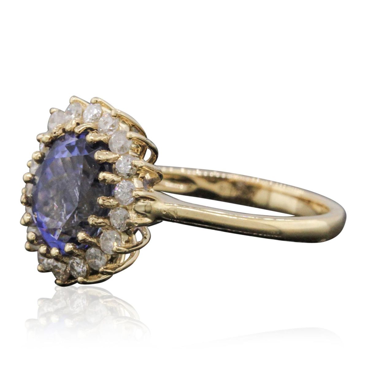 One electronically tested 14KT yellow gold ladies cast tanzanite and diamond ring. The featured tanzanite is set within a diamond bezel, completed by a two millimeter wide band. Trademark is Orianne. Identified with markings of "14K". Condition is new, good workmanship. Containing: One prong set oval brilliant cut natural tanzanite, measuring 9.20 x 7.20 x 5.60mm, 6% bulge factor, approximate weight of 2.67ct., clarity is eye clean, type I, medium dark, very slightly grayish, bluish violet color, (GIA bV 6/3), cut is good. Transmitting light with no distortion, transparent. Graded in the setting. Tanzanite is a very rare gemstone that is only found in the country of Tanzania. Originally discovered in 1967. Tiffany & Company, named the stone Tanzanite. It is found in the Usumburu Mountains that border the Umba Valley of northern Tanzania. Tanzanite occurs in gray, brown, violet, blue, reddish-purple, & green. The gem is interesting because of its exceptional pleochroism. Rotated in different directions a tanzanite will exhibit multiple changes of color. Tanzanite has a low tolerance to ultrasonic cleaning, and should not be cleaned using this method. Eighteen prong set round brilliant cut diamonds, measuring 1.90 - 1.80 x 1.11mm (depth est.) approximate total weight of 18 Stones = 0.51ct. Graded in the setting. Clarity: I-1 to I-2. Color: G - I. Total Weight of Colored Stones 2.67ct. Total Weight of Diamonds 0.51ct. Total Weight of Ring 3.26 grams. AIG Appraised at $7,630.00.