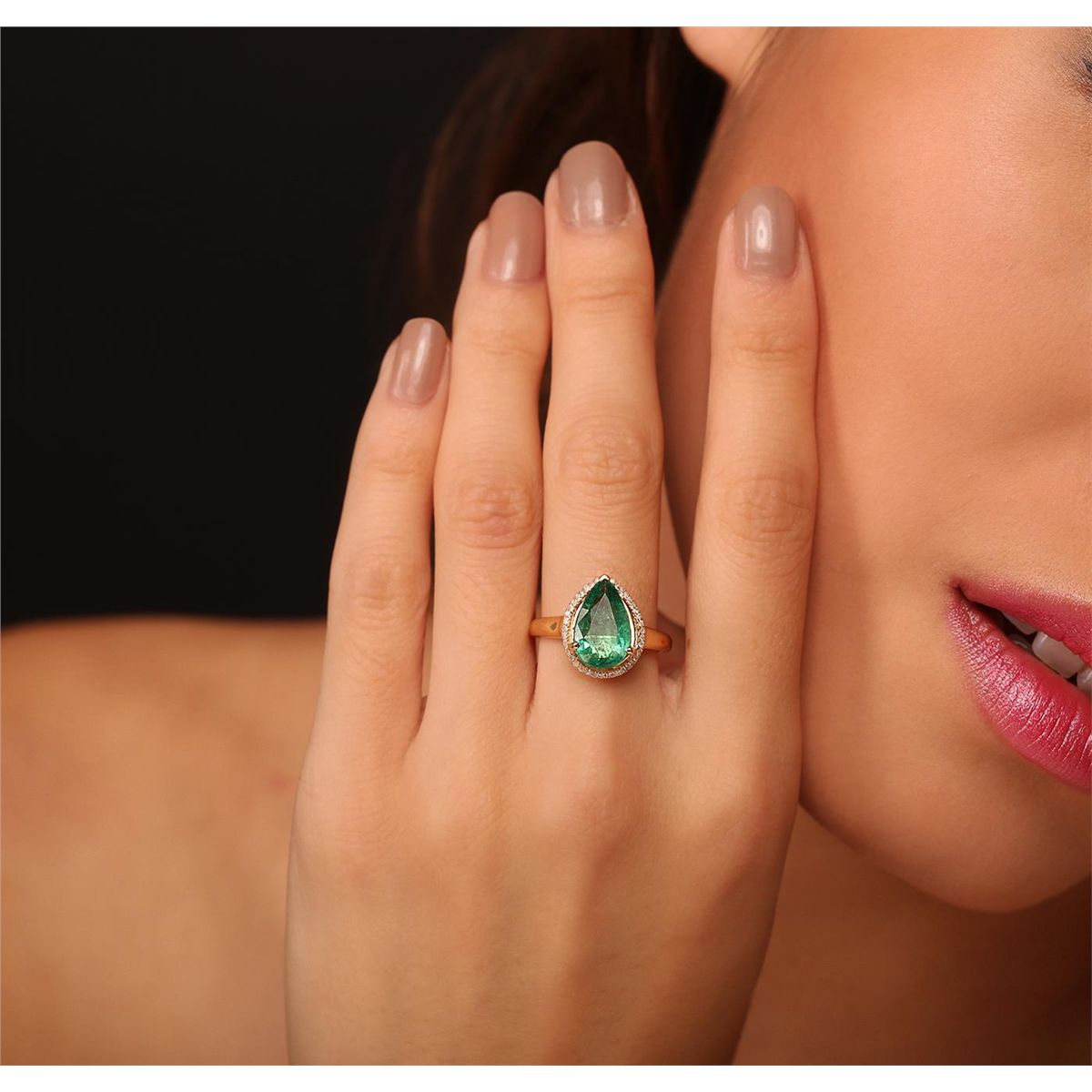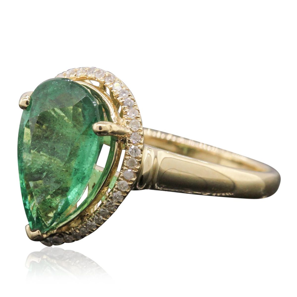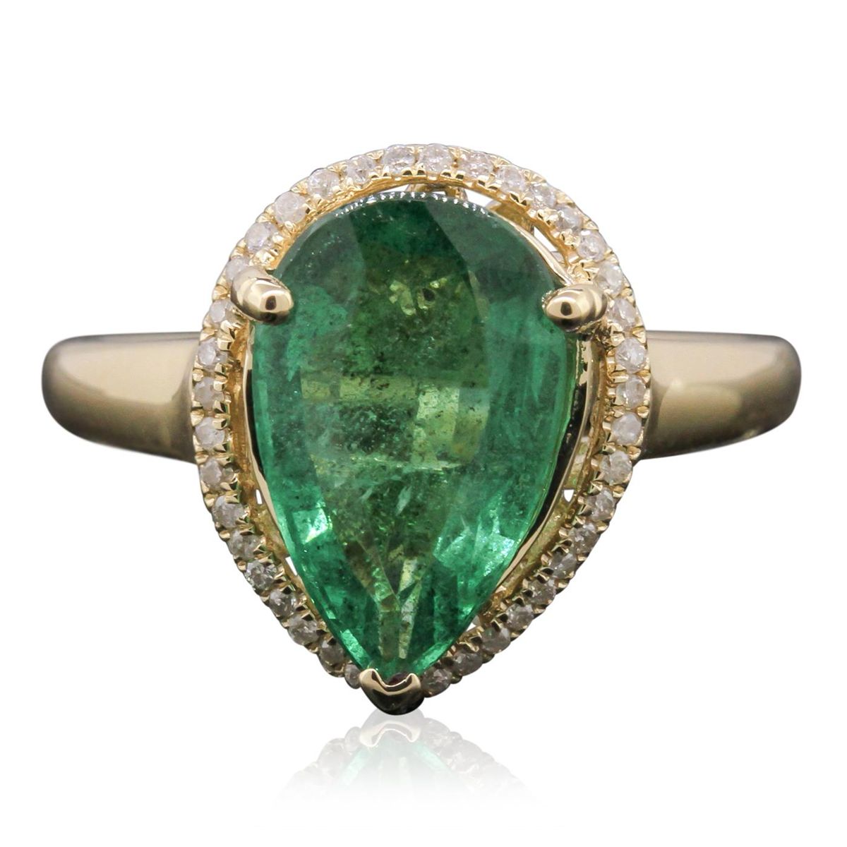 One electronically tested 14KT yellow gold ladies cast emerald and diamond ring with a bright polish finish. The emerald is set within a diamond bezel supported by tapering shoulders, completed by a one and one-half millimeter wide band. Trademark is Orianne. Identified with markings of "14K". Condition is new, good workmanship. Containing: One prong set pear mixed cut natural emerald, measuring 13.00 x 7.80 x 4.50mm, 8%. bulge factor, approximate weight of 2.68ct., clarity is heavily included, type III, medium dark, moderately strong, very slightly bluish green color, (GIA vslbG 6/4), cut is good. Transmitting light with a minimum of distortion, transparent. Naturally occurring internal & external characteristics are present. Indications of oil residue. Graded in the setting. Thirty-Nine prong set round brilliant cut diamonds, measuring 1.10 - 1.00 x 0.63mm (depth est.) approximate. Total Weight of 39 Stones = 0.26ct. Graded in the setting. Clarity: I-1 to I-2 . Color: G - I. Total Weight of Colored Stones 2.68ct. Total Weight of Diamonds 0.26ct. Total Weight of Ring 3.69gm. AIG Appraised at $6,925.00.