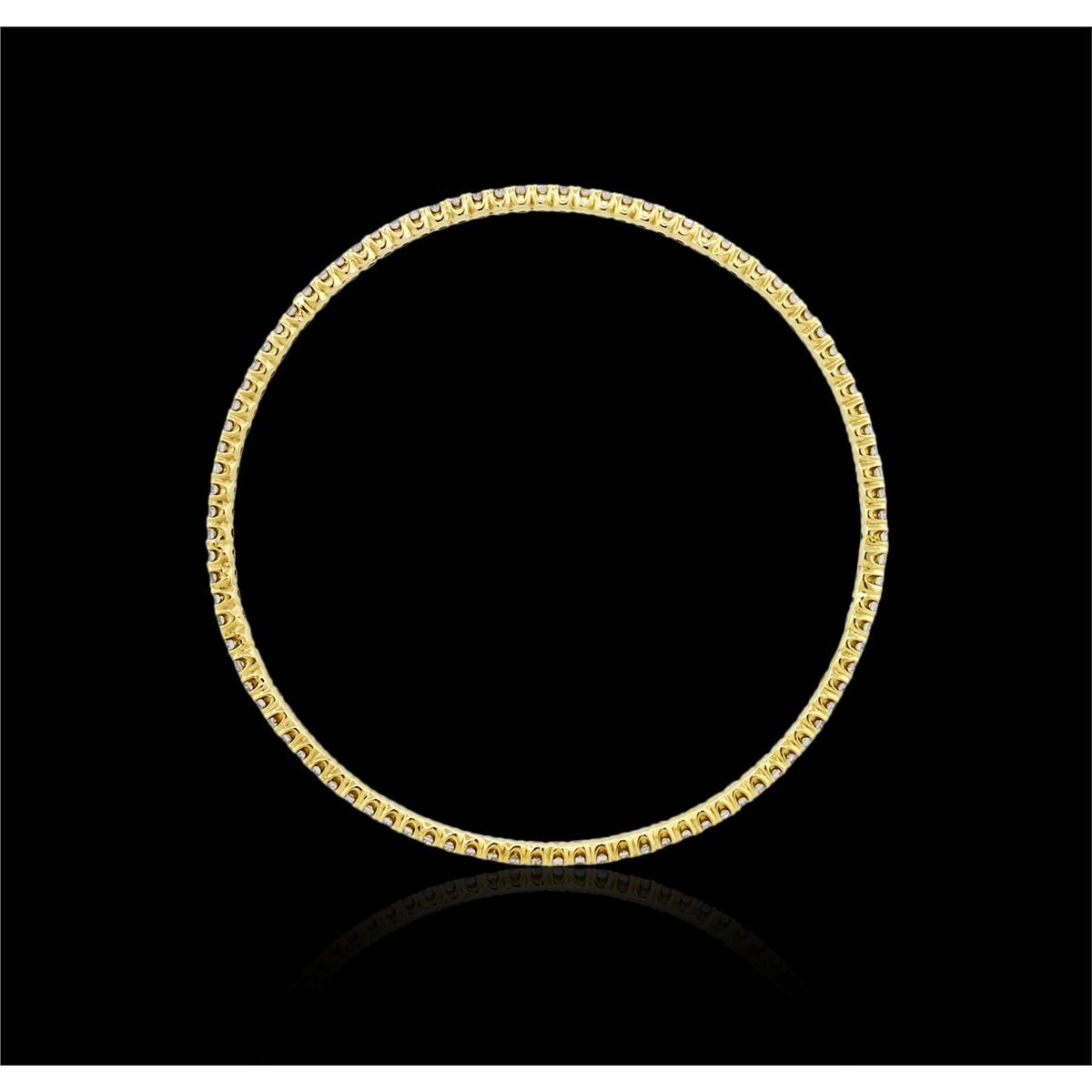 One electronically tested 14KT yellow gold ladies cast diamond bangle with a bright polish finish. Seven and one-half inch wearable length bangle features a two and one-half millimeter wide continuous diamond ribbon. Condition is new, good workmanship. Containing: Ninety-Five prong set round brilliant cut diamonds, measuring 2.00 - 1.90 x 1.17mm (depth est.) approximate total weight of 95 Stones = 2.70ct. Graded in the setting. Clarity: VS-2 to SI-2. Color: H - J. Total Weight of Diamonds 2.70ct. Total Weight of Bangle 9.81 grams. AIG Appraised at $10,705.00.