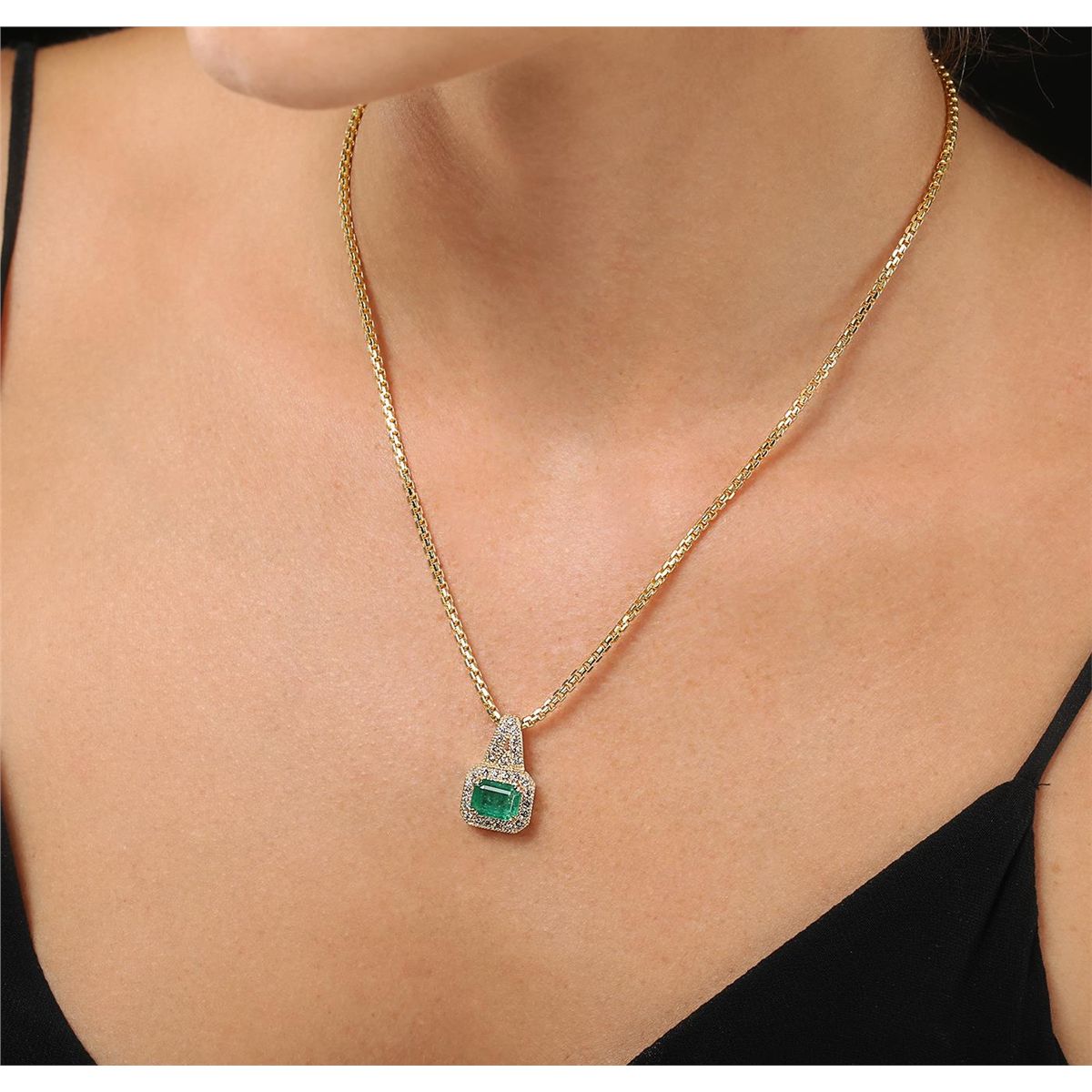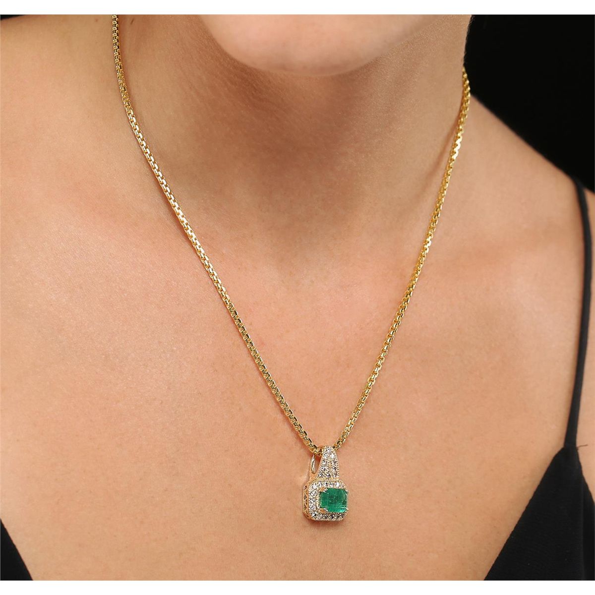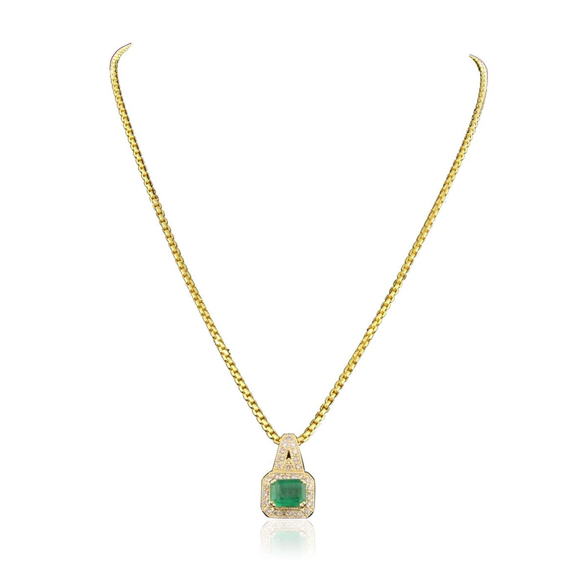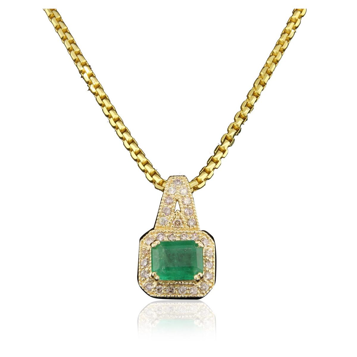 One electronically tested 14KT yellow gold ladies cast & assembled emerald and diamond pendant with chain. Condition is new, good workmanship. The pendant features an emerald set within a diamond bezel, completed by a diamond set bail. The pendant is supported by an eighteen inch length 14KT yellow gold designer style chain terminating in a spring ring clasp. Bright polish finish, with milgrain detailing throughout. Identified with markings of "14K". Containing: One prong set rectangular step cut natural emerald, measuring 9.20 x 7.00 x 5.45mm, approximate weight of 2.73ct., clarity is heavily included, type III, medium dark, very slightly grayish, very slightly bluish green color, (GIA vslbG 6/3), cut is good. Transmitting light with a minimum of distortion, transparent to translucent. Naturally occurring internal & external characteristics are present. Indications of oil residue. Graded in the setting. Twenty-Eight bead set round brilliant cut diamonds, measuring 1.70 - 1.60 x 0.99mm (depth est.), 0.58%. GTCF approximate. Total Weight of 28 Stones = 0.58ct. Graded in the setting. Clarity: SI-2 to I-1. Color: H - J. Total Weight of Colored Stones 2.73ct. Total Weight of Diamonds 0.58ct. Total Weight of Pendant With Chain 10.50gm. AIG Appraised at $7,700.00.