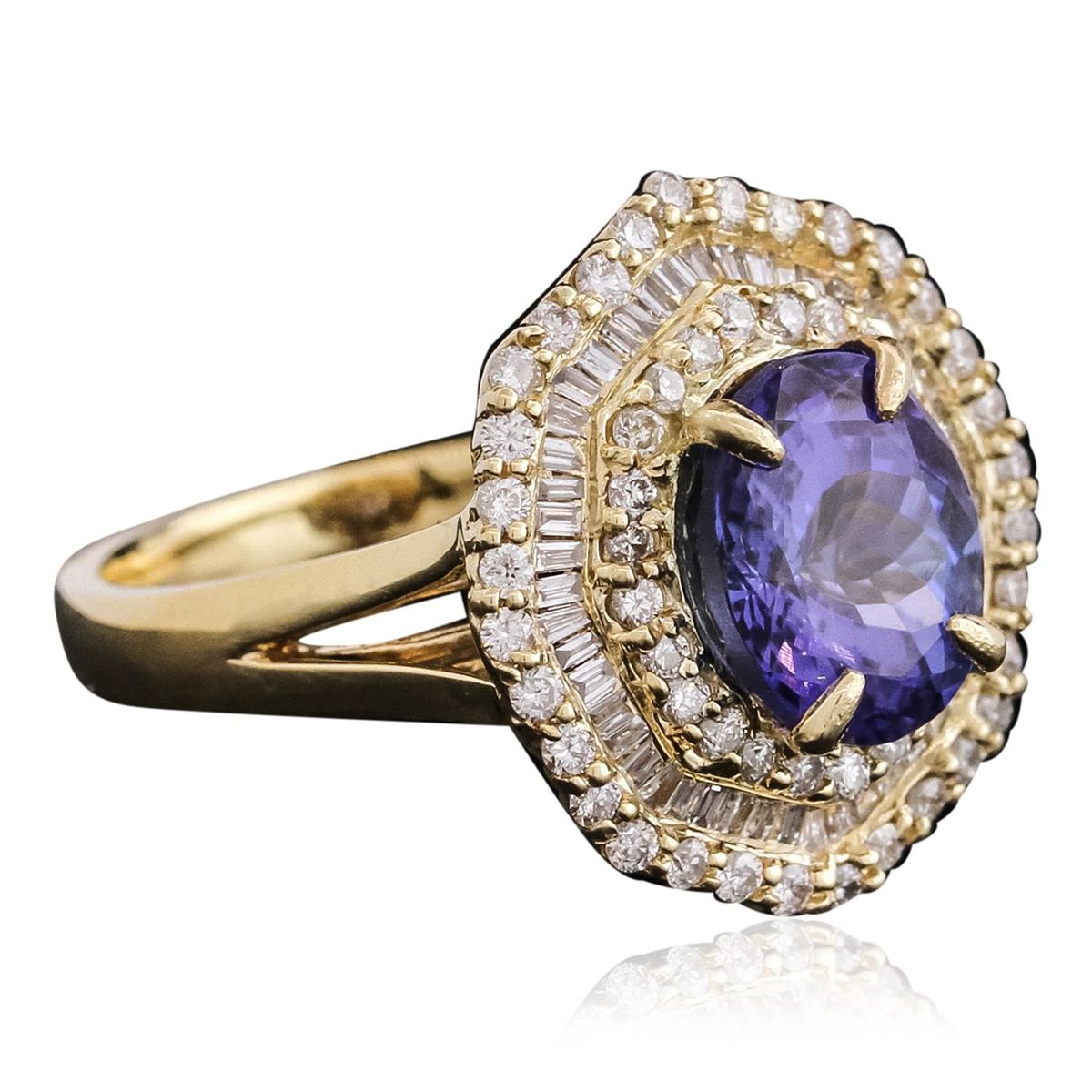One electronically tested 14KT yellow gold ladies combination cast & assembled tanzanite and diamond ring with a split shank with a bright polish finish. Identified with markings of "14K". Condition is new. Containing: One prong set oval modified brilliant cut natural tanzanite, measuring 9.71 x 8.03 x 5.20mm, approximate weight of 2.74ct., clarity is eye clean, type I, medium, moderately strong, bluish violet color, (GIA bV 5/4), cut is good. Fifty-Six prong set round brilliant cut diamonds, measuring 1.20 - 1.20 x 0.72mm (depth est.) approximate total weight of 56 Stones = 0.35ct. Clarity: I-1 to I-2. Color: I - J, Cut is Good. Forty-Eight channel set baguette cut diamonds, measuring 1.50 x 1.00 x 0.85mm (depth est.) approximate total weight of 48 Stones = 0.56ct. Clarity: SI-2. Color: J - K, Cut is Good. Colored gemstones are presumed to have been subjected to commonly used enhancement processes. All diamonds and colored gemstones are graded in the mounting, unless otherwise stated total weight of Colored Stones 2.74ct. Total Weight of Diamonds 0.91ct. Total Weight of Ring 5.70 grams. GGL Appraised at $8,330.00.