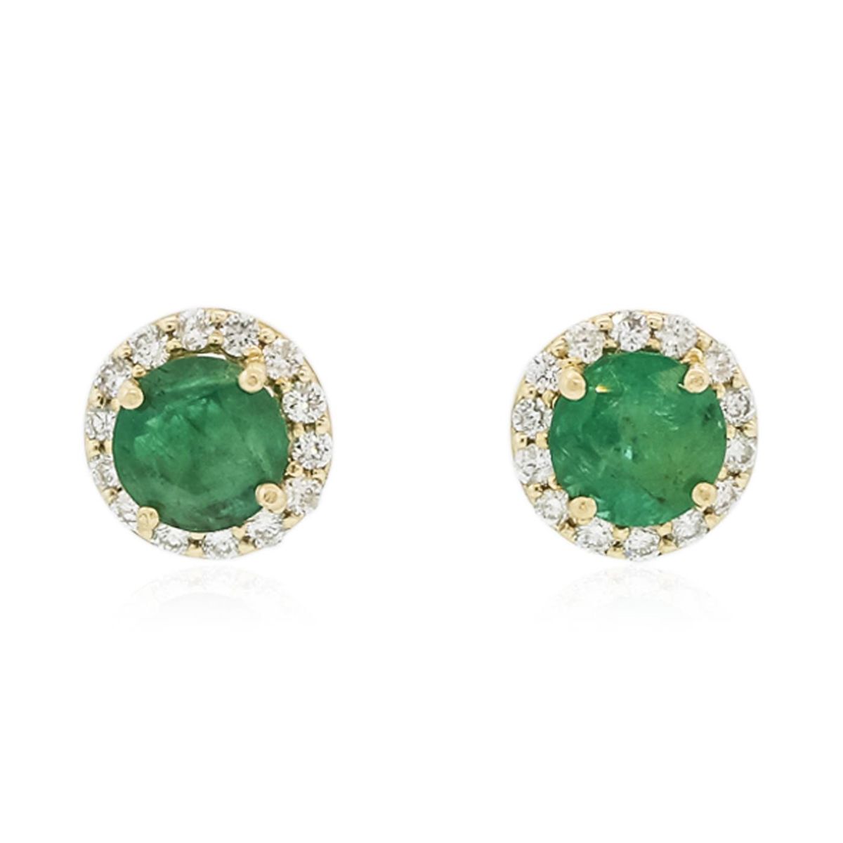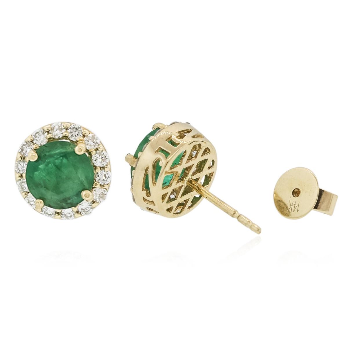 One pair electronically tested 14KT yellow gold ladies combination cast & assembled stud earrings with friction posts with a bright polish finish. Identified with markings of "14K". Condition is new. Containing: Two prong set round modified brilliant cut natural emeralds, measuring 7.32 - 7.30 x 4.75 mm, approximate total weight of 2.76ct., clarity is heavily included, type III, medium, moderately strong, green color, (GIA G 5/4), cut is good. Twenty-Eight prong set round brilliant cut diamonds, measuring 1.70 - 1.70 x 1.02mm (depth est.) approximate total weight of 28 Stones = 0.50ct. Clarity: SI-2 to I-1. Color: I - J, Cut is Good. Colored gemstones are presumed to have been subjected to commonly used enhancement processes. All diamonds and colored gemstones are graded in the mounting, unless otherwise stated. Total Weight of Colored Stones 2.76ct. Total Weight of Diamonds 0.50ct. Total Weight of Earrings 3.40 grams. GGL Appraised at $4,435.00.